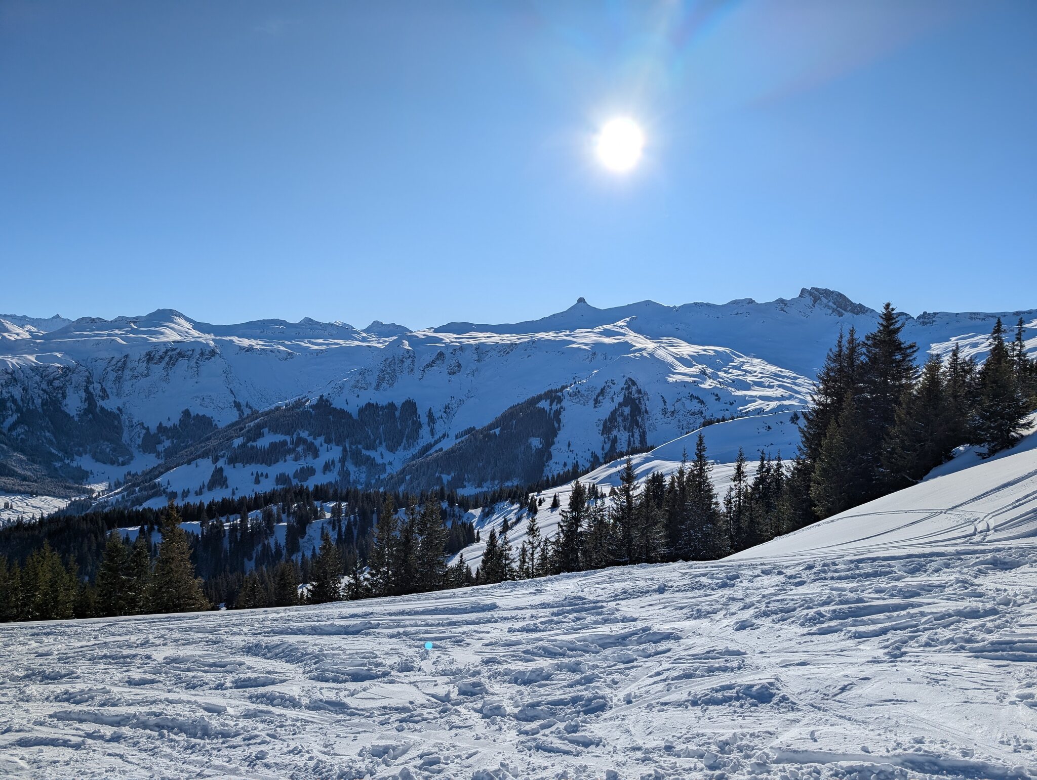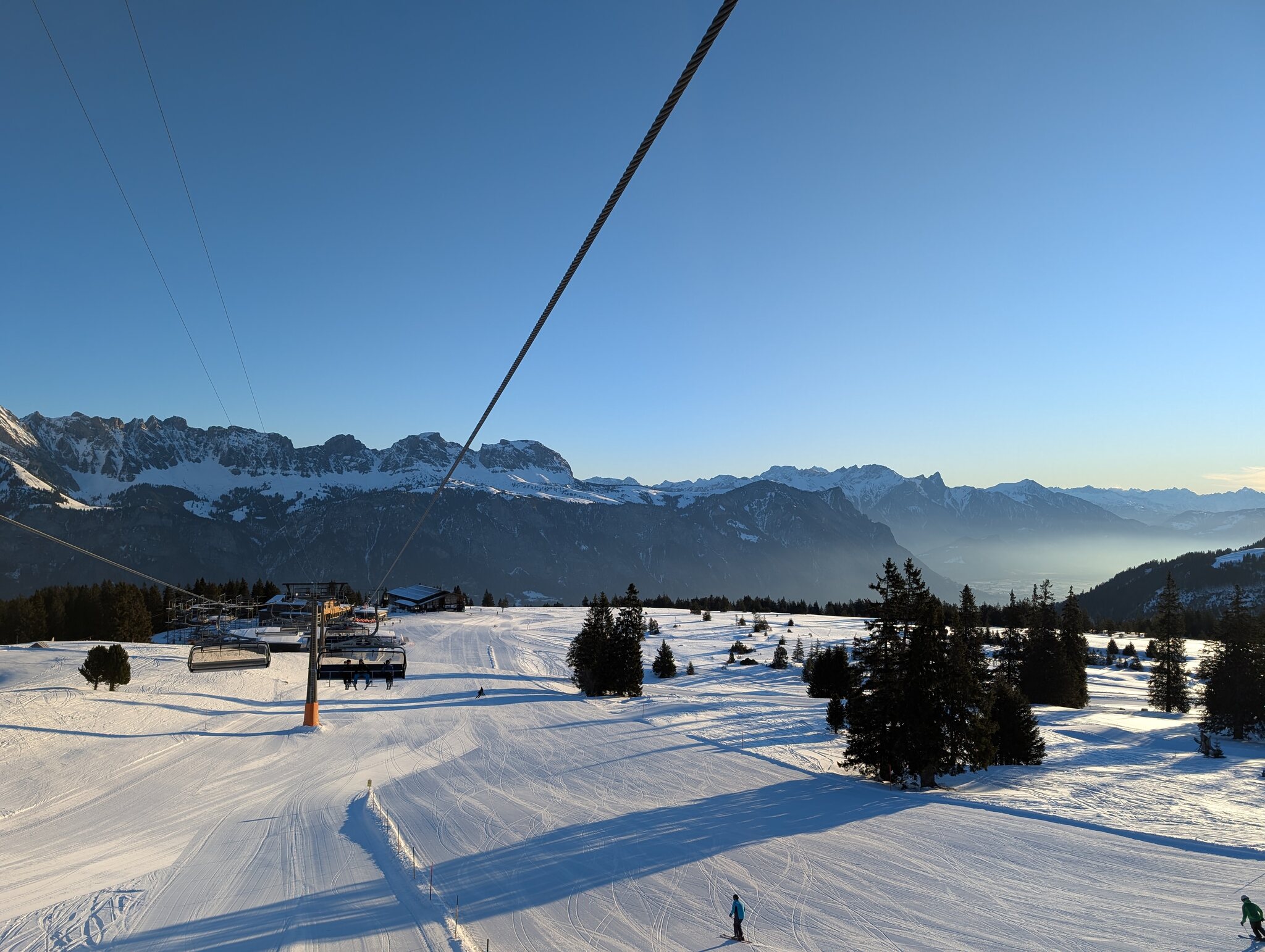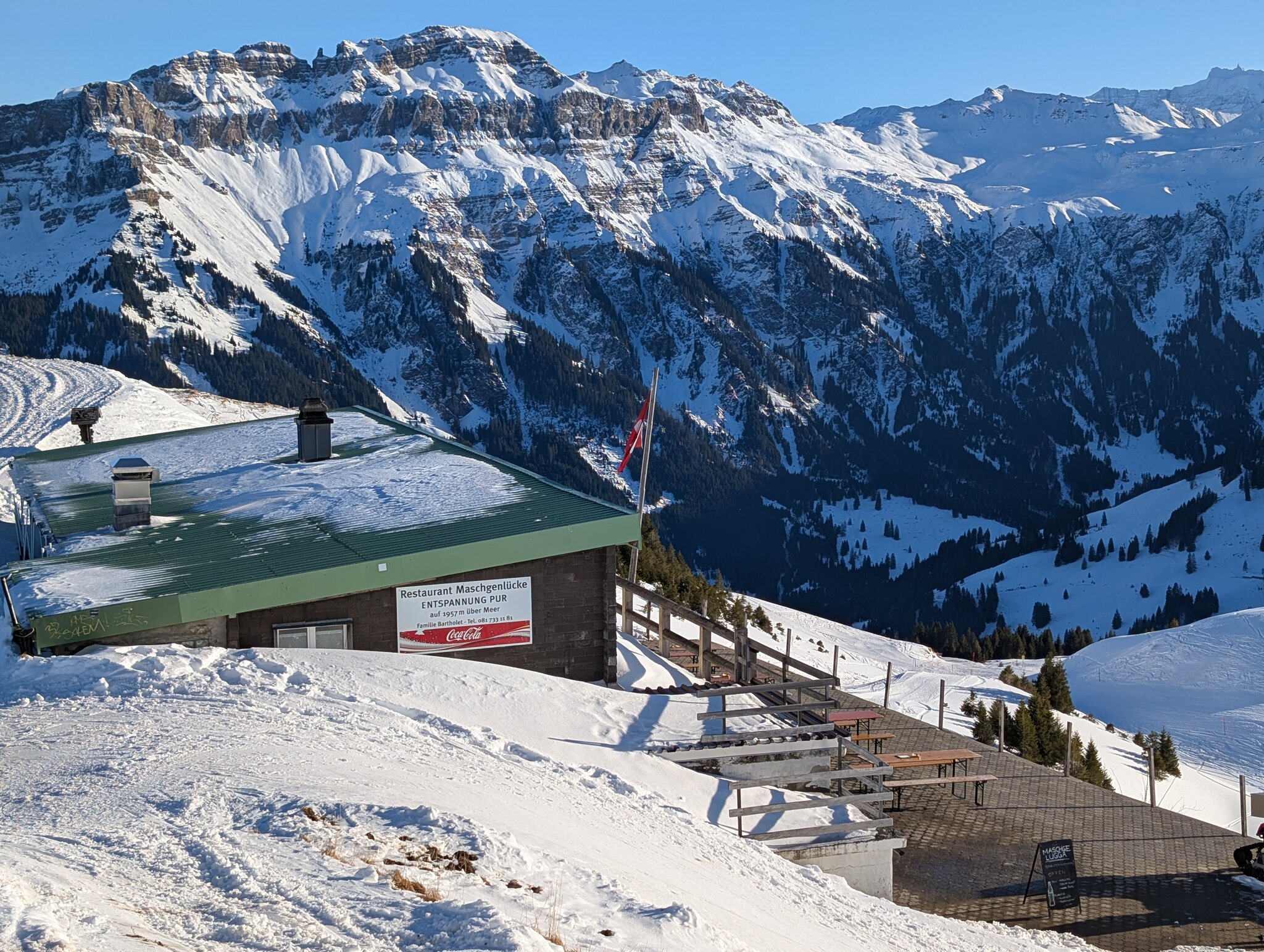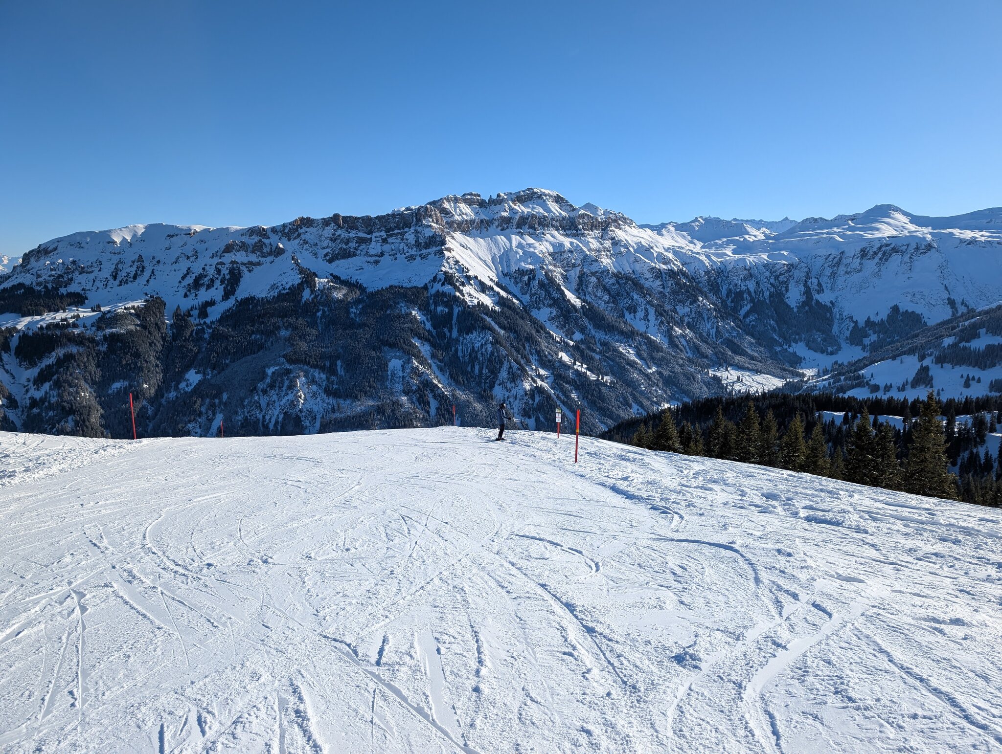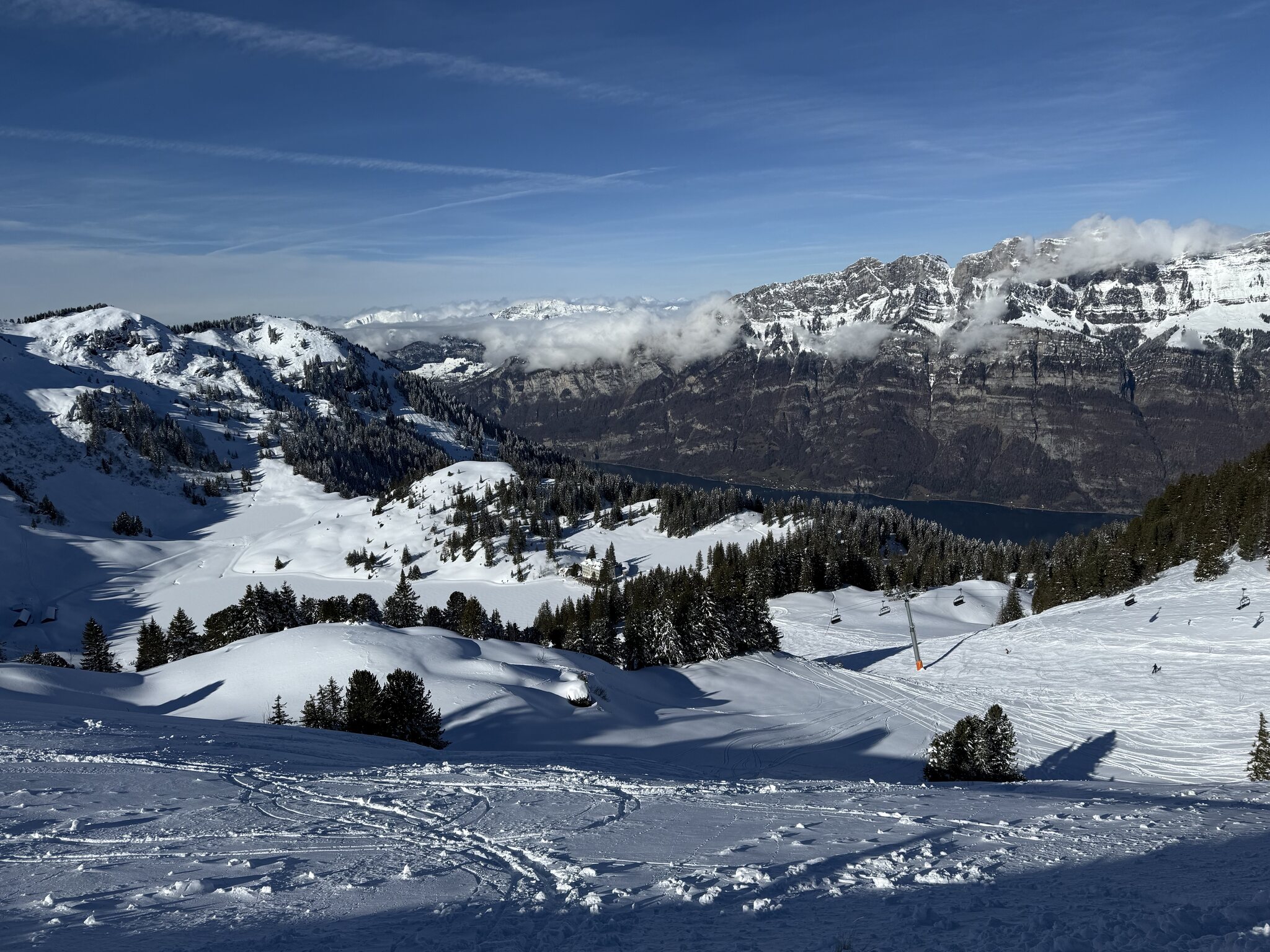 Dank kürzlichem Schneefall ist schon vieles offen, und die Pisten waren heute grösstenteils gut, zum Teil etwas weich.