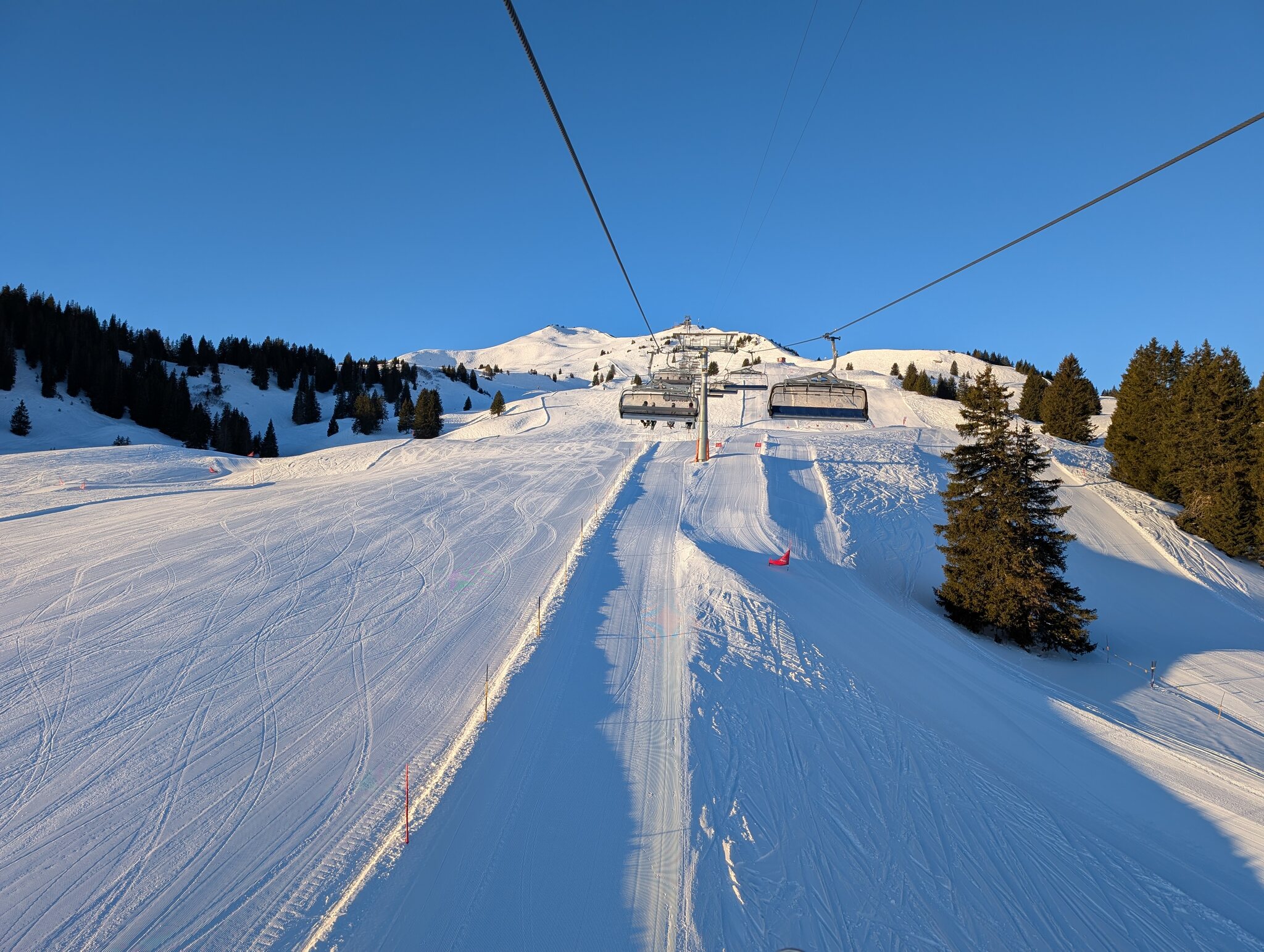 Die Schlange nimmt mit der Zeit immer mehr ab,am Schluss müssen wir gar nicht mehr anstehen. Die Piste leidet mit der Zeit schon etwas mit ein paar eisigen Stellen, aber ganz gut zu fahren.