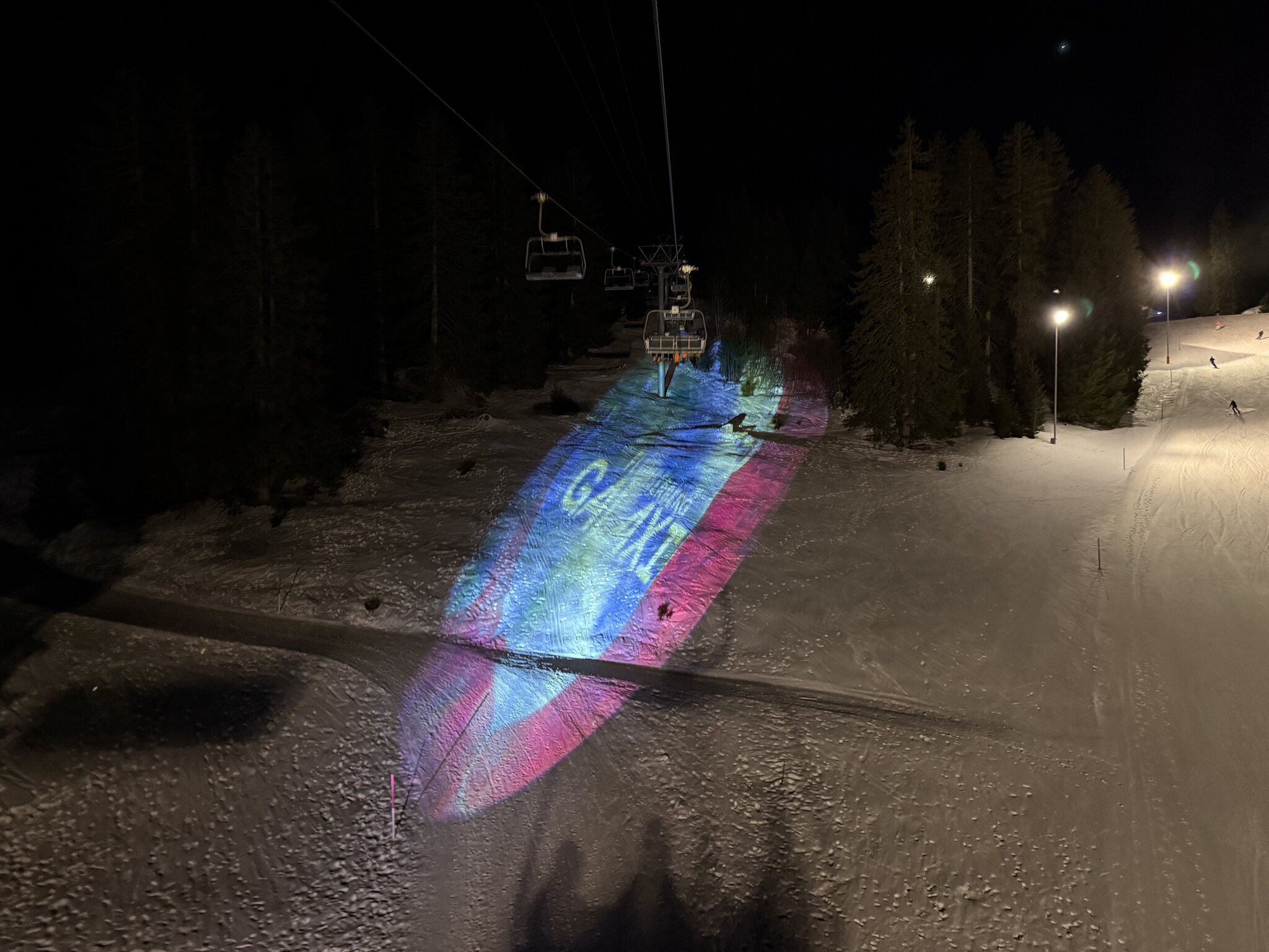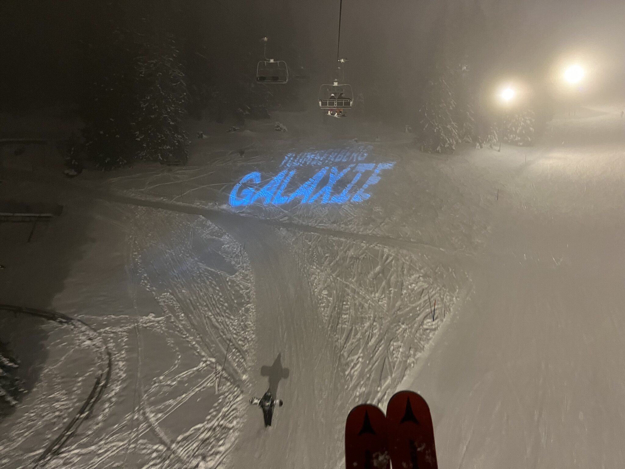Nachtski auf Flumserberg, mit Galaxie Thematisierung. Die Idee mit dem Lichtspiel ist gelungen, sehr hübsch anzusehen. Geniale Idee.