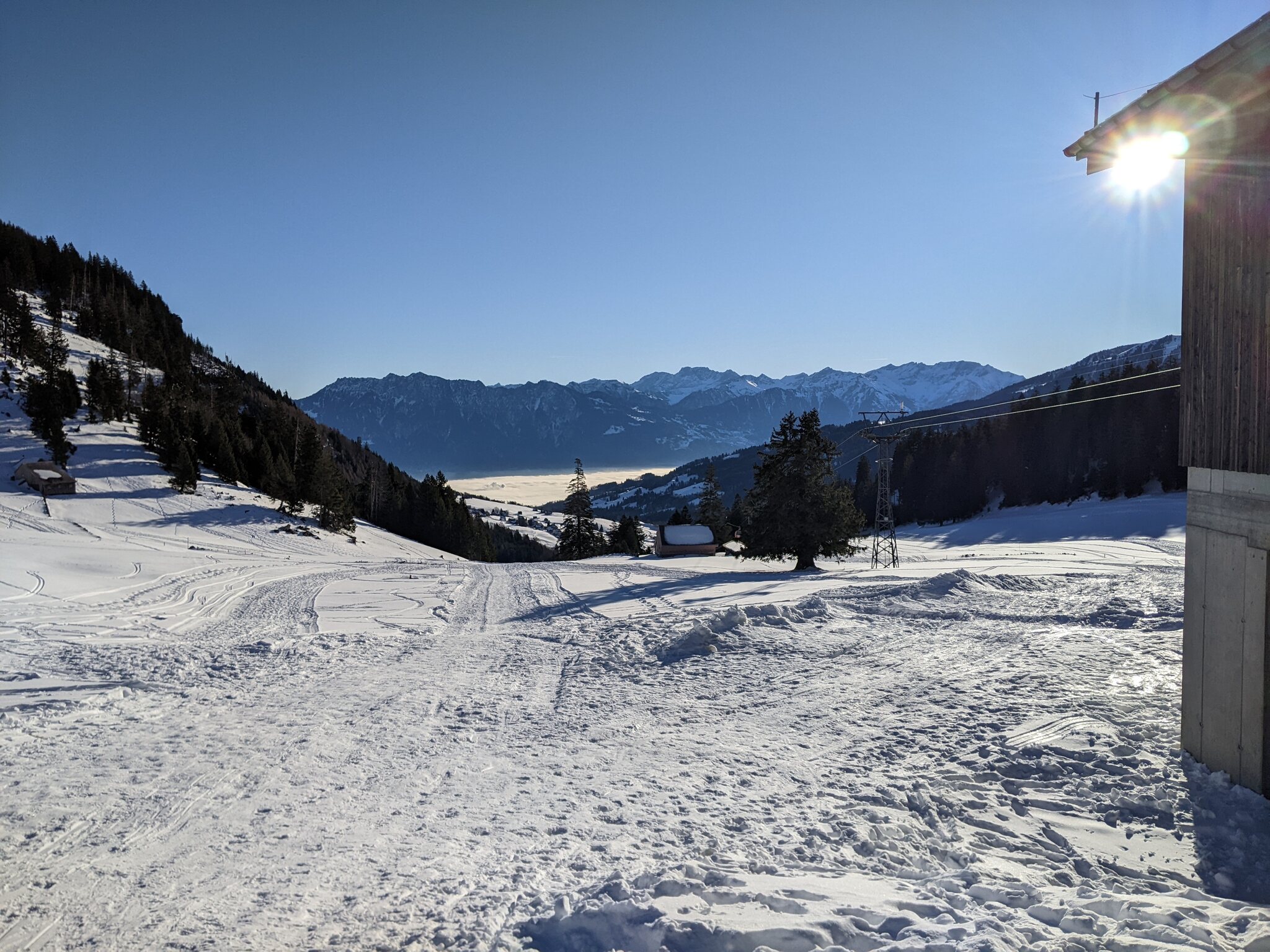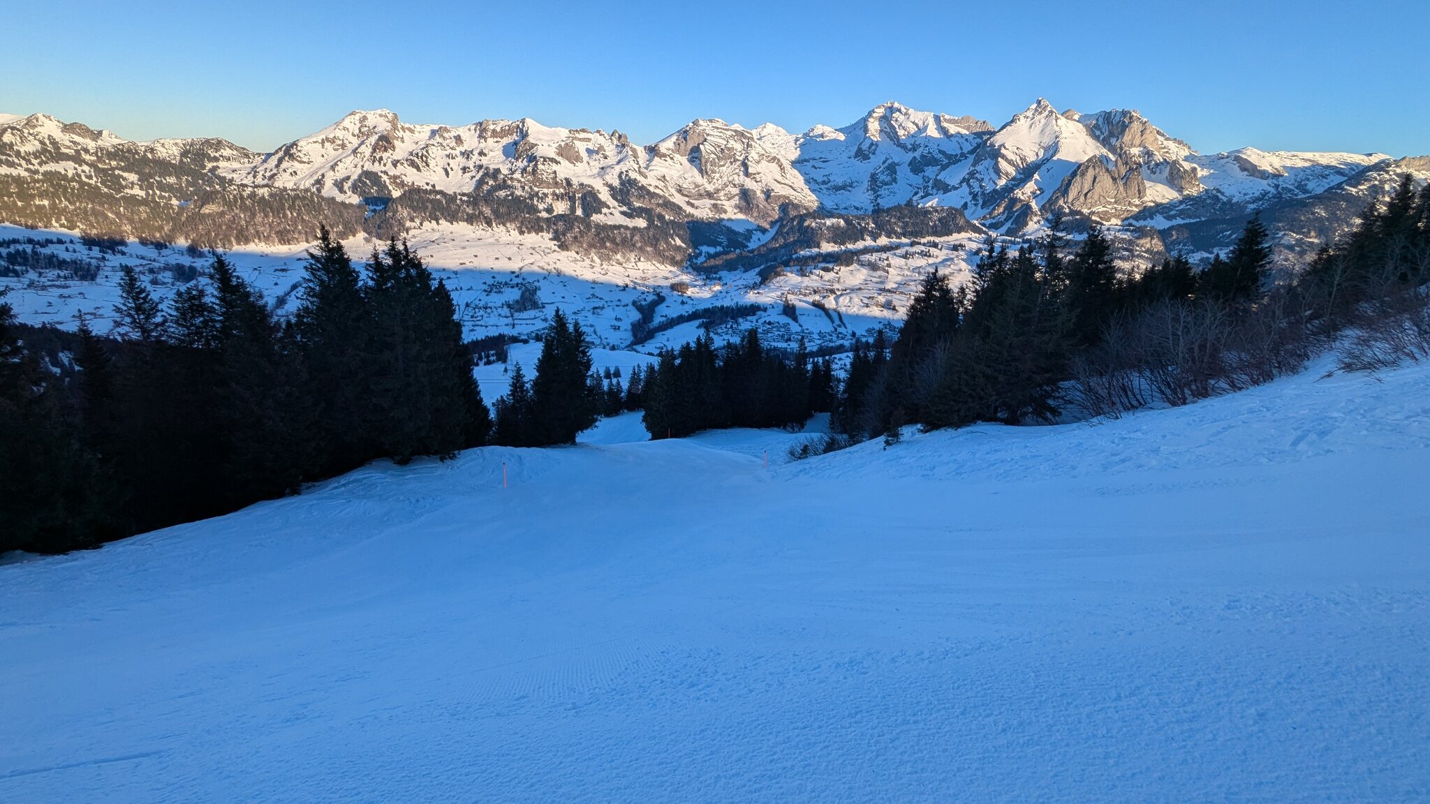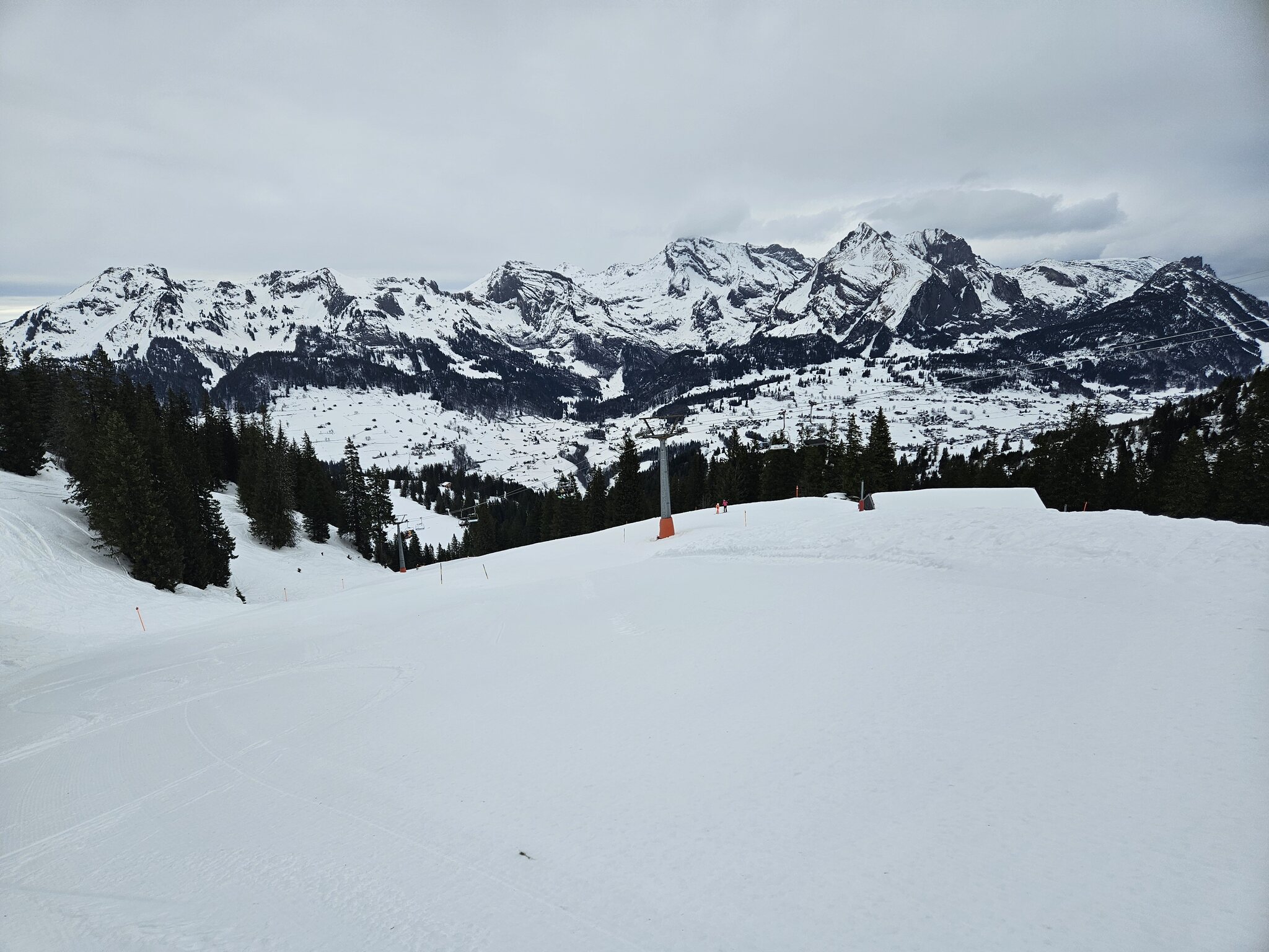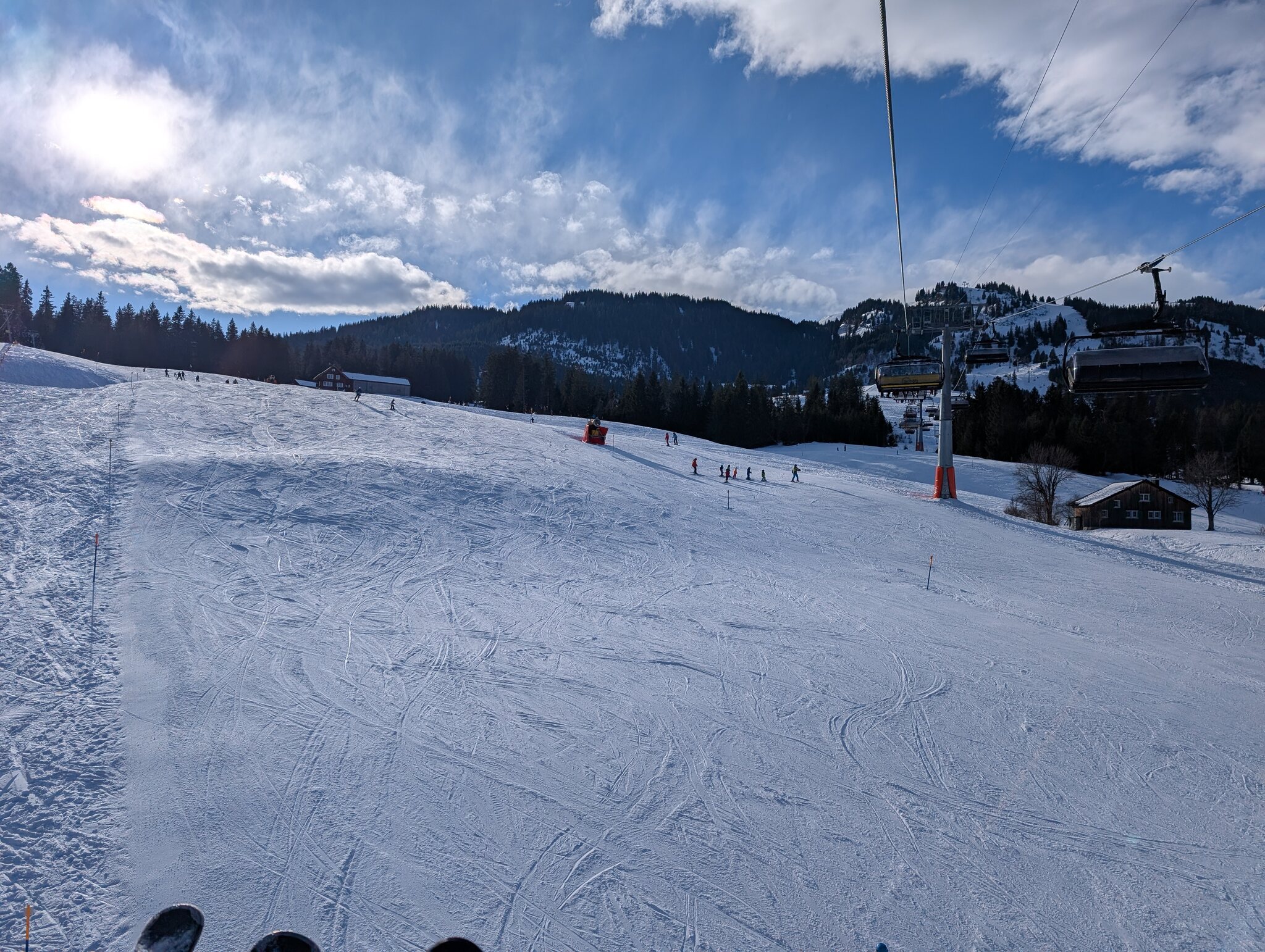 Die Ostabfahrt war wirklich landschaftlich super schön, aber man kommt dem leider getrennten Skigebiet Wildhaus ziemlich nah, ohne es erreichen zu können. Unten dann sehr wenig Schnee und es ragen Hölzer durch die Piste, was im Vergleich zu Steinen aber ganz entspannt ist.