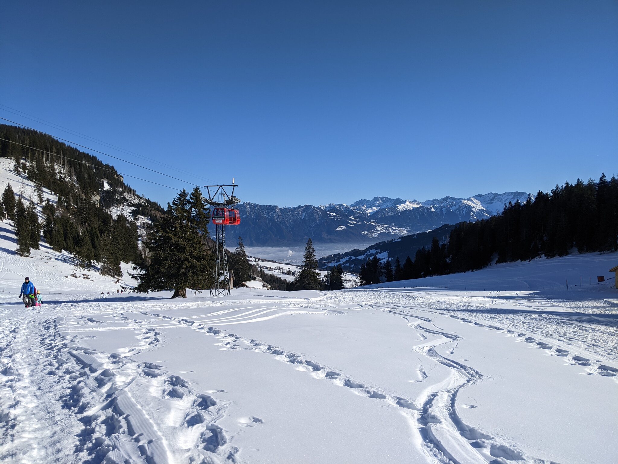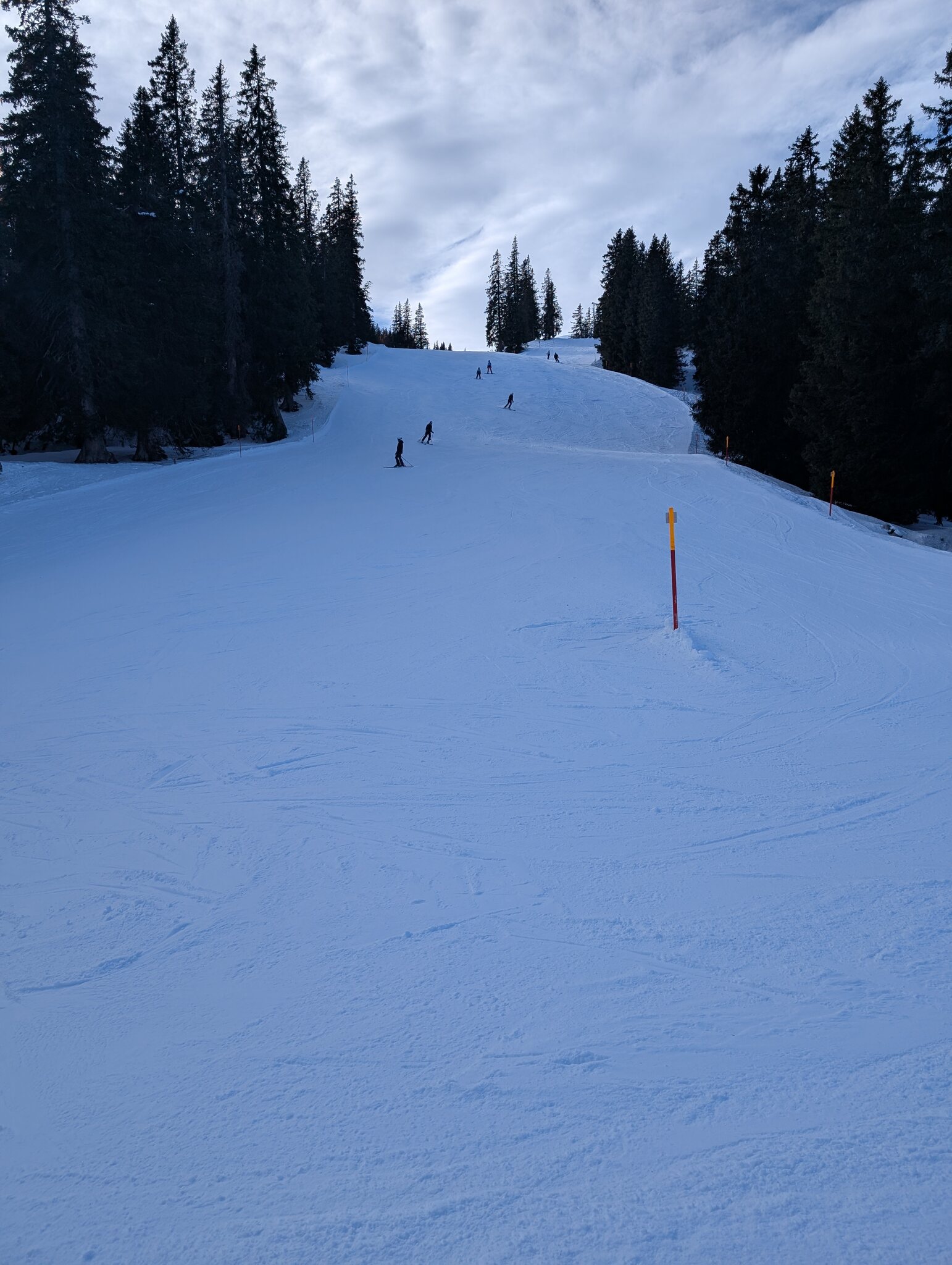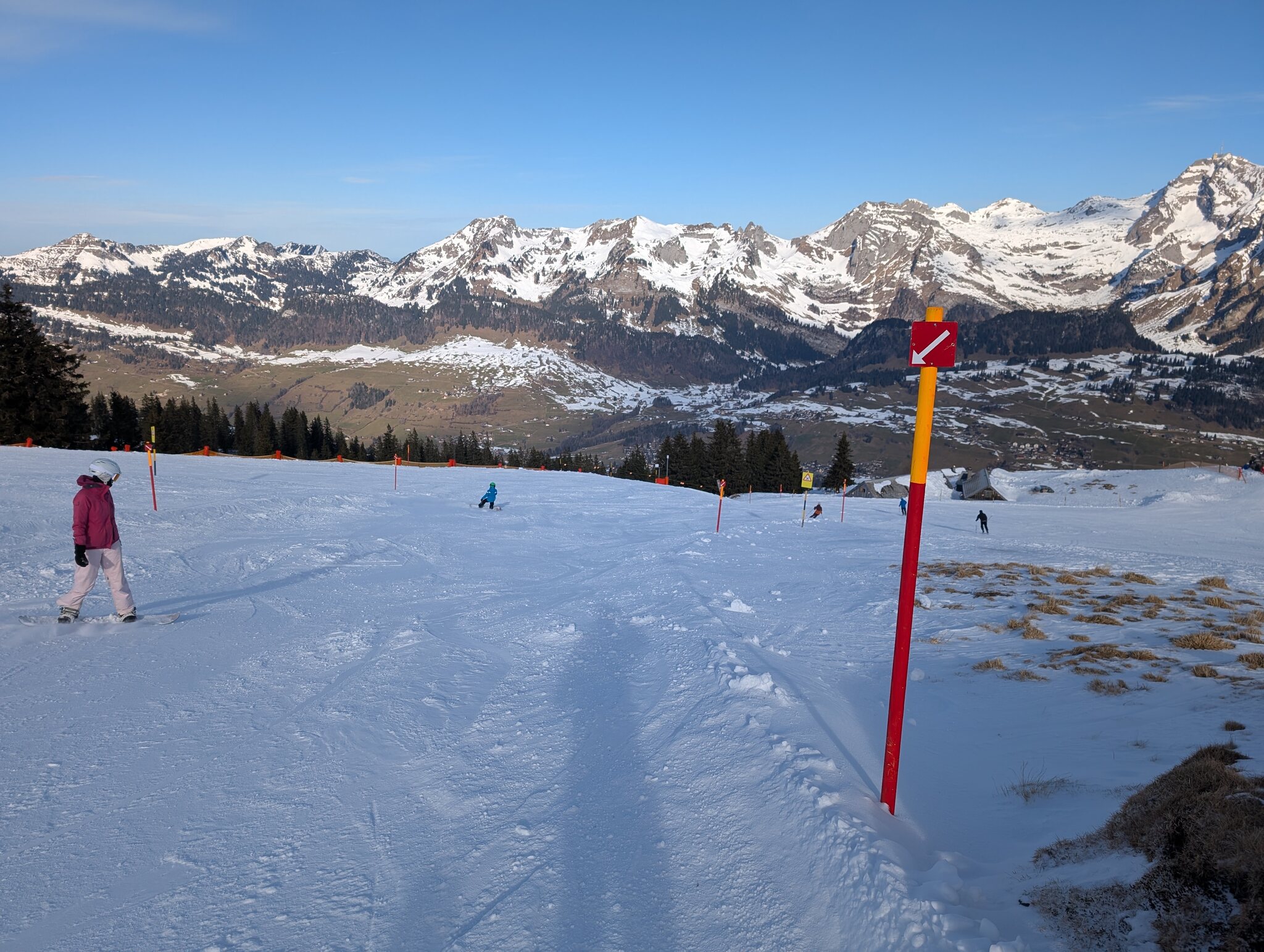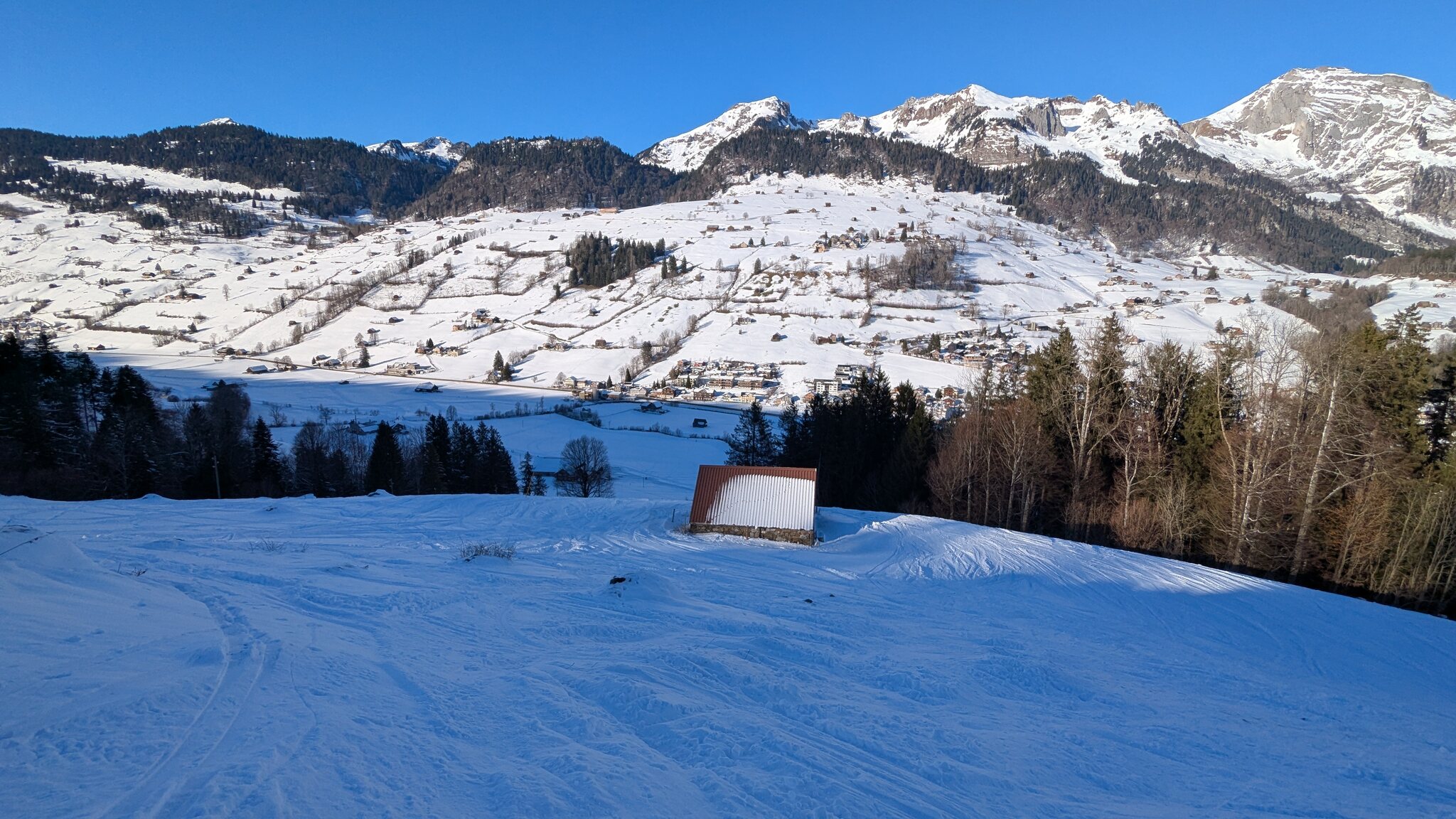 Die Ostabfahrt war wirklich landschaftlich super schön, aber man kommt dem leider getrennten Skigebiet Wildhaus ziemlich nah, ohne es erreichen zu können. Unten dann sehr wenig Schnee und es ragen Hölzer durch die Piste, was im Vergleich zu Steinen aber ganz entspannt ist.