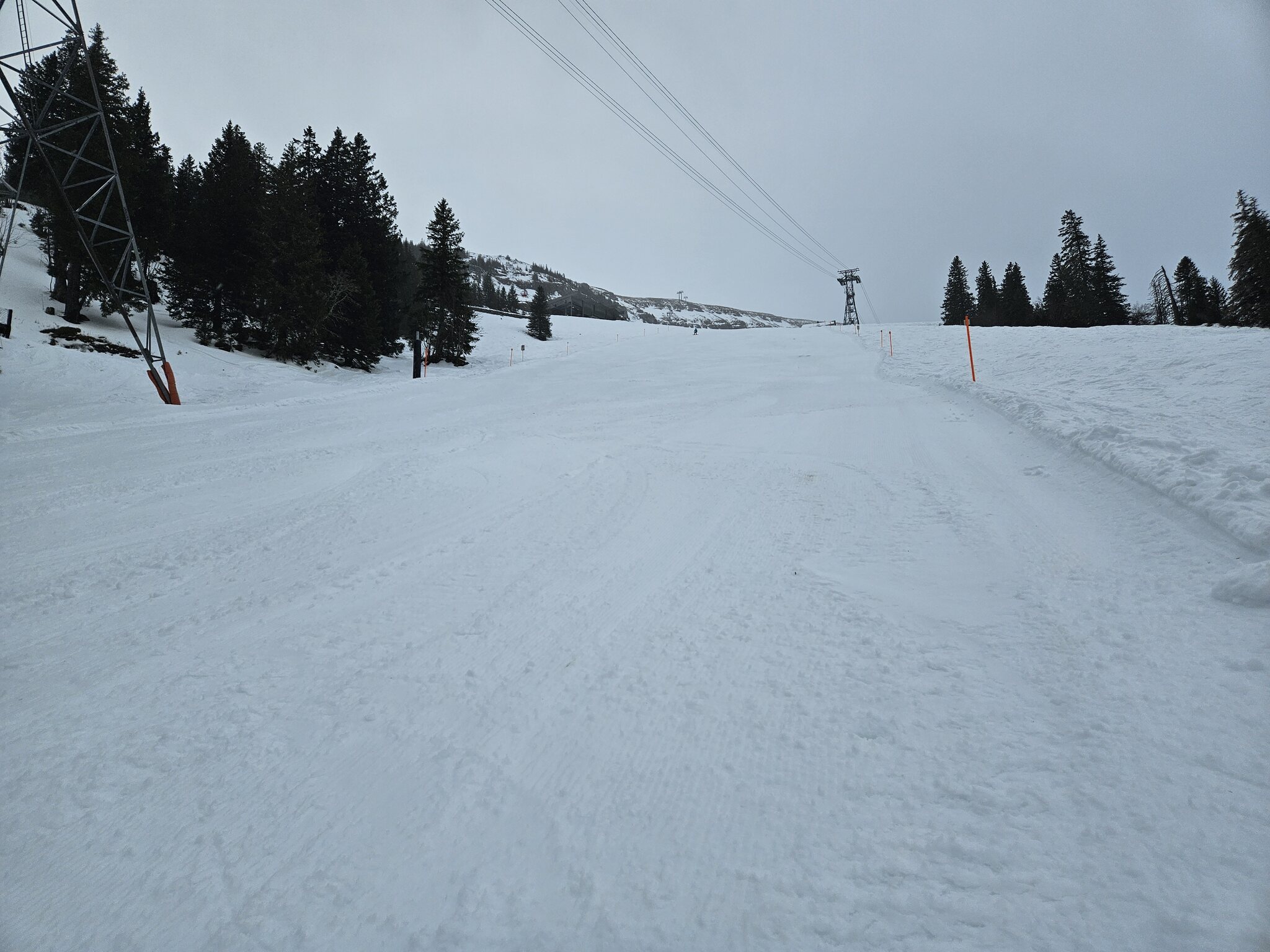 Weil es wirklich nicht so toll zu fahren ist, und ich zeitig heim wollte, ging's nach 2 SL Fahrten bereits wieder auf die Talabfahrt, die markiert aber geschlossen ist, aber gemäss meiner Anfrage heute morgen bei den Bergbahnen fahrbar ist.