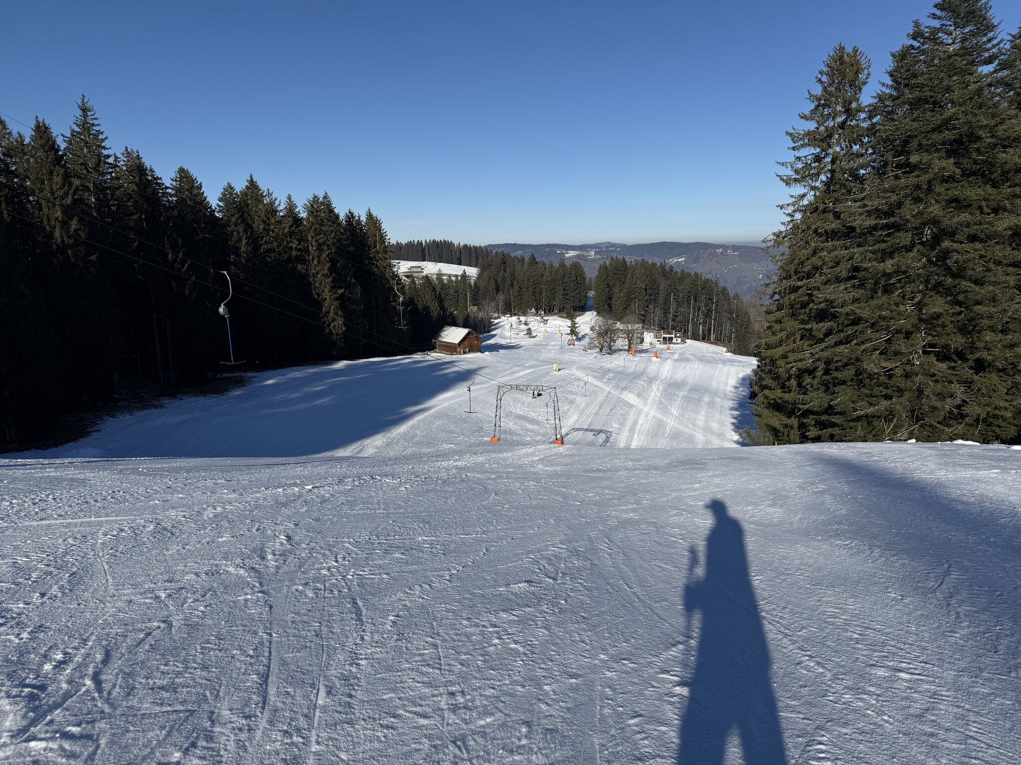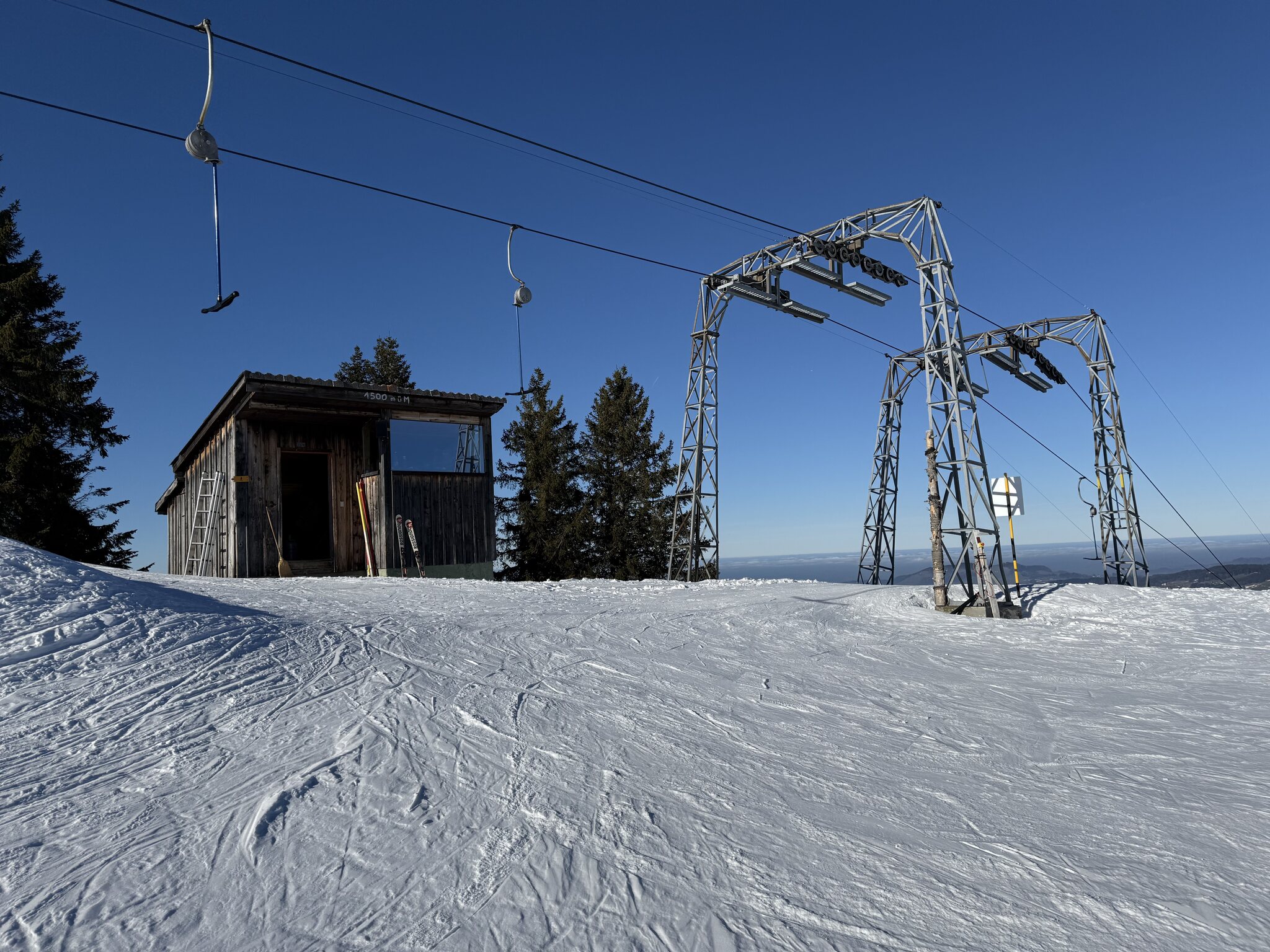 Die Fahrt mit der 2SB dauert ewig lange. Oben angekommen, gibt es zum Glück einen Seillift, um fast ohne anzugeben zum Skilift zu kommen. Seillift und Blick zurück zur Bergstation des Sessels. Talstation Skilift: Es liegt insgesamt viel weniger Schnee als einige Kilometer südlich. Eine Schneemaschine abseits der geöffneten Piste ist in unermüdlichem Einsatz: Der Schlepplift fährt meinem Gefühl nach elend langsam, oben angekommen, ist der Angestellte wie der bei der Sesselbahn Bergstation am Telefon, eventuell telefonieren sie miteinander? Verständlich auch, denn die Skifahrer, die ich heute gesehen habe, kann ich an einer Hand abzählen: Die rote Piste, nicht frisch präpariert, aber ganz gut zu fahren: Ende rote Piste: Die schwarze Piste ist in einem schlimmen Zustand mit wenig Schnee und viel Eis.