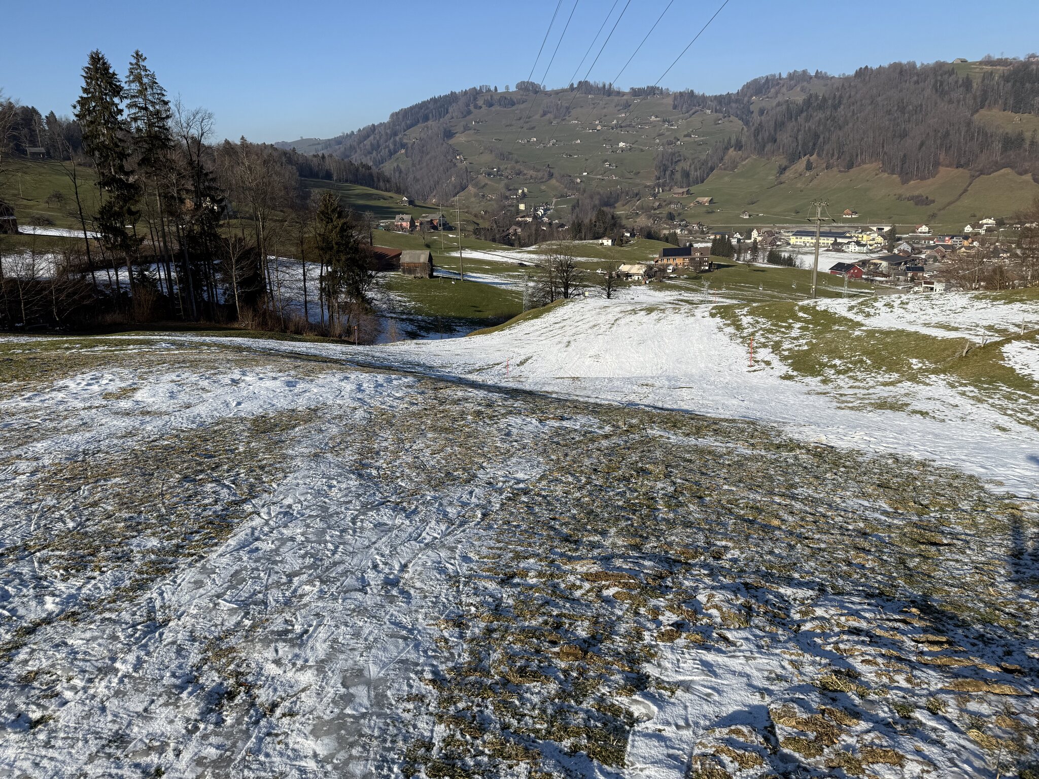 Der obere Teil geht noch ganz gut: Dann gibt's aber zwischendurch einige Gras-Stellen, die aber kein Problem sind, da alles gefroren ist: Der Schlusshang zur Talstation ist wieder komplett schneeeisbedeckt: Und der Weg zurück zum grossen Parkplatz geht auch per Ski. Ich musste meine Ski ein paar Mal abschnallen, aber es ging ziemlich gut.
