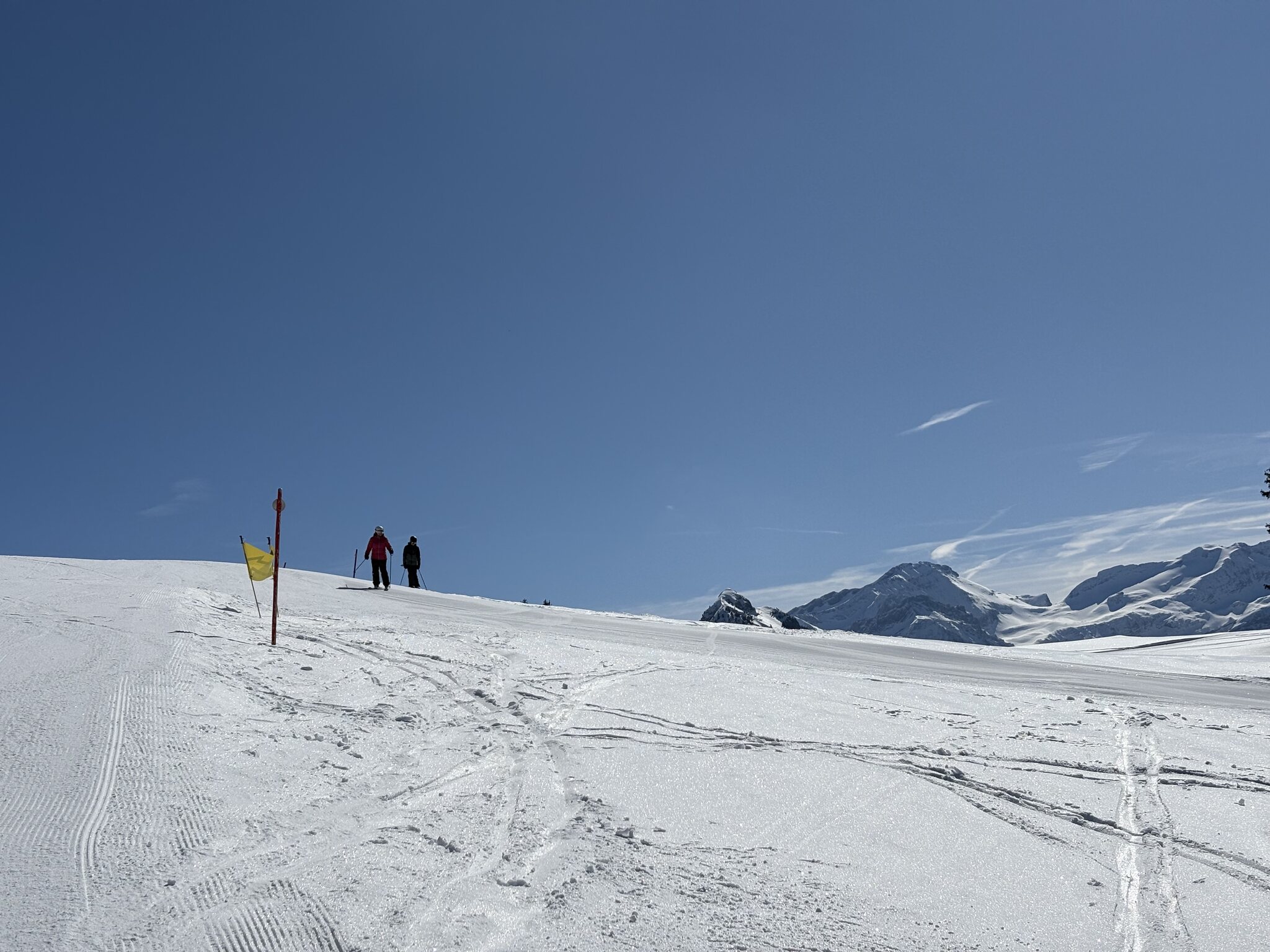 Aber nach dieser kleine Fehler haben wir einen wunderschönen Tag gehabt. Die Pisten ein bisschen hart. Und im Talbereich auch etwas sulzig. Aber einsgesamt voll OK. Und fast alles war offen. Ziemlich viel schlechte Skifahrer unterwegs. Abgesehen von Hornberg Sesselbahn, null anstehen.