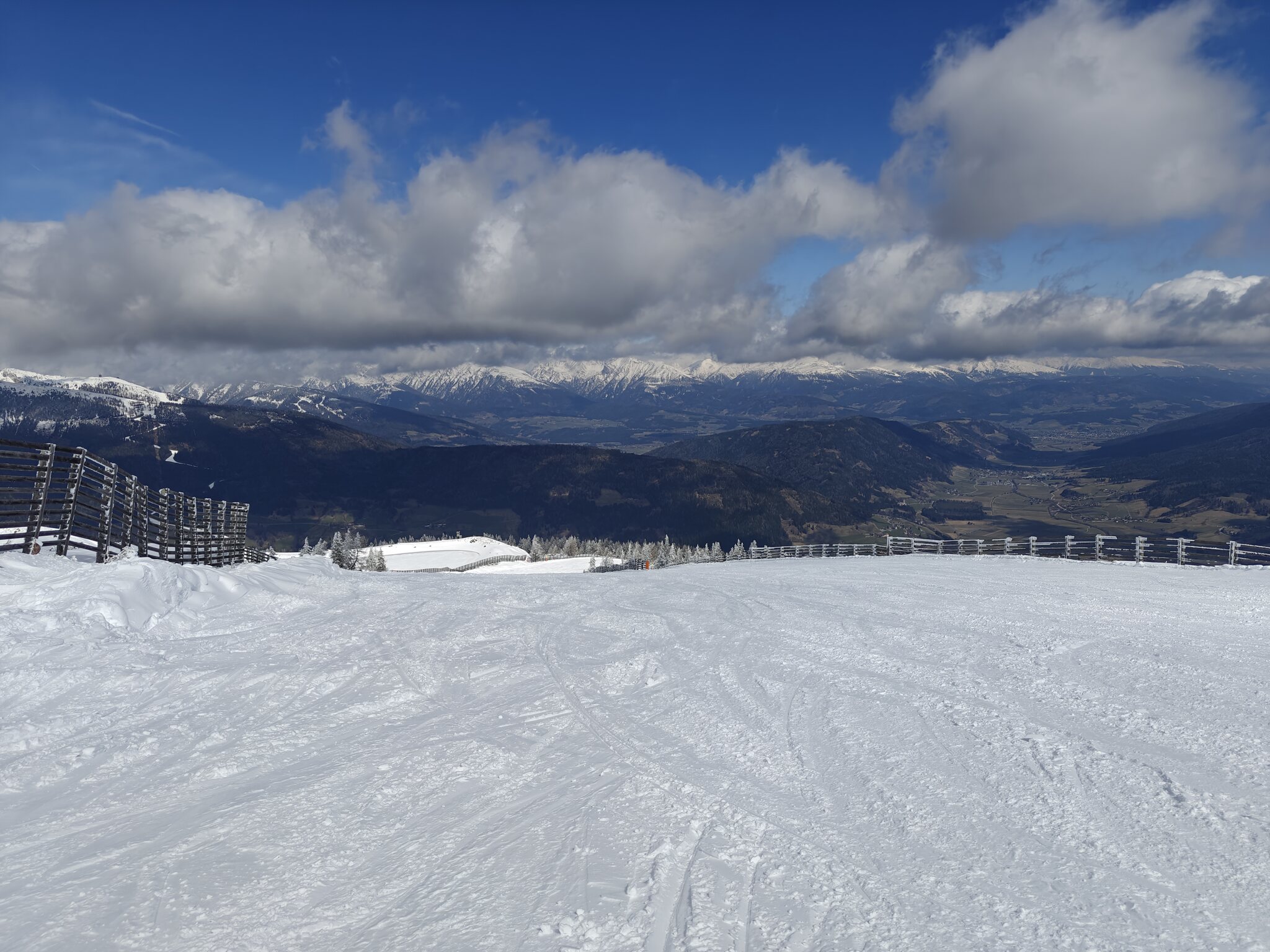 Seitenwechsel, also zuerst die Abfahrt auf der roten 11, inkl. Südblick. BTW, Aineck ist (neben dem benachbarten Speiereck) eines der wenigen Skigebiete, von dem man sowohl den Dachstein als auch den Trigav sehen kann: