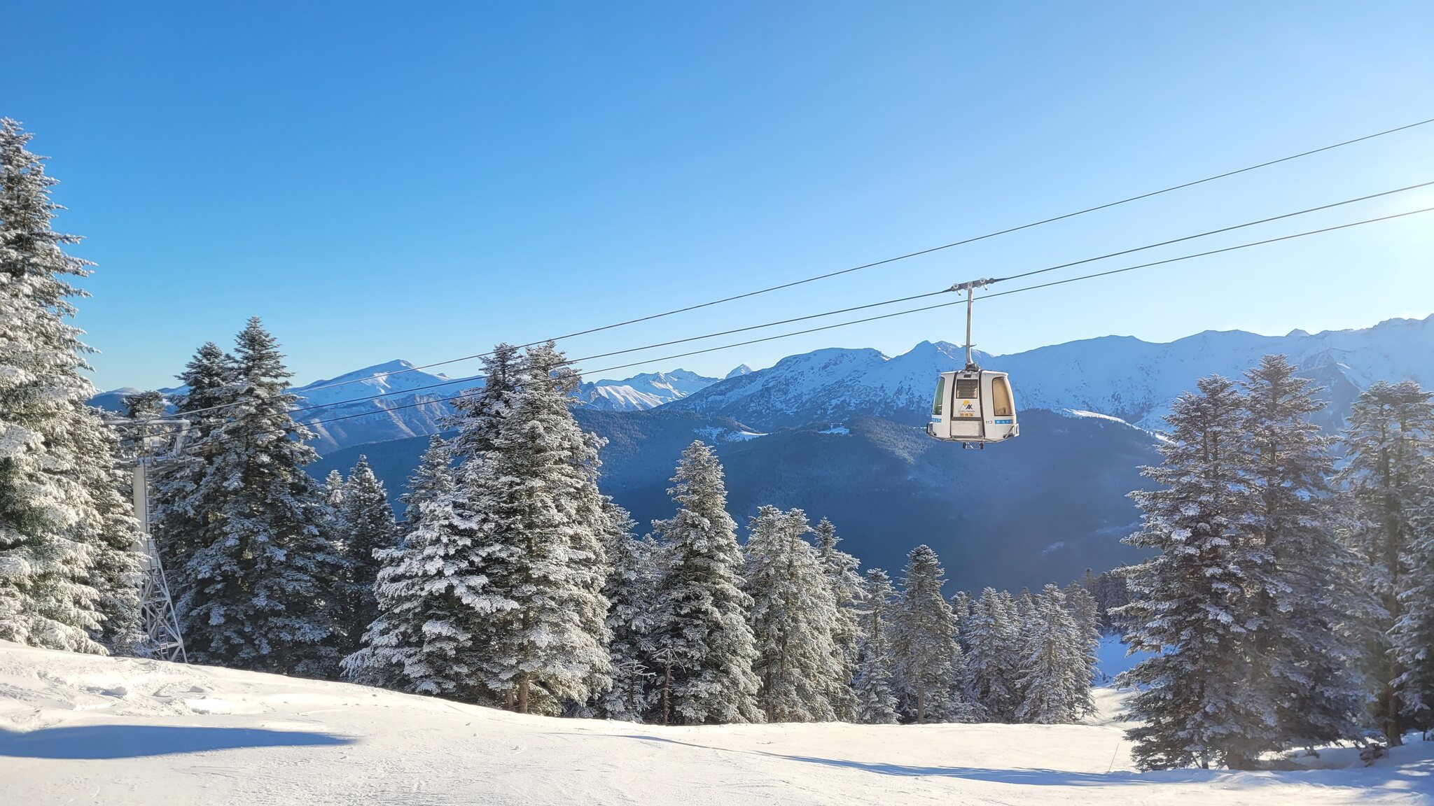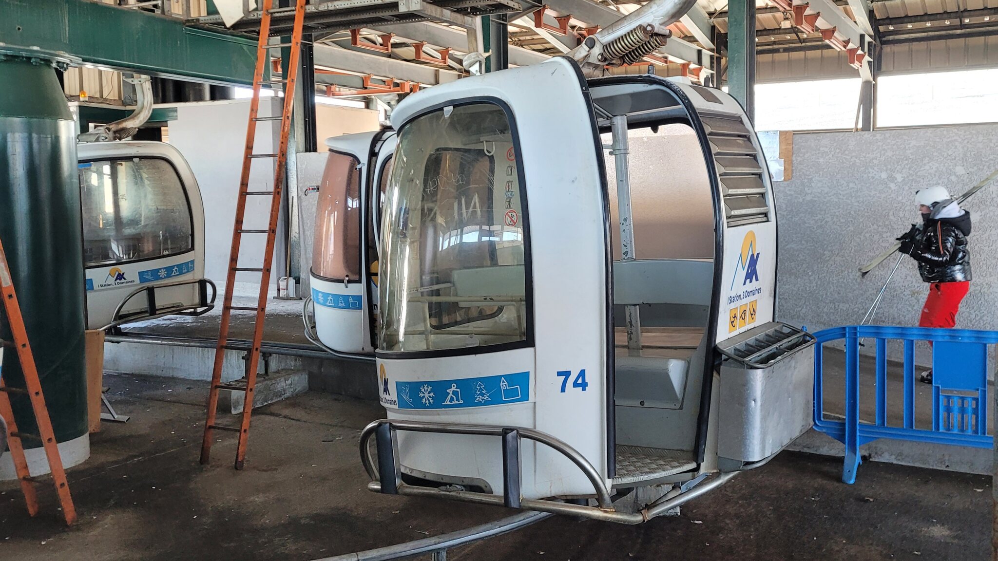 Gestern bei der Anreise hatte es auf einem Pass auf 1400m geschneit. Ax-les-Thermes liegt aber nur auf 700m, zum Skigebiet hoch führt eine Zubringerbahn aufs Plateau du Bonascre. Die Gondeln sehen etwas speziell aus, sind von Sigma. Am Einstieg macht die Gondel einen Stopp.