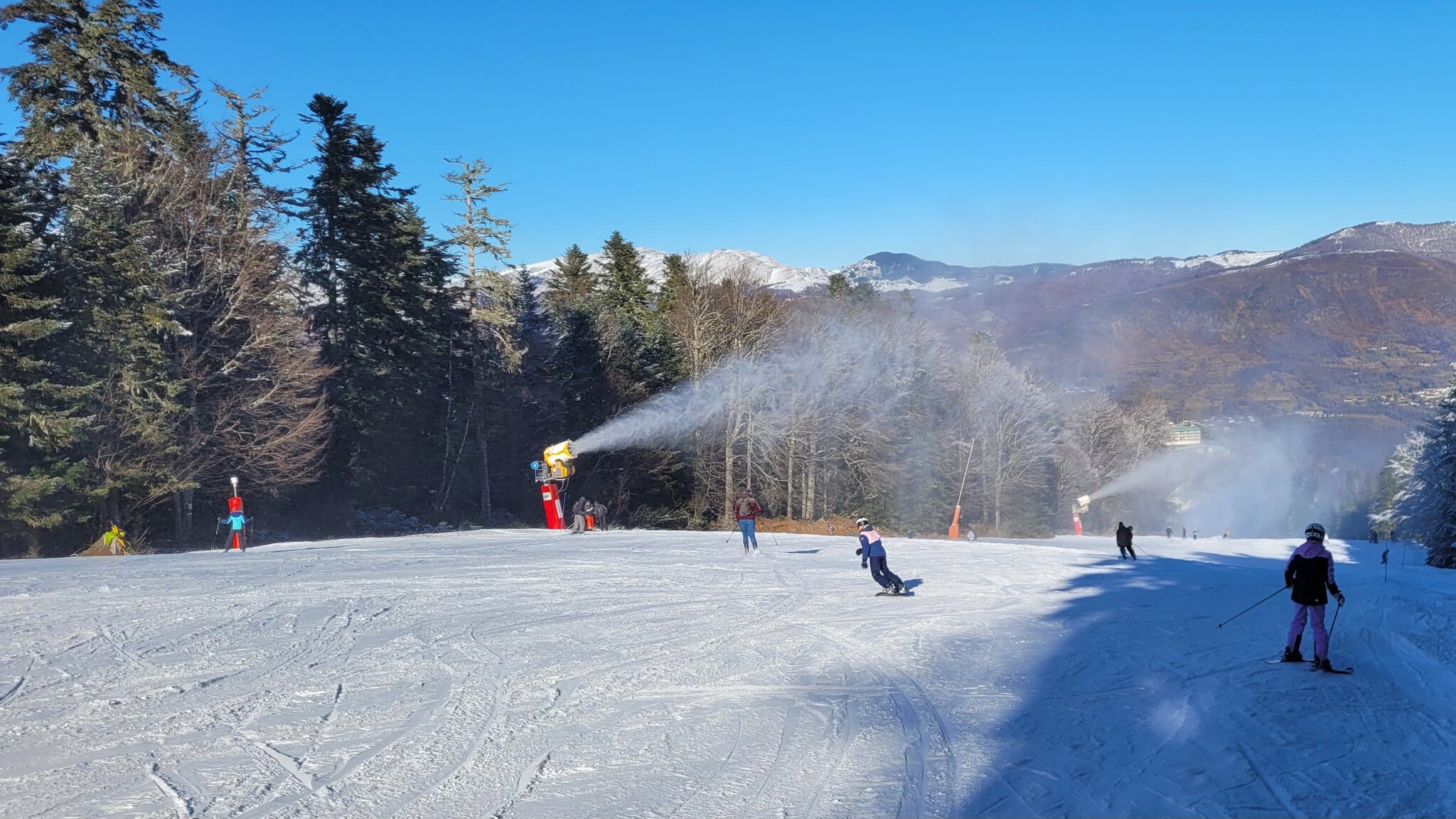 Die Zubringerbahn erinnert mich etwas an Luchon-Superbagnères, das Skigebiet ist auch von der Grösse her ähnlich. Allerdings mit besserer Beschneiung, Steine habe ich heute kaum gesehen.