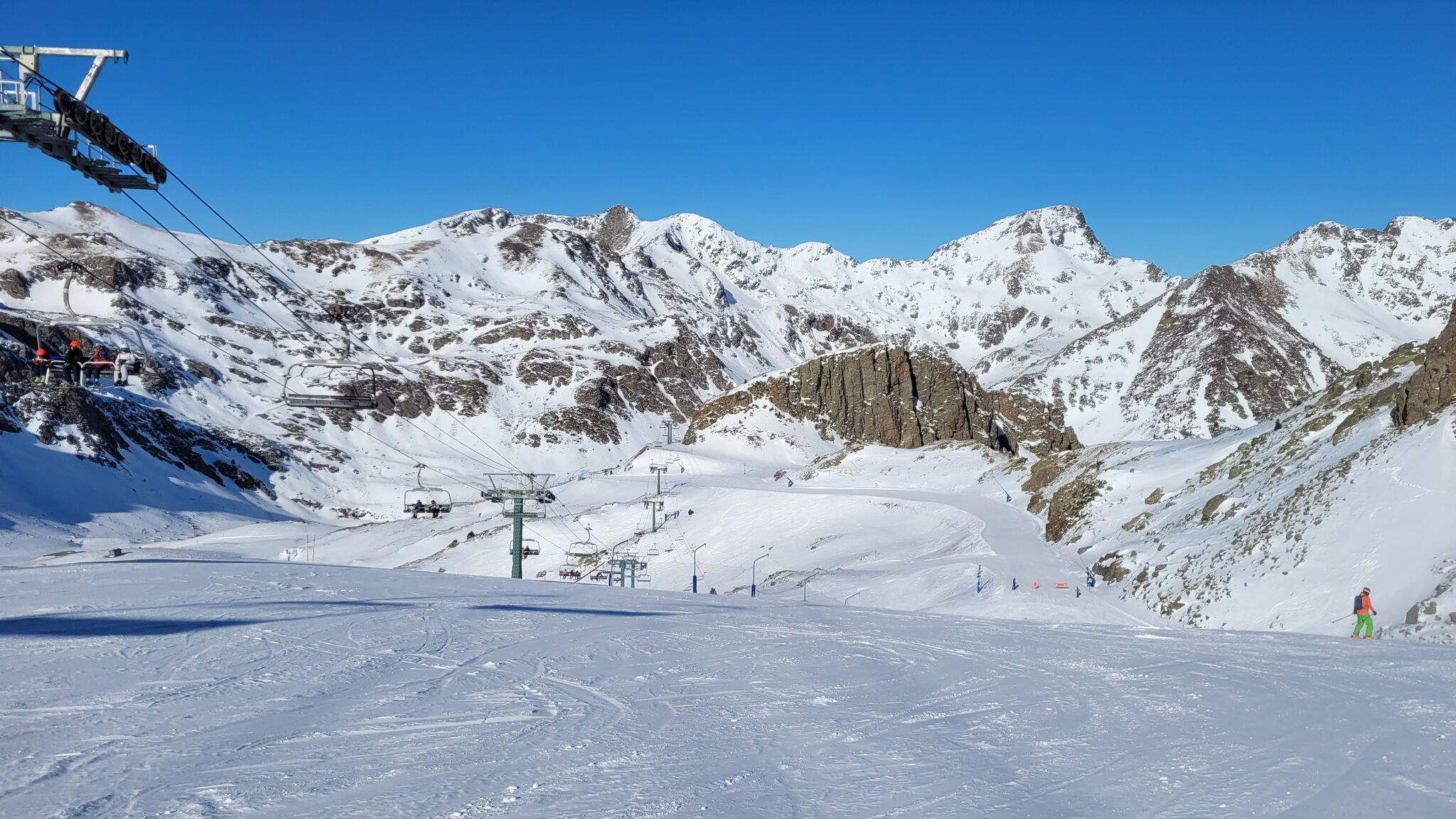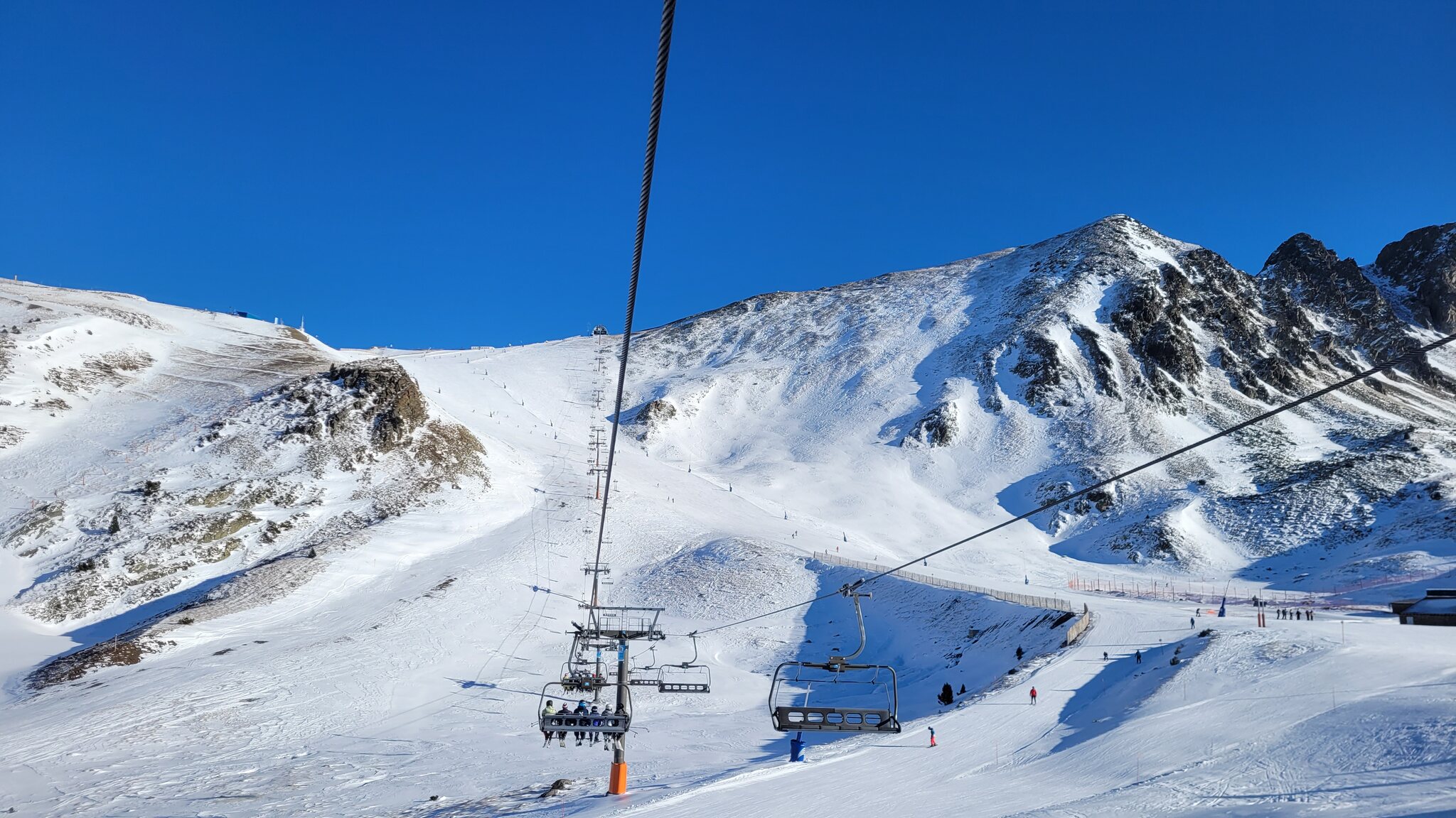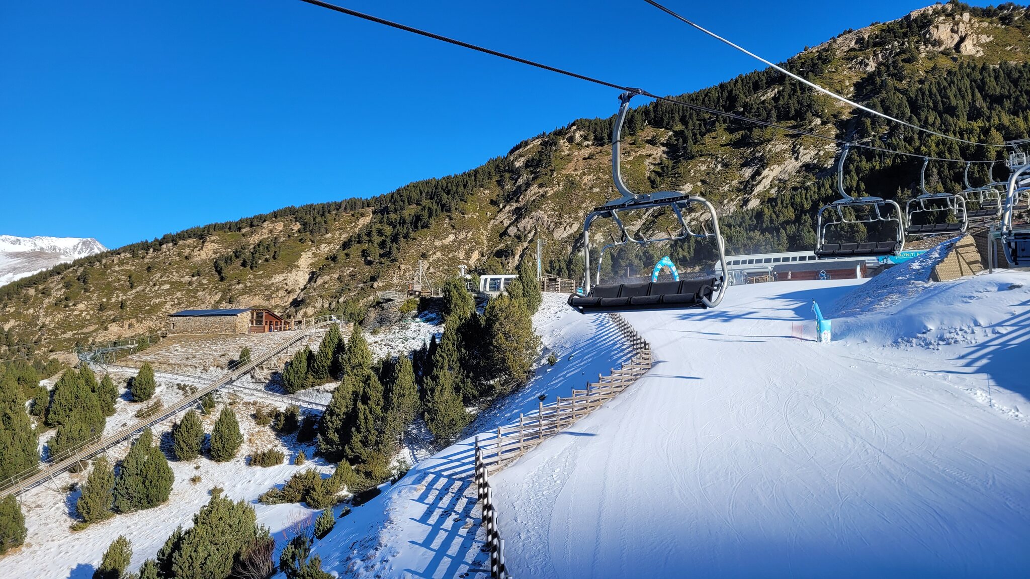An der EUB in Soldeu gab es zu Betriebsbeginn 9h einen ziemlichen Rückstau, bin daher zur parallel verlaufenden KSB gegangen. Dort war niemand und als ich oben war, sind noch leere Kabinen an der EUB gekommen. Damit war ich dann auch der erste an der Solana KSB.