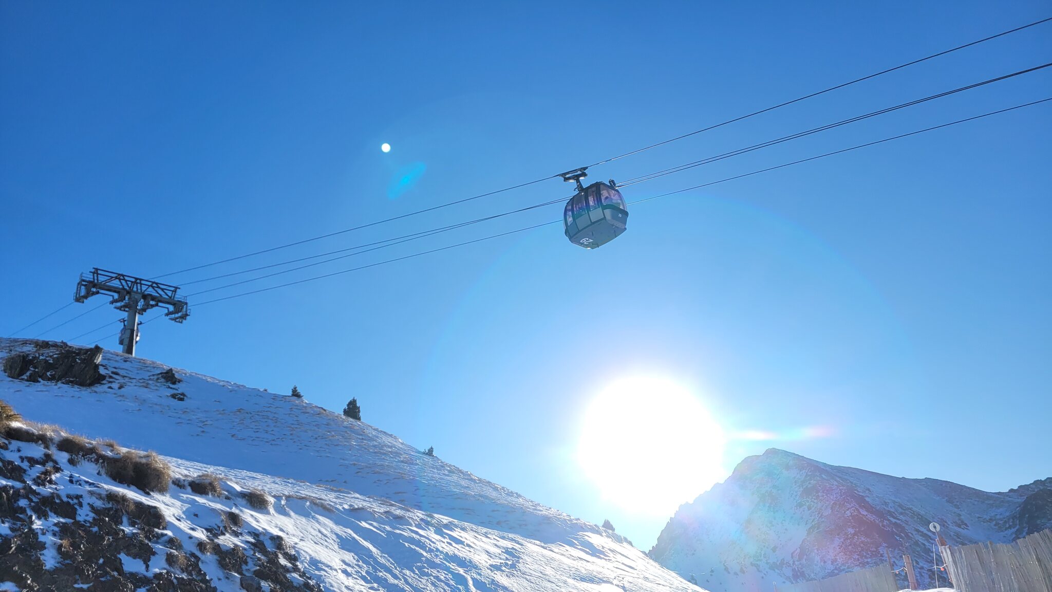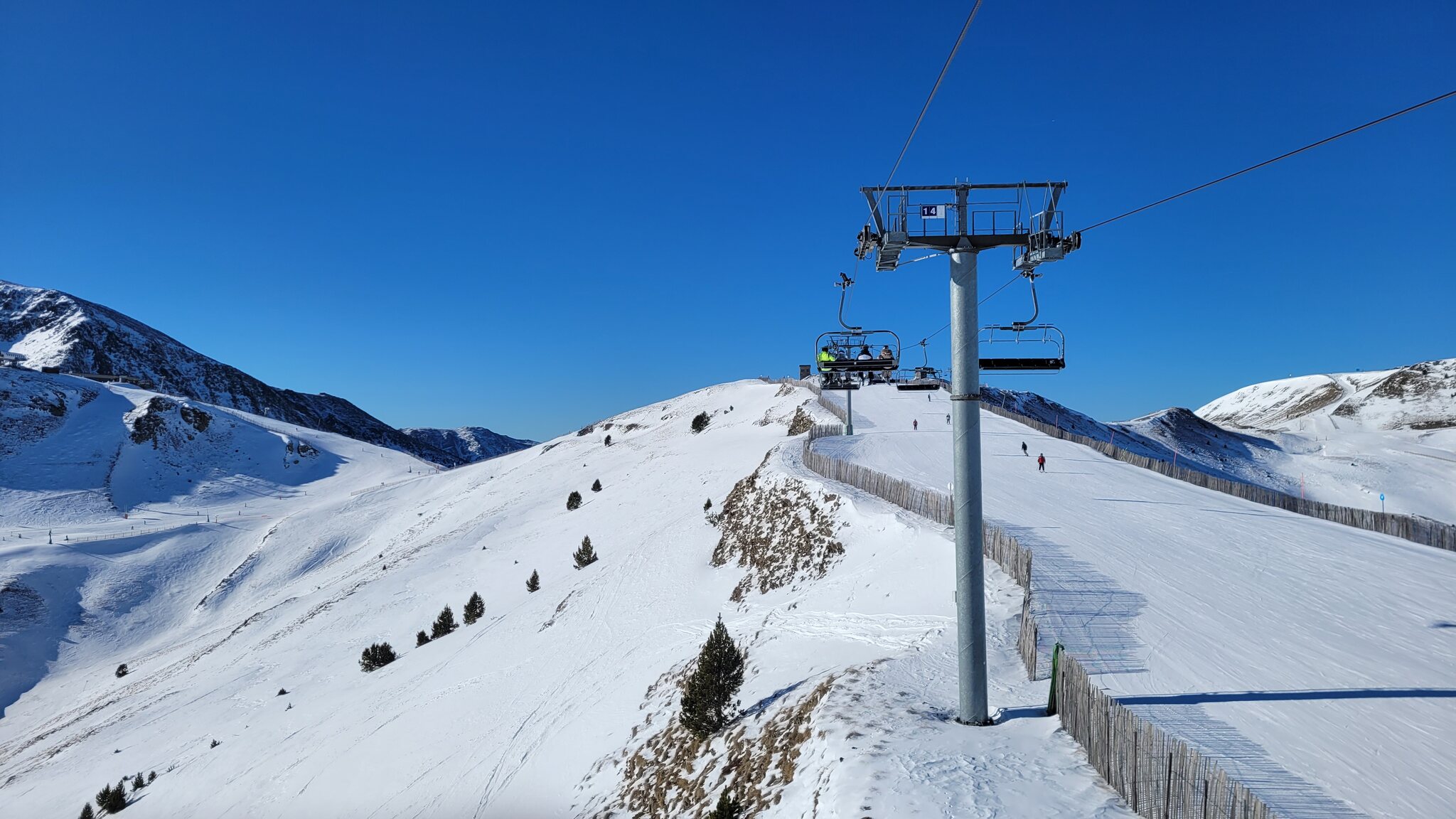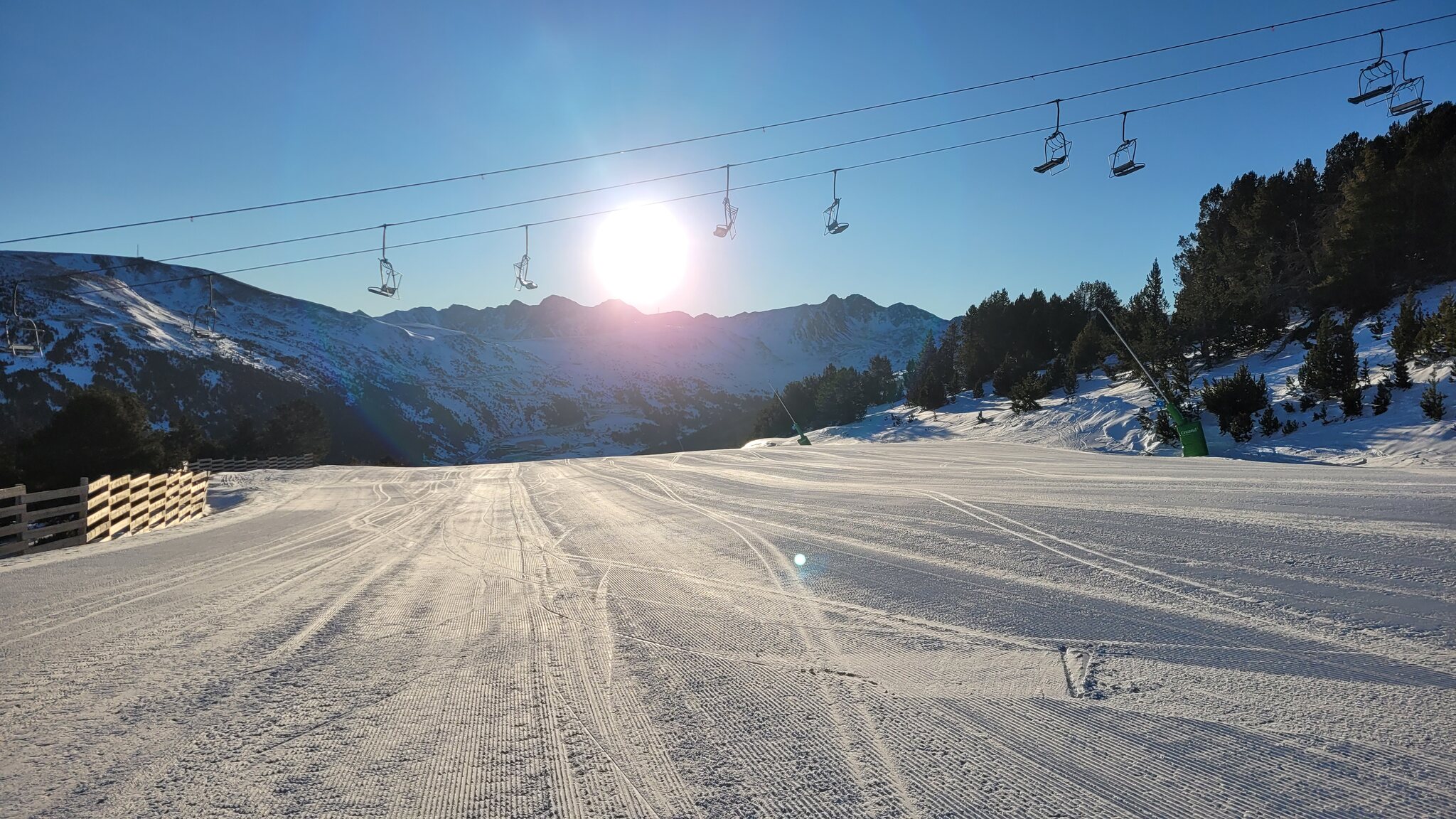 An der EUB in Soldeu gab es zu Betriebsbeginn 9h einen ziemlichen Rückstau, bin daher zur parallel verlaufenden KSB gegangen. Dort war niemand und als ich oben war, sind noch leere Kabinen an der EUB gekommen. Damit war ich dann auch der erste an der Solana KSB.