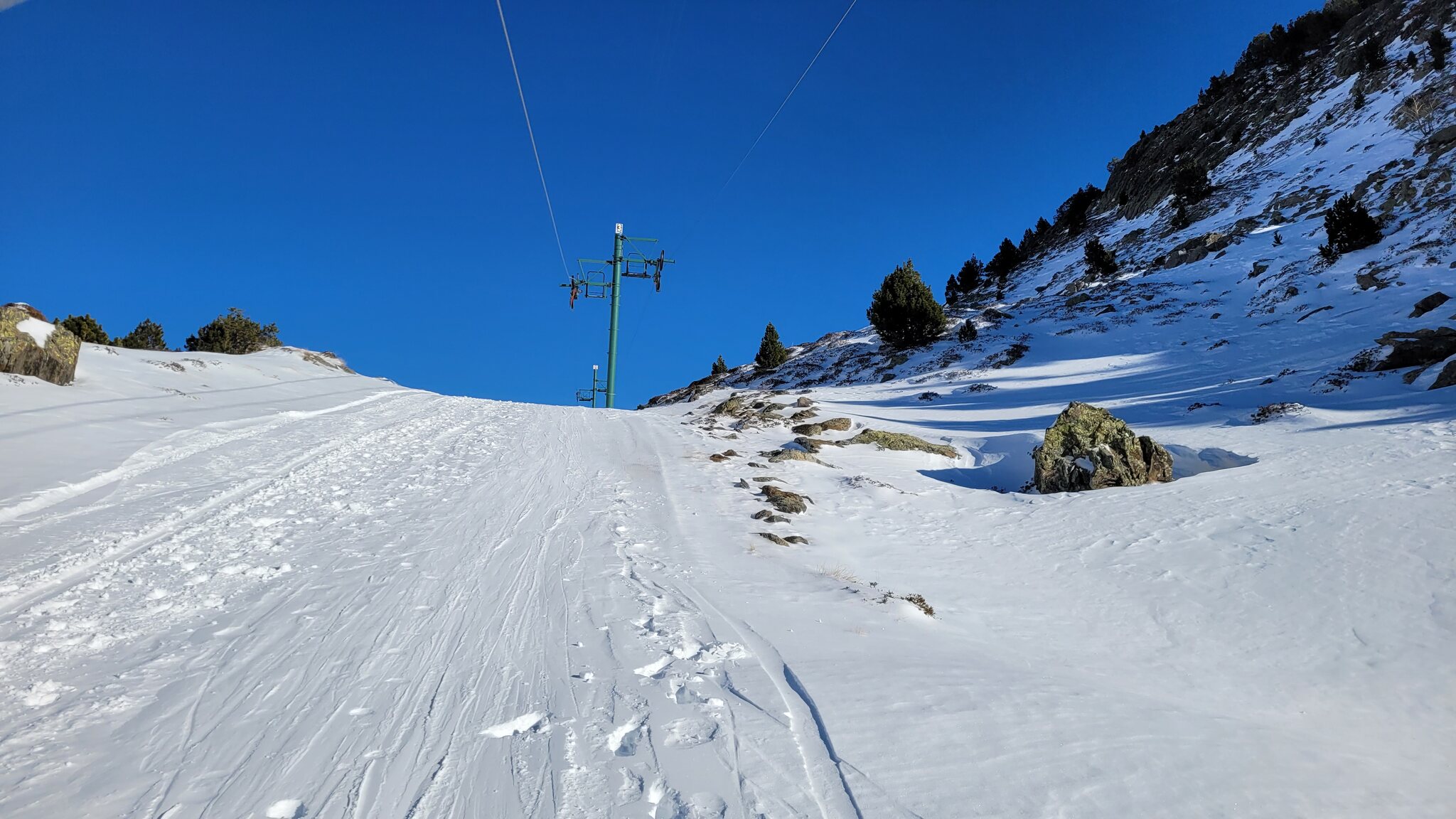 Der Creussans-Sessel lief nicht, der bedient nur Offpiste-Gelände. An der La Balma-Piste gibt es aber noch einen kurzen Poma KSSL, der auch nur Offpiste-Zubringer ist. Dort war nur der Ausstieg etwas eisig, aber sonst im Gelände noch erstaunlich pulvrig. Die direkte Piste an der KSB Basera war auch super, auch wenn sie am Nachmittag im Schatten liegt. Der Einstieg: Die Abfahrt über die Zubringerstrasse: Am Abarsetar-Sessel war es auch schon schattig, das ist besser für den Vormittag. Ich habe hier nur die rechtsaussen-Piste gemacht. Aber alles in allem ein Top-Tag heute, auch der Morgen in Grandvalira.