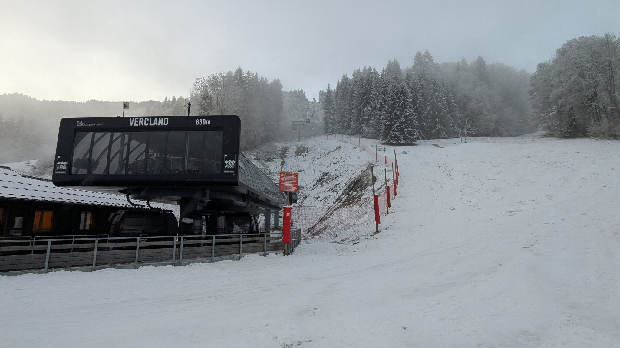 Da der Grand Massive Express kostenpflichtige Parkplätze hat, ist der Startpunkt in Vercland, an einer modernen D-Line Gondel. Theoretisch gibt es hier auch eine Talabfahrt, da fehlt aber noch deutlich Schnee.