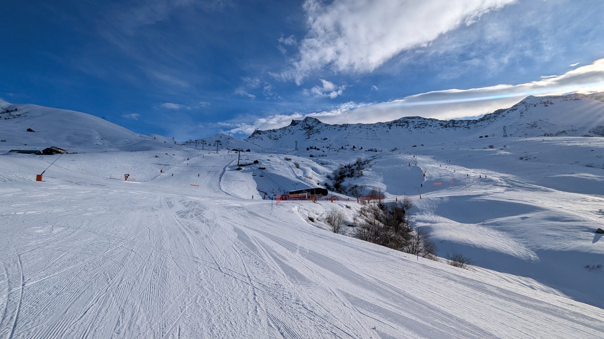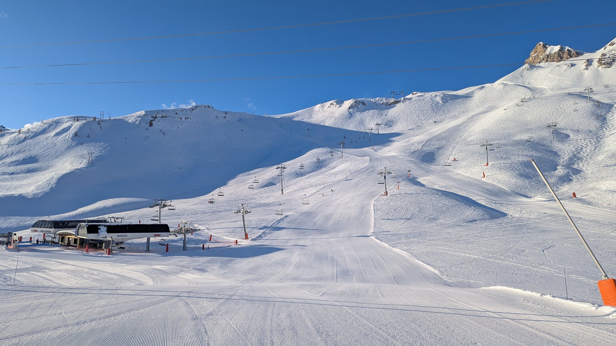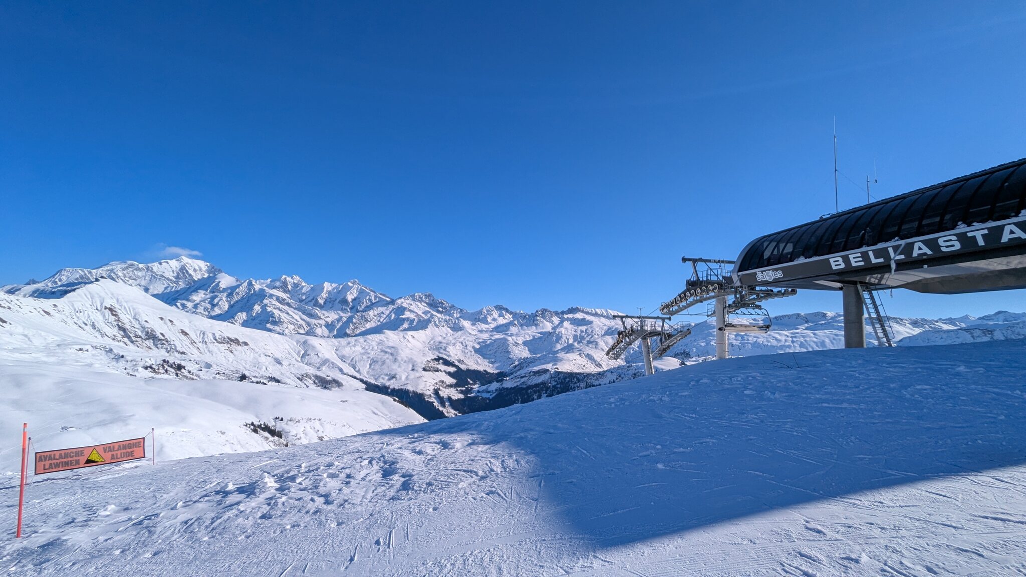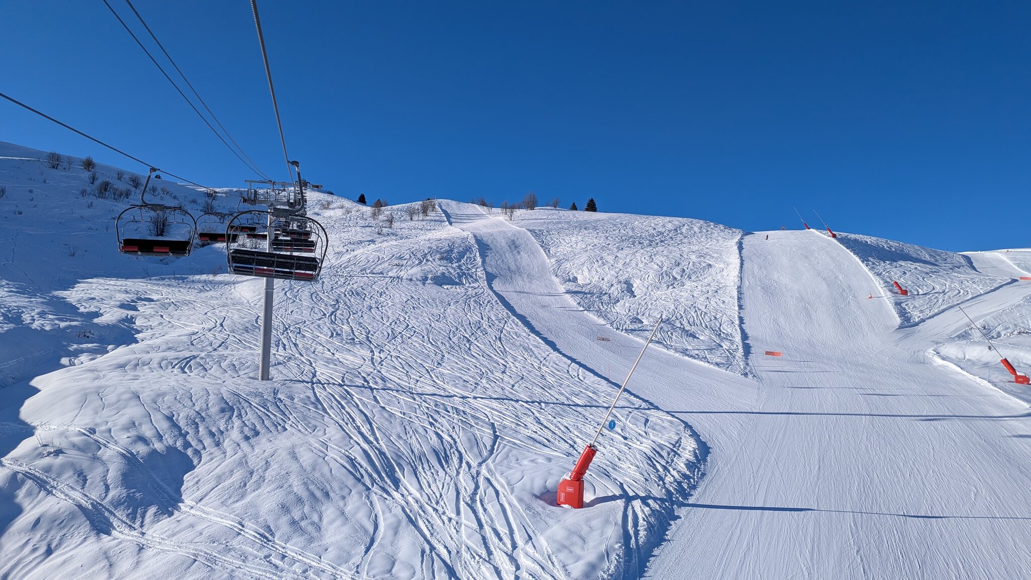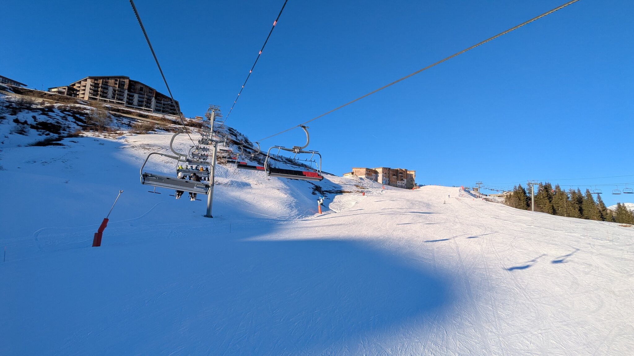 Schnee ist auf den Pisten genug, aber manche Pisten sind auch noch zu. Es gibt ein paar historische Anlagen, aber alles relevante ist top modern kuppelbar. Hauben sind in Frankreich sowieso überall als überflüssig erkannt. Und gefühlt. Alle kuppelbaren Lifte laufen mit ordentlich Speed!