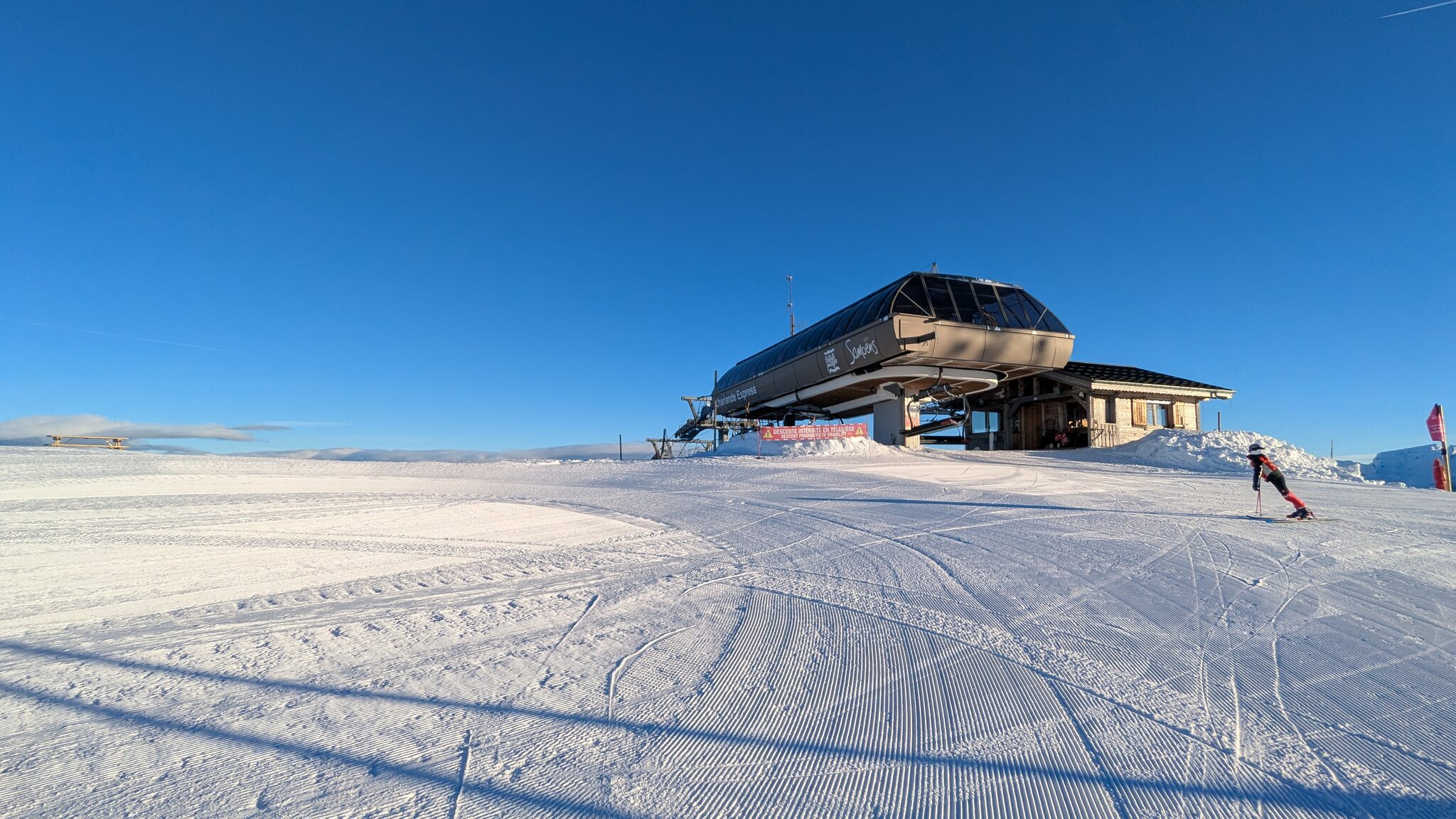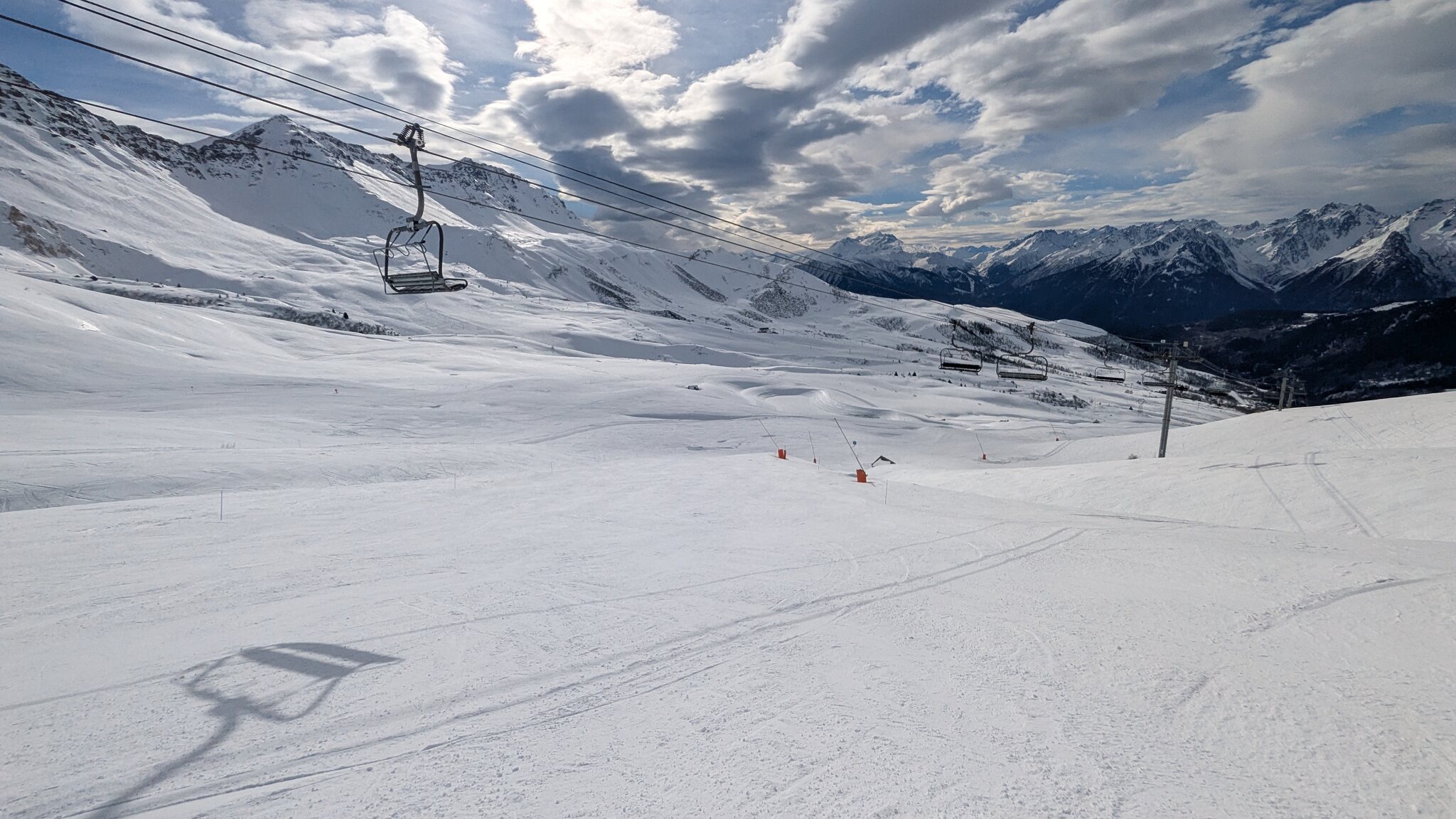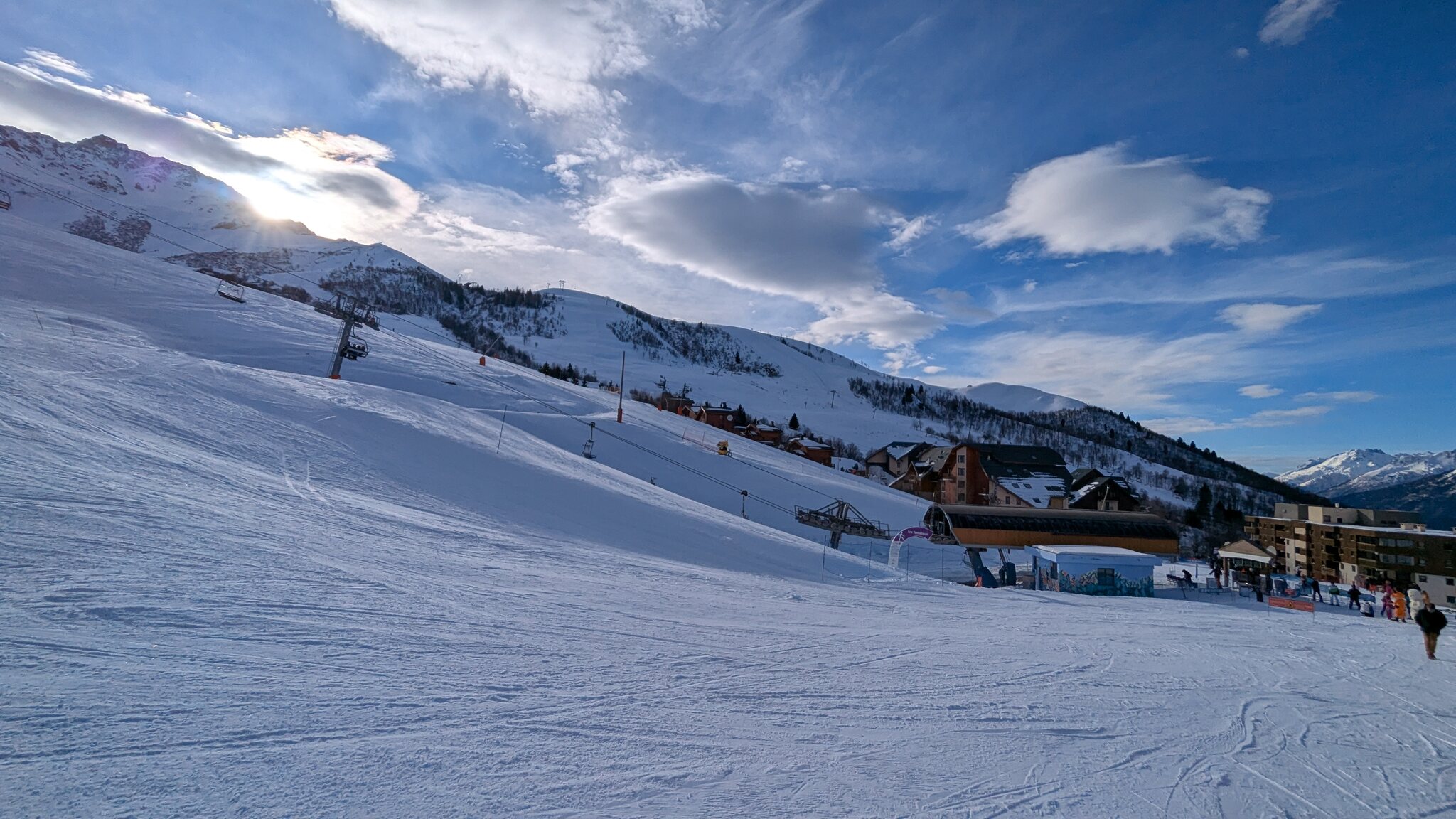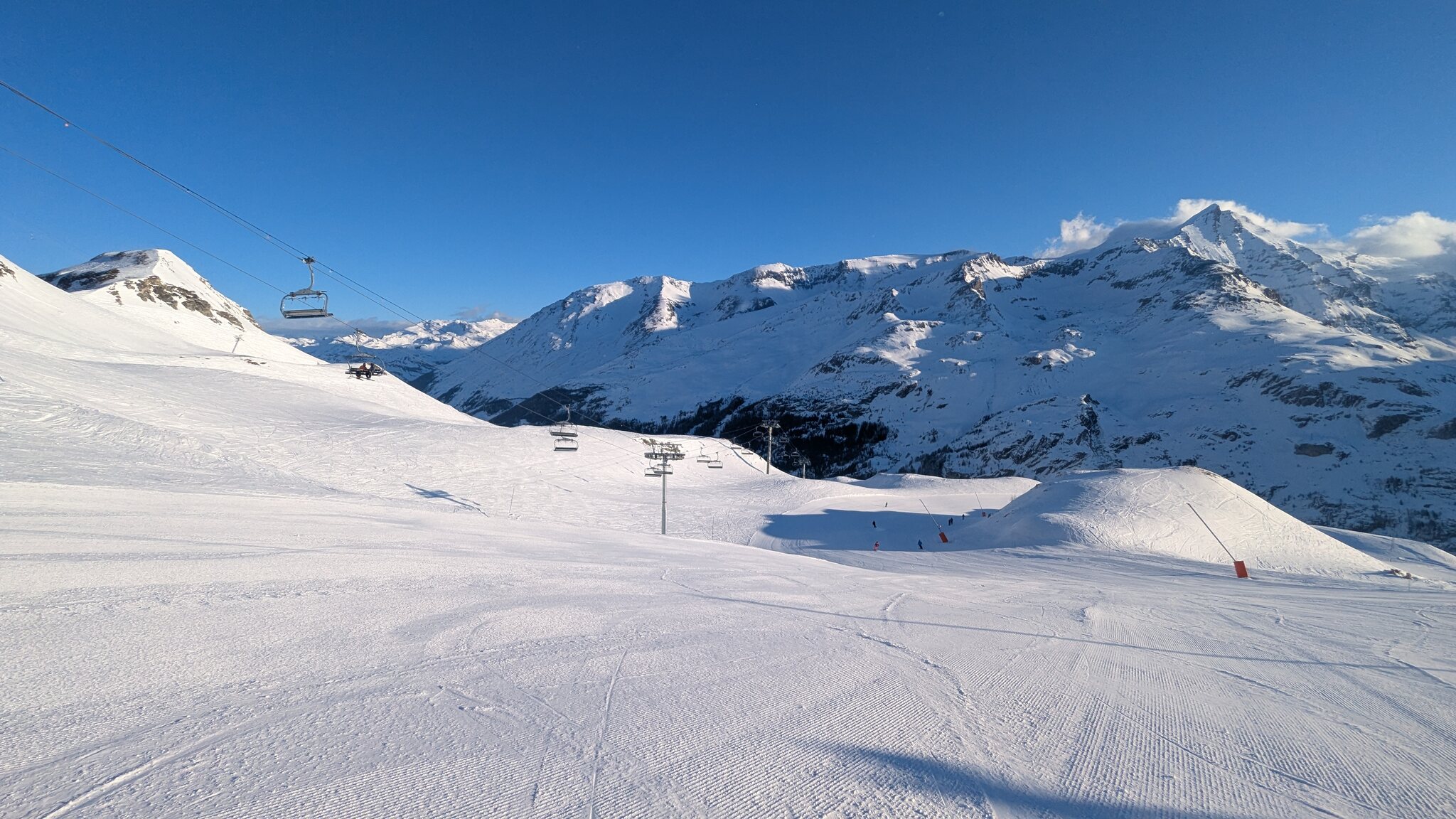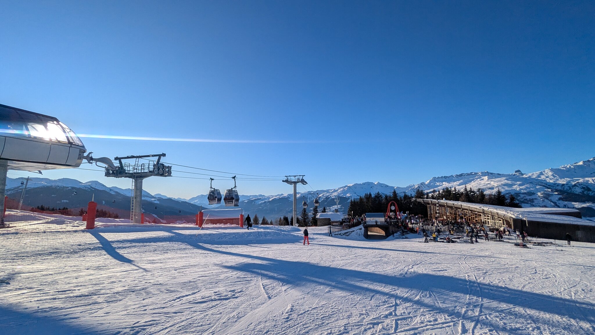 Schnee ist auf den Pisten genug, aber manche Pisten sind auch noch zu. Es gibt ein paar historische Anlagen, aber alles relevante ist top modern kuppelbar. Hauben sind in Frankreich sowieso überall als überflüssig erkannt. Und gefühlt. Alle kuppelbaren Lifte laufen mit ordentlich Speed!