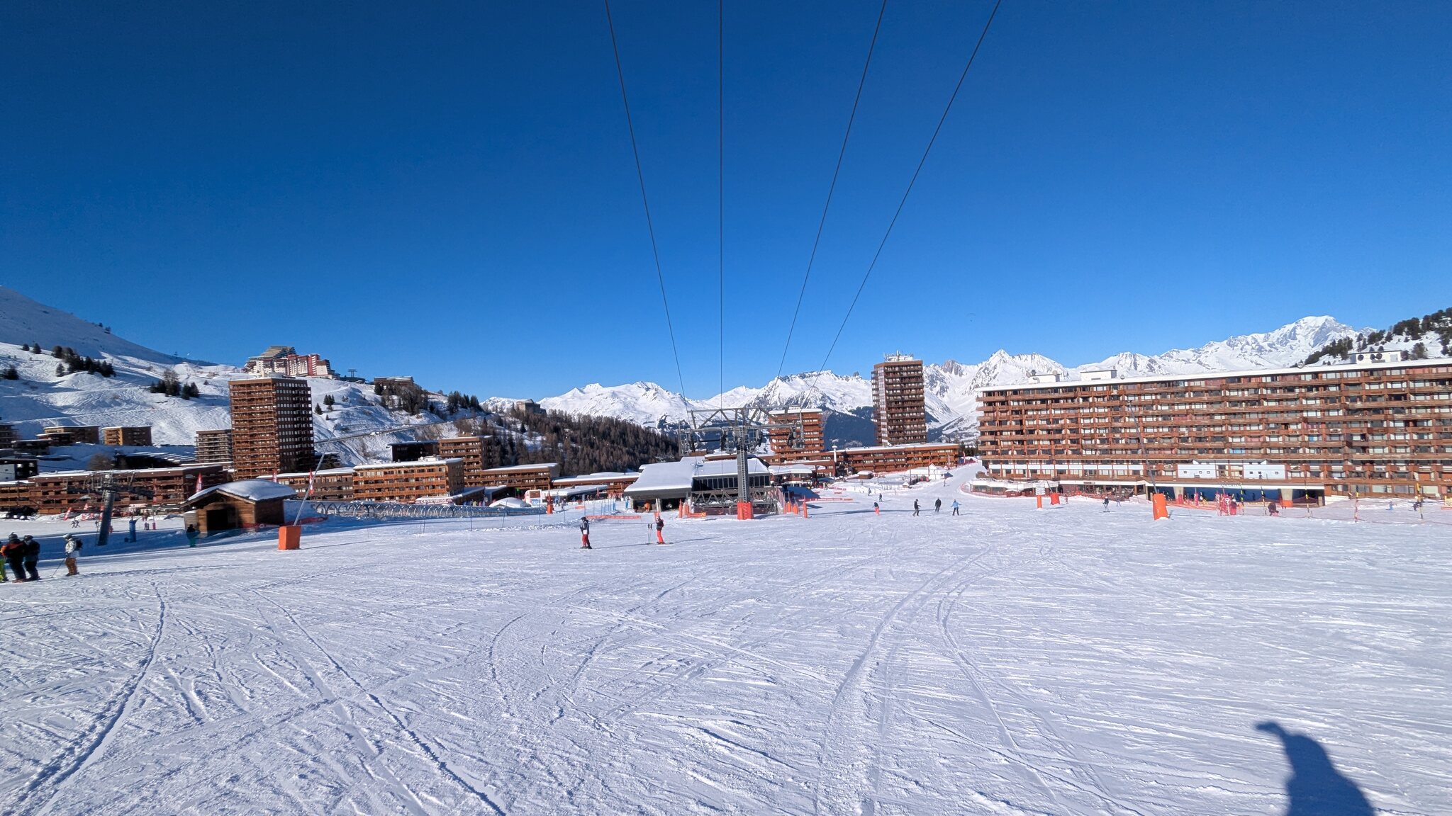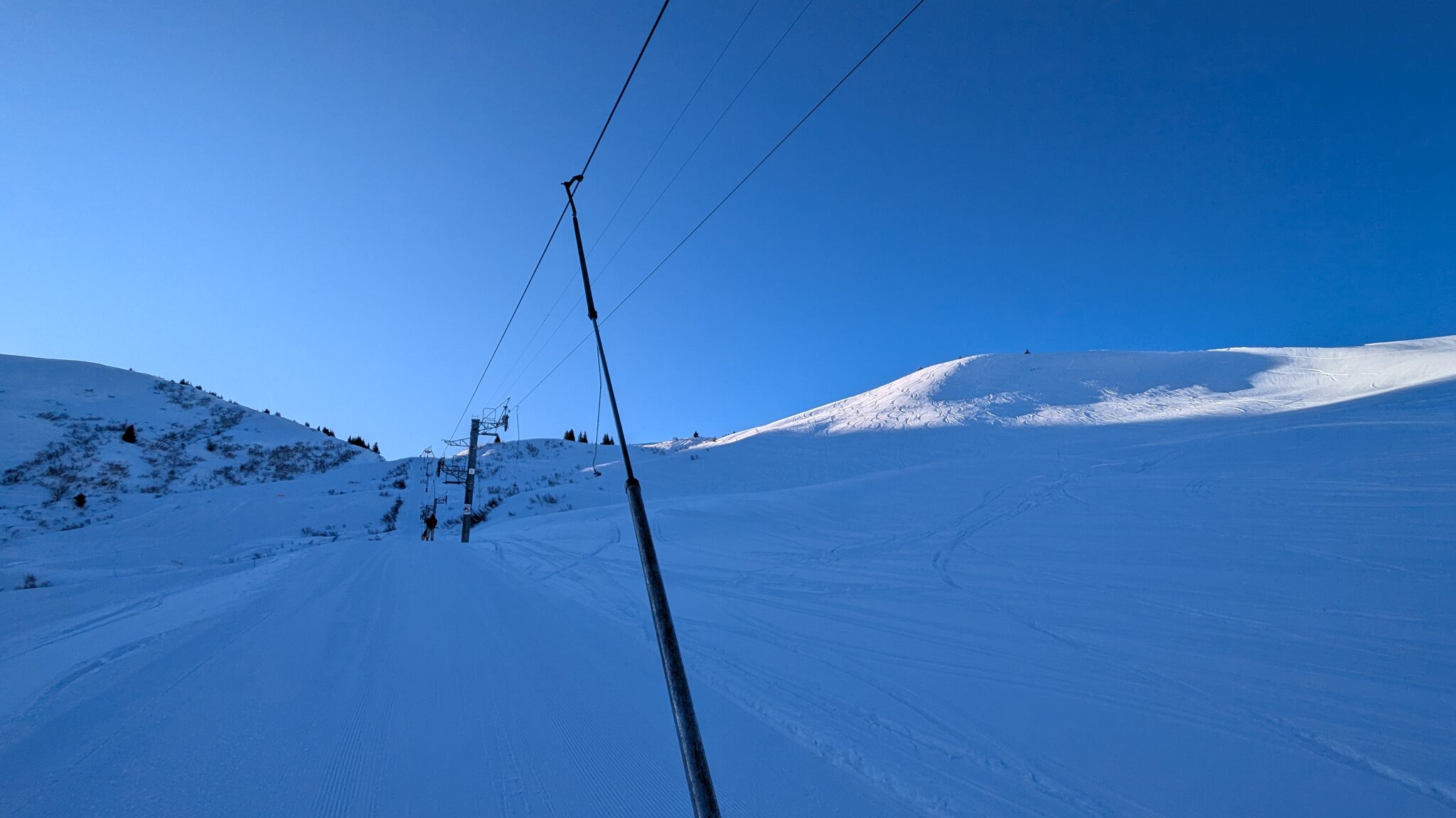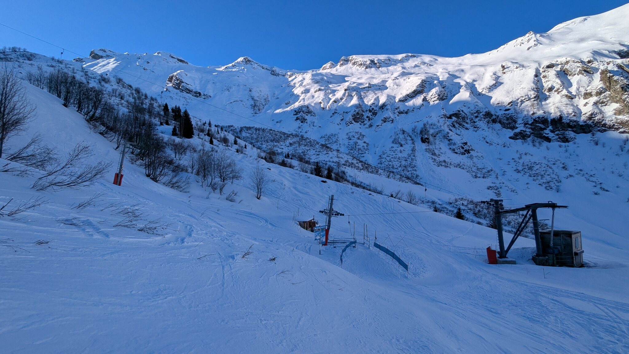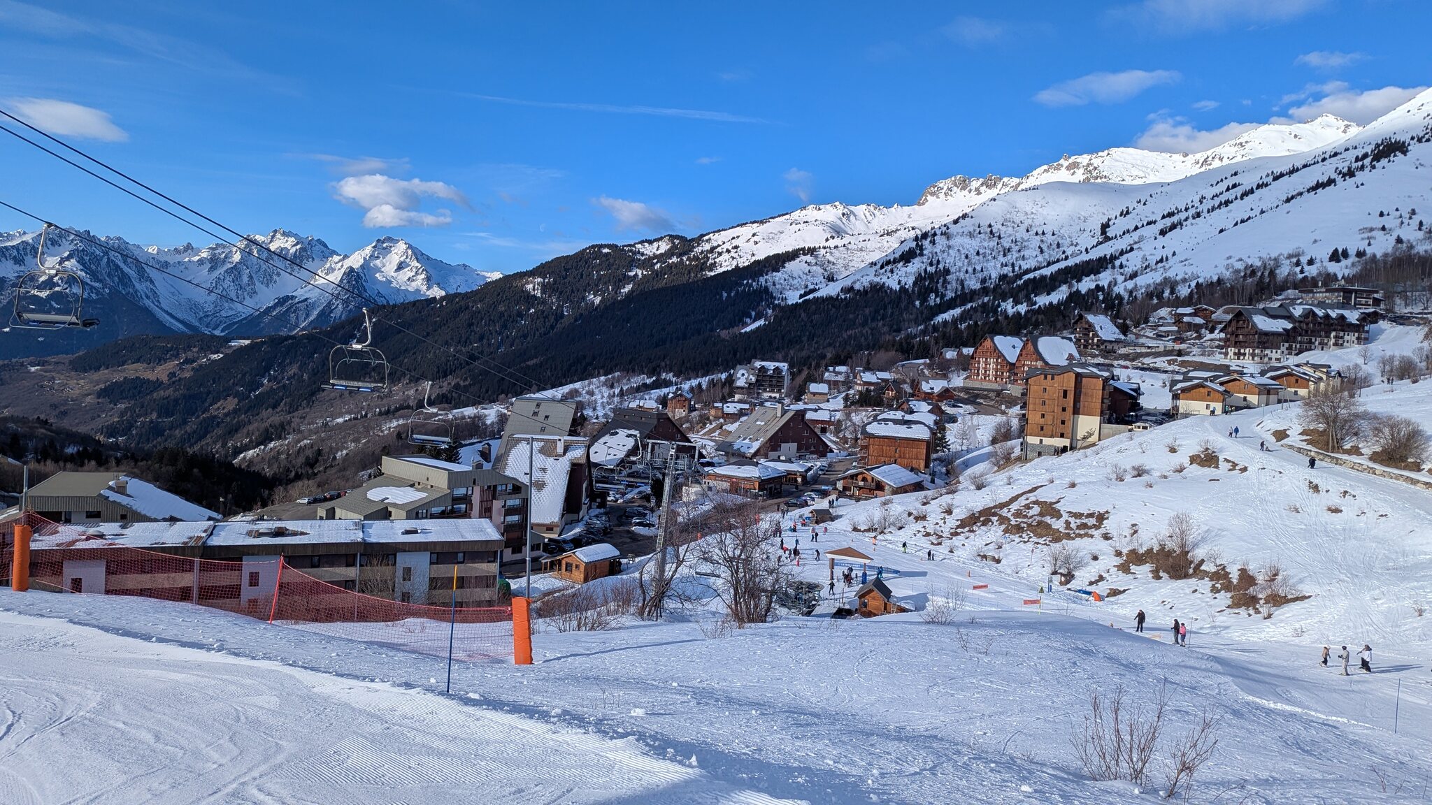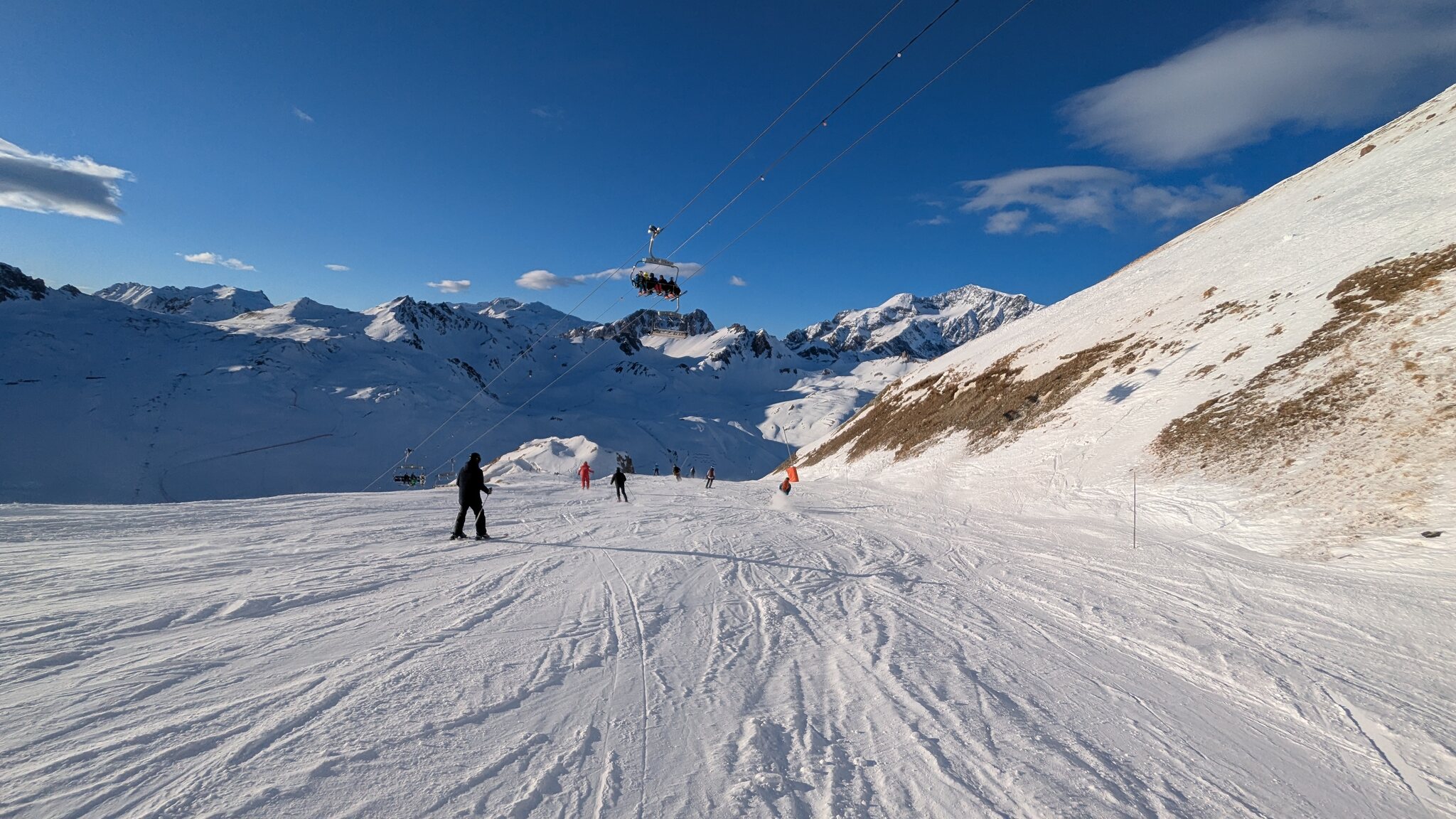 Schnee ist auf den Pisten genug, aber manche Pisten sind auch noch zu. Es gibt ein paar historische Anlagen, aber alles relevante ist top modern kuppelbar. Hauben sind in Frankreich sowieso überall als überflüssig erkannt. Und gefühlt. Alle kuppelbaren Lifte laufen mit ordentlich Speed!