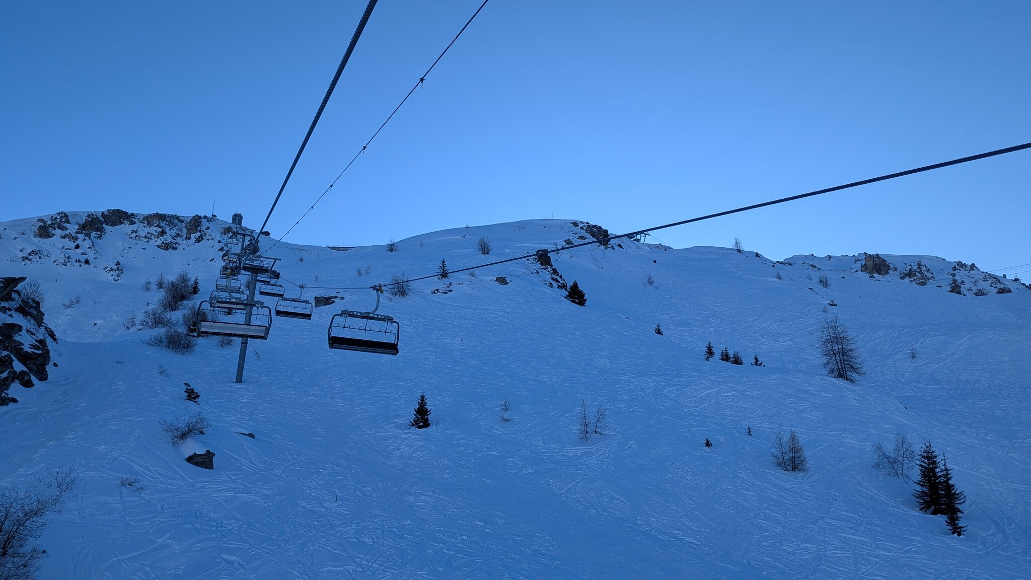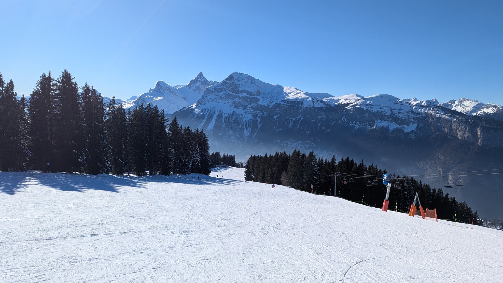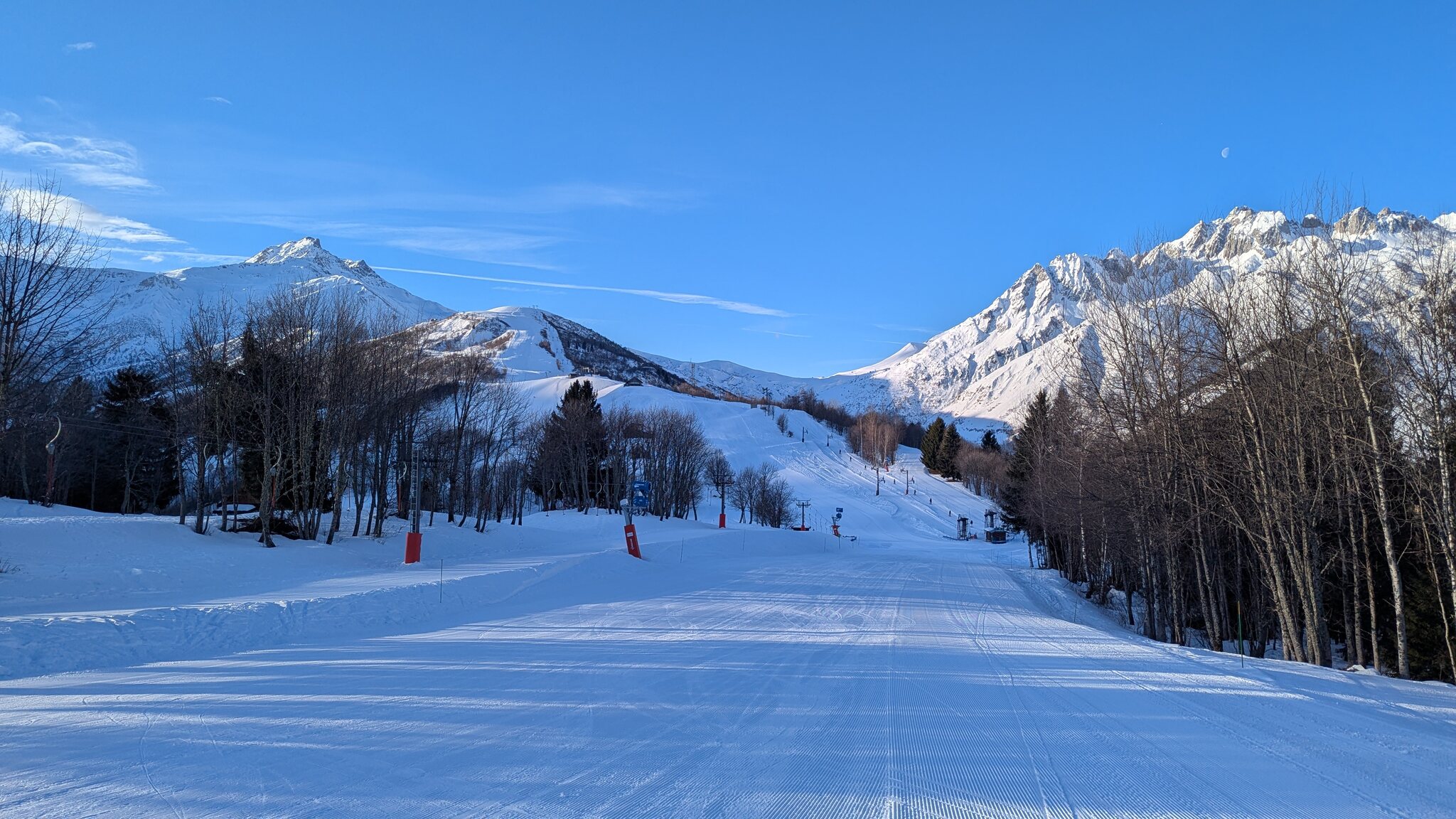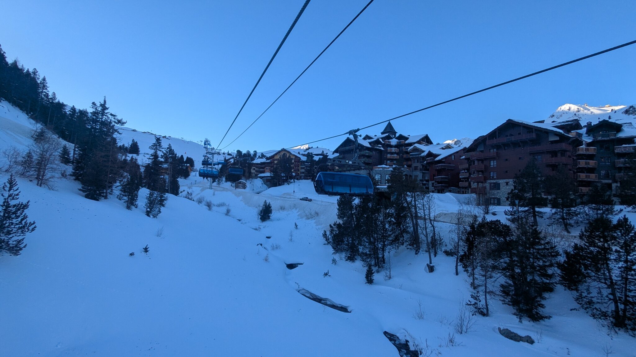 Schnee ist auf den Pisten genug, aber manche Pisten sind auch noch zu. Es gibt ein paar historische Anlagen, aber alles relevante ist top modern kuppelbar. Hauben sind in Frankreich sowieso überall als überflüssig erkannt. Und gefühlt. Alle kuppelbaren Lifte laufen mit ordentlich Speed!