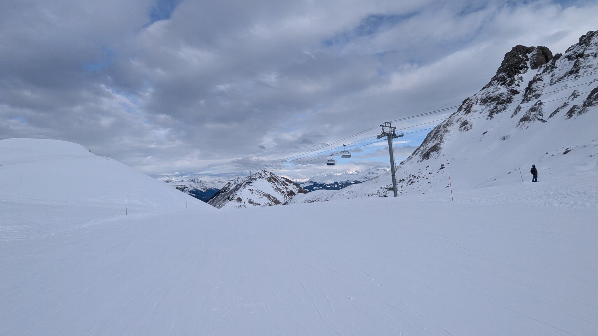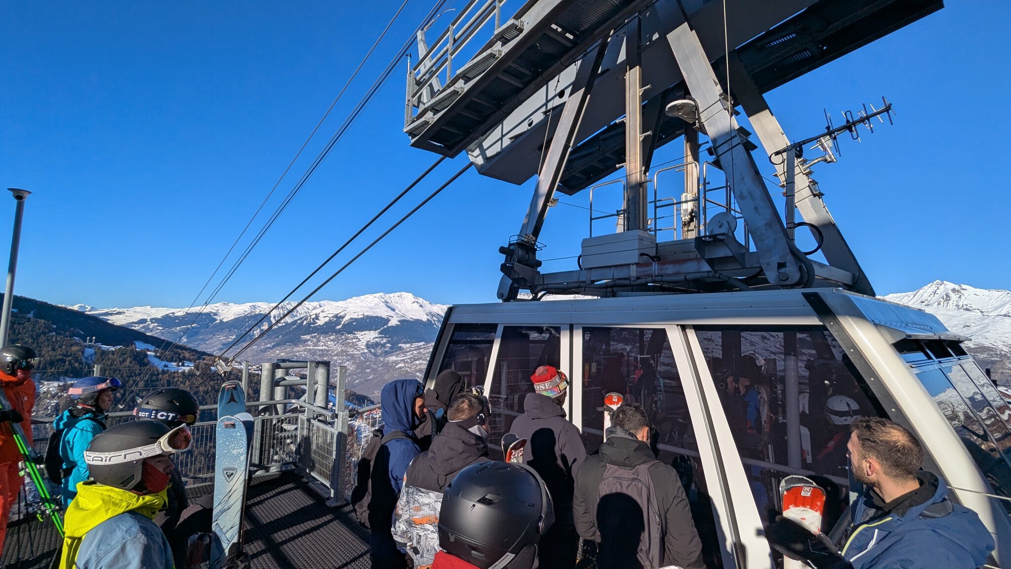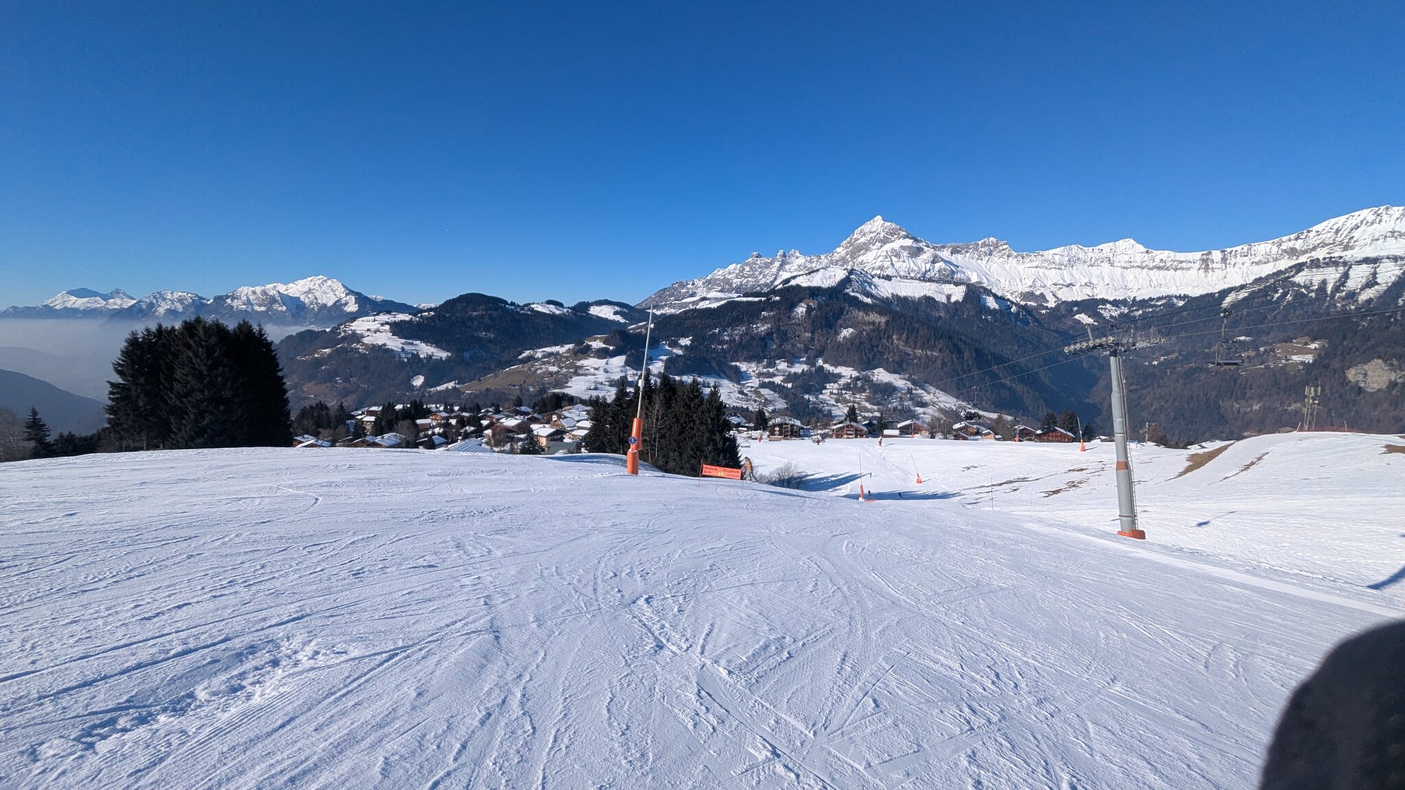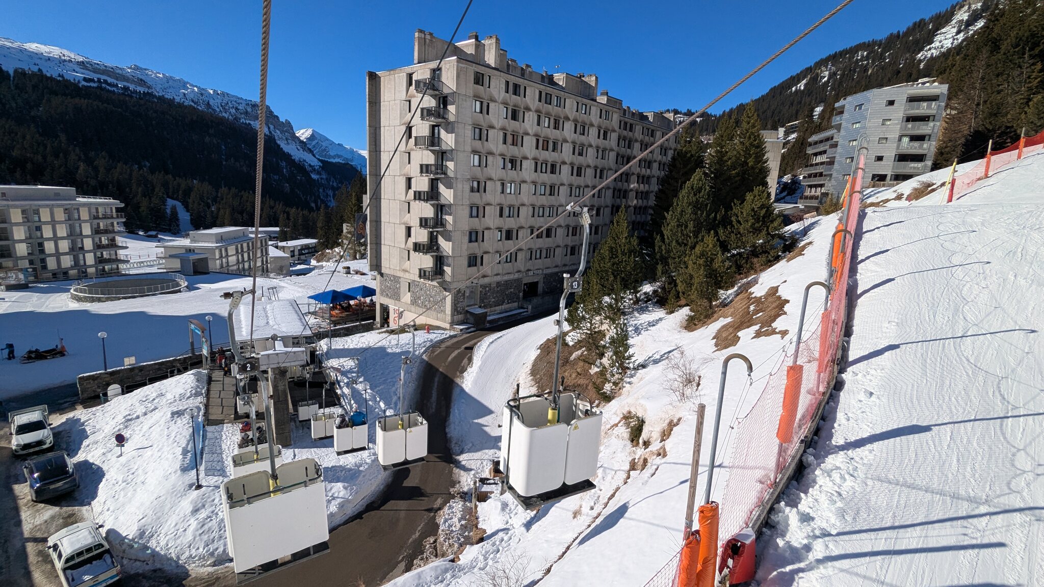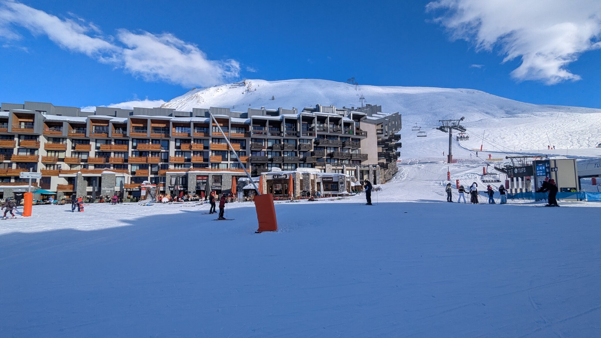 Schnee ist auf den Pisten genug, aber manche Pisten sind auch noch zu. Es gibt ein paar historische Anlagen, aber alles relevante ist top modern kuppelbar. Hauben sind in Frankreich sowieso überall als überflüssig erkannt. Und gefühlt. Alle kuppelbaren Lifte laufen mit ordentlich Speed!