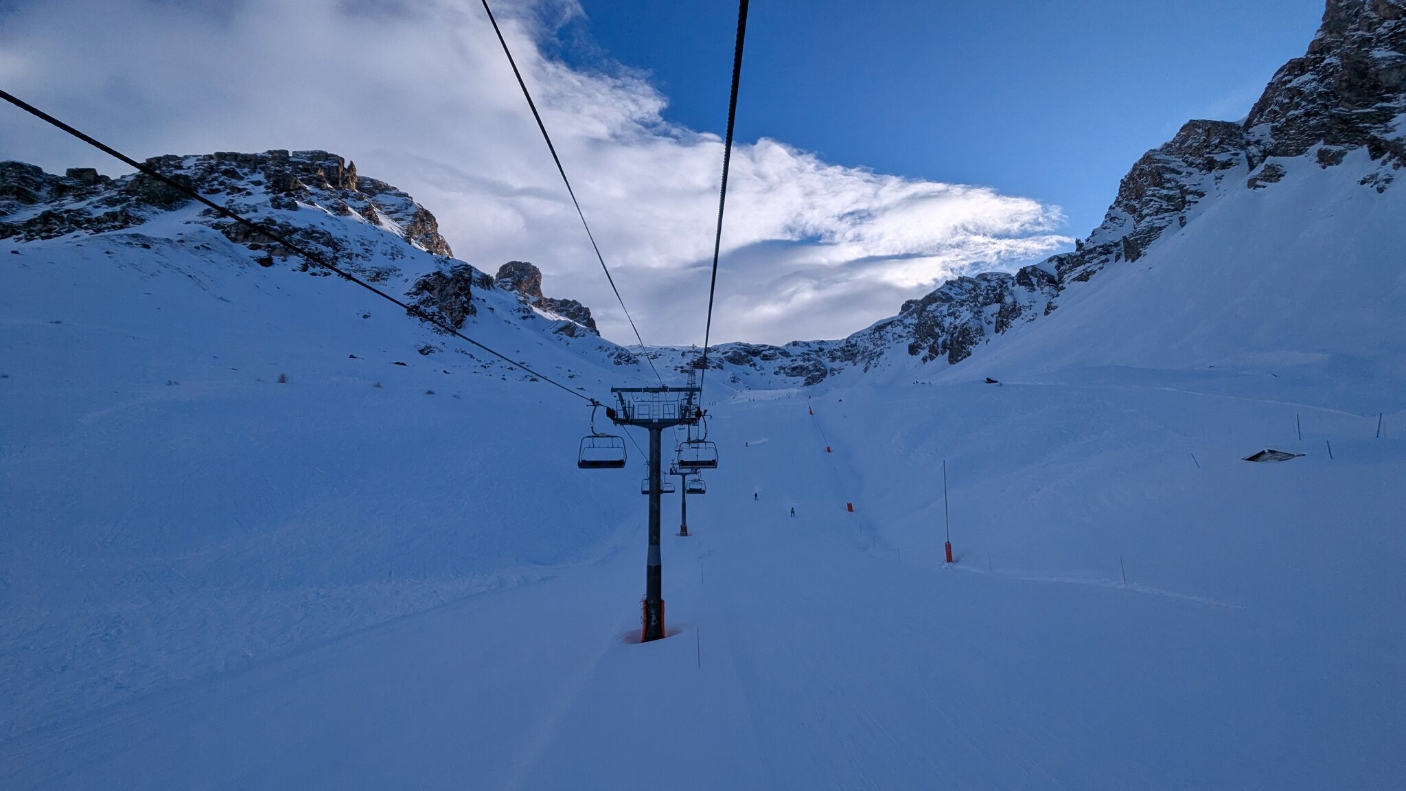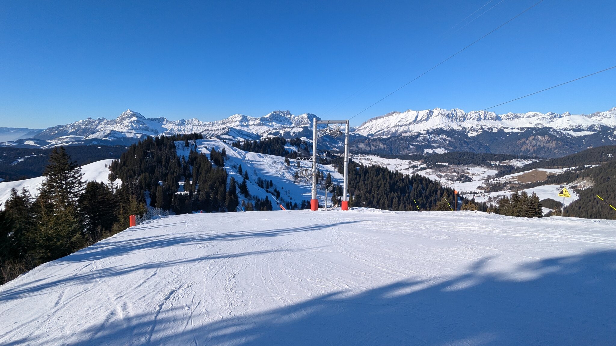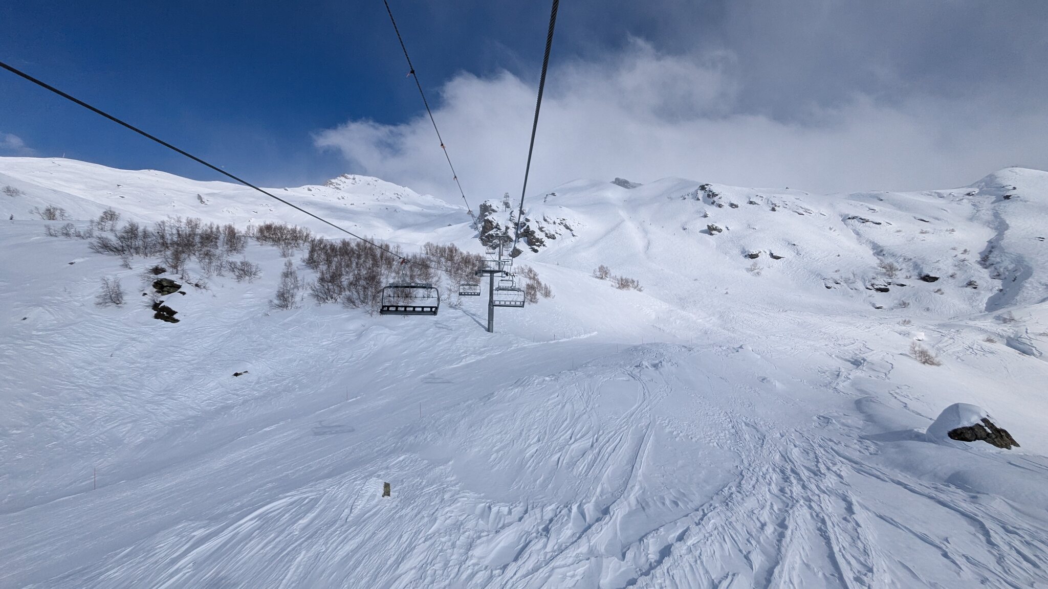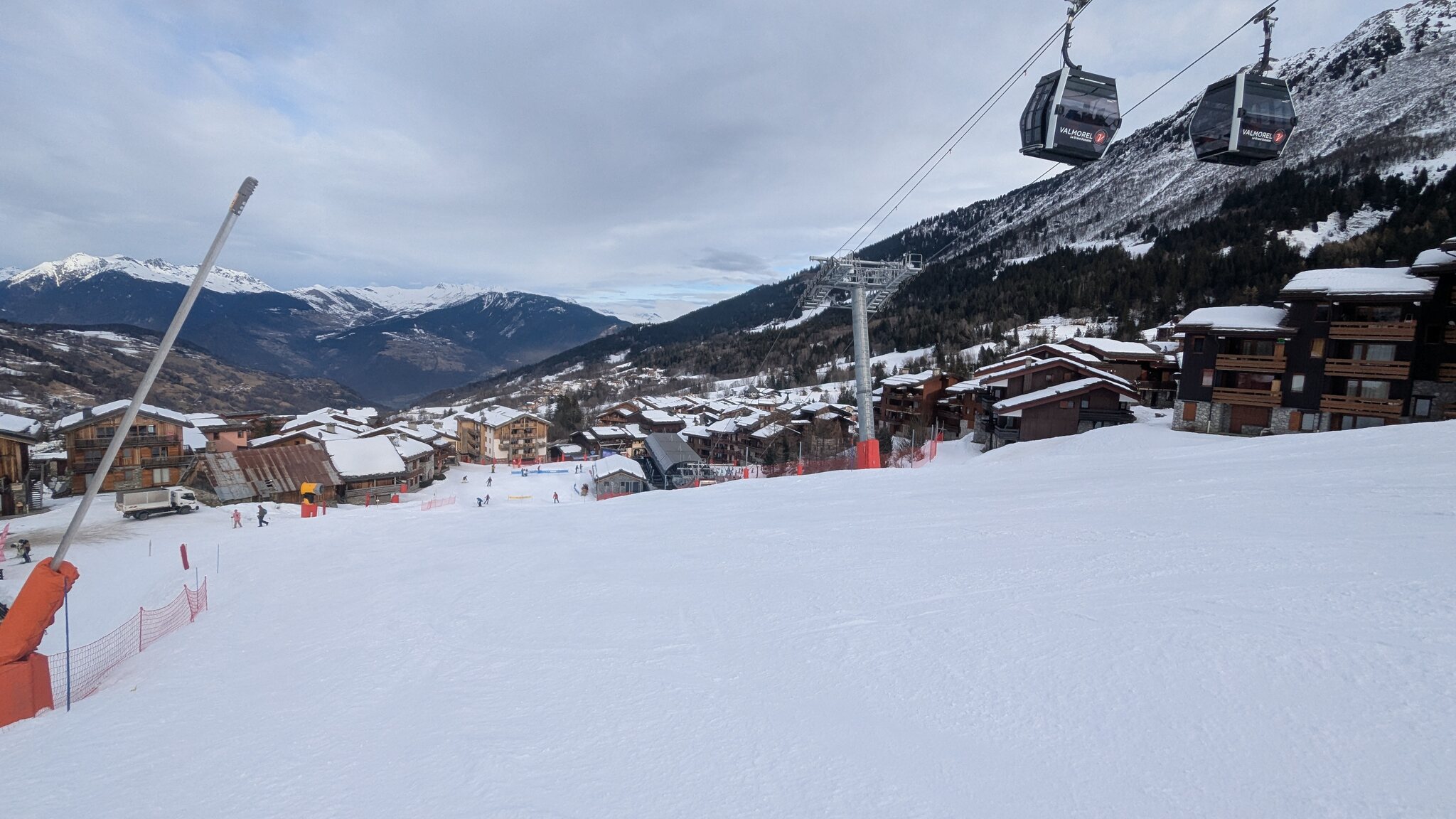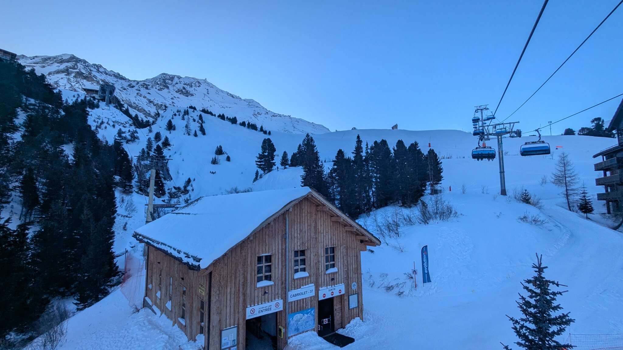 Schnee ist auf den Pisten genug, aber manche Pisten sind auch noch zu. Es gibt ein paar historische Anlagen, aber alles relevante ist top modern kuppelbar. Hauben sind in Frankreich sowieso überall als überflüssig erkannt. Und gefühlt. Alle kuppelbaren Lifte laufen mit ordentlich Speed!
