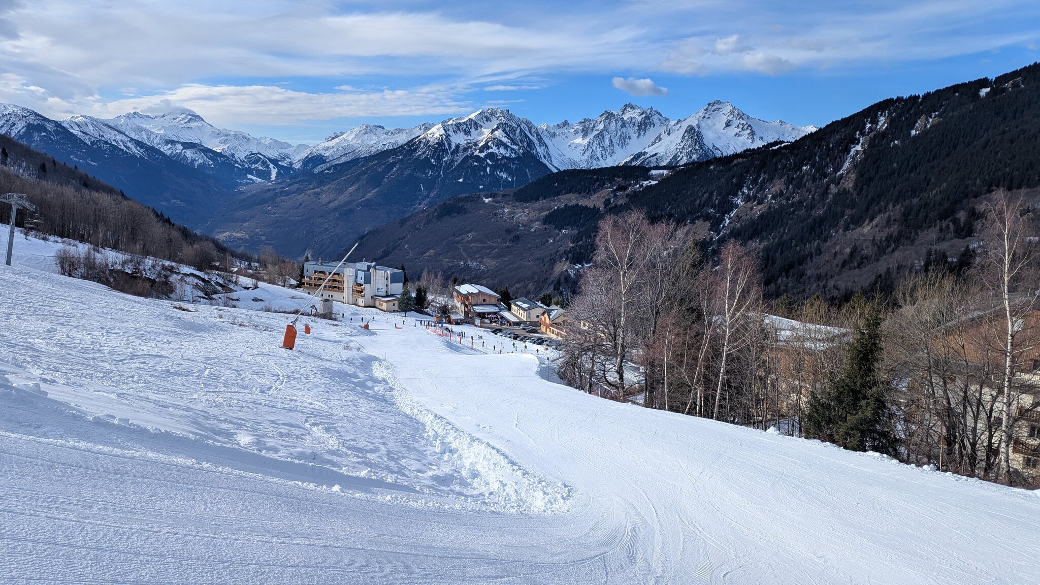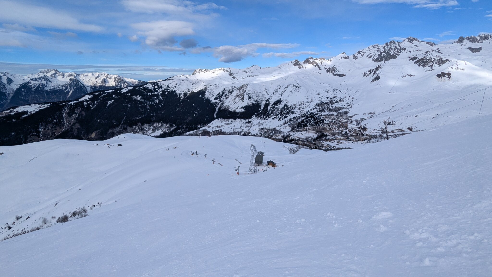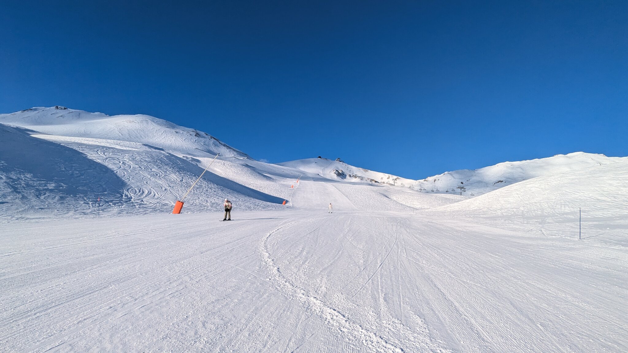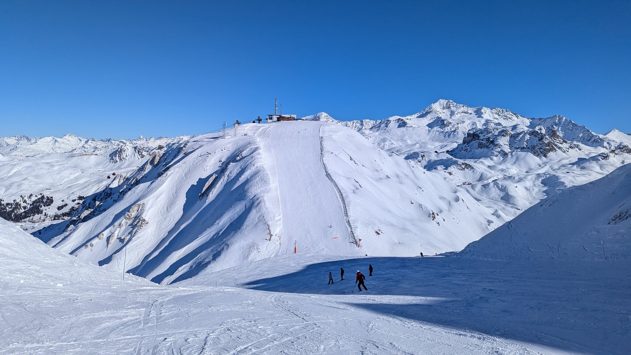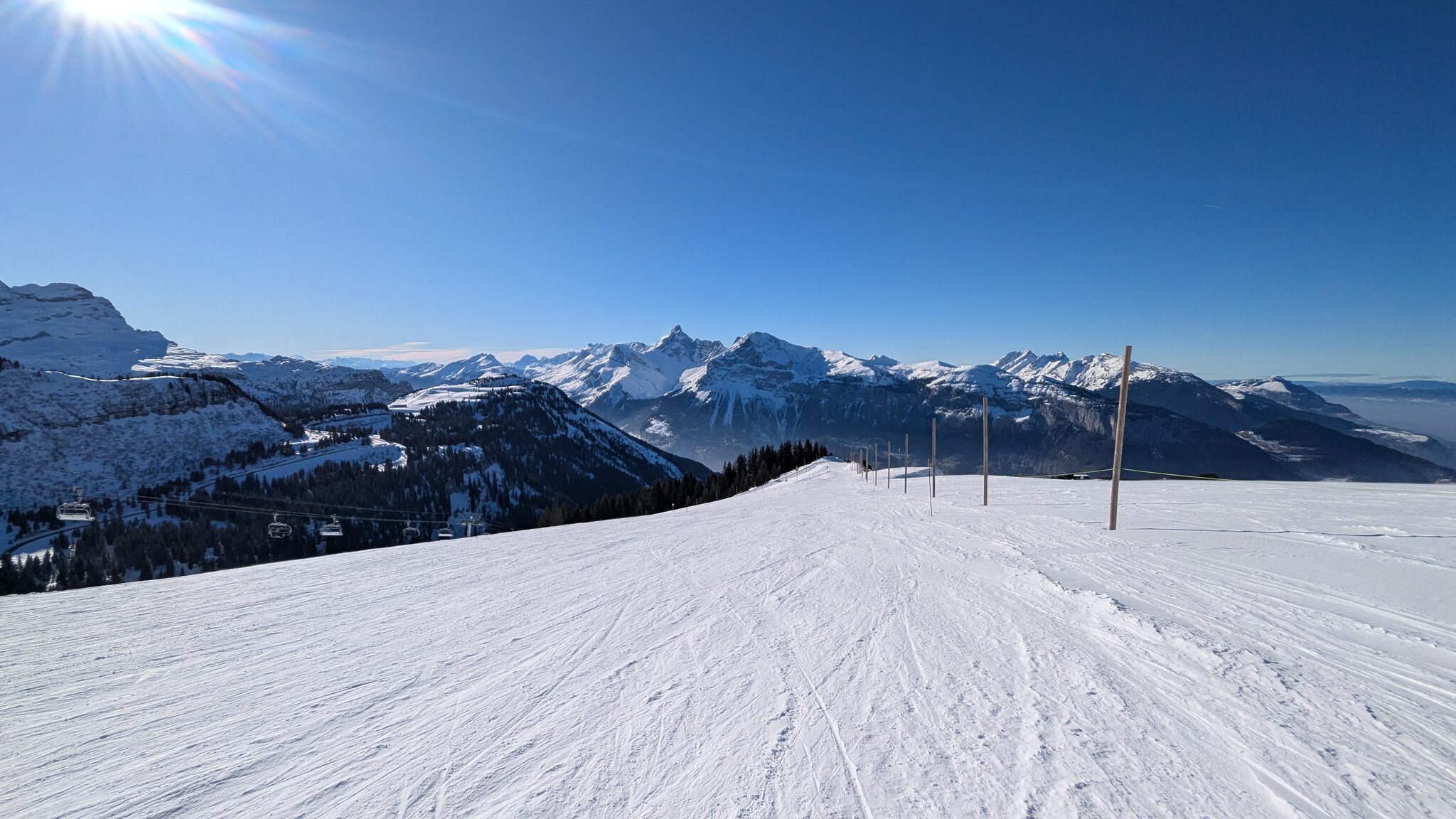 Schnee ist auf den Pisten genug, aber manche Pisten sind auch noch zu. Es gibt ein paar historische Anlagen, aber alles relevante ist top modern kuppelbar. Hauben sind in Frankreich sowieso überall als überflüssig erkannt. Und gefühlt. Alle kuppelbaren Lifte laufen mit ordentlich Speed!