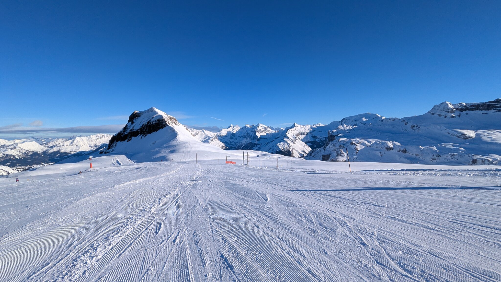 Heute zum ersten Mal offen: Lindards Nord mit spannender Geländekammer plus entspannter Sonnen Piste. Dahinter Grand Plattiere, die direkte Anfahrt von dort oben leider hier her geschlossen.