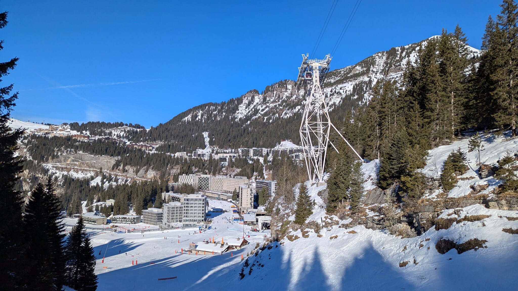 Gondelbahn Morillon aus dem Tal heraus. Dort unten hätte man auch gut parken können.