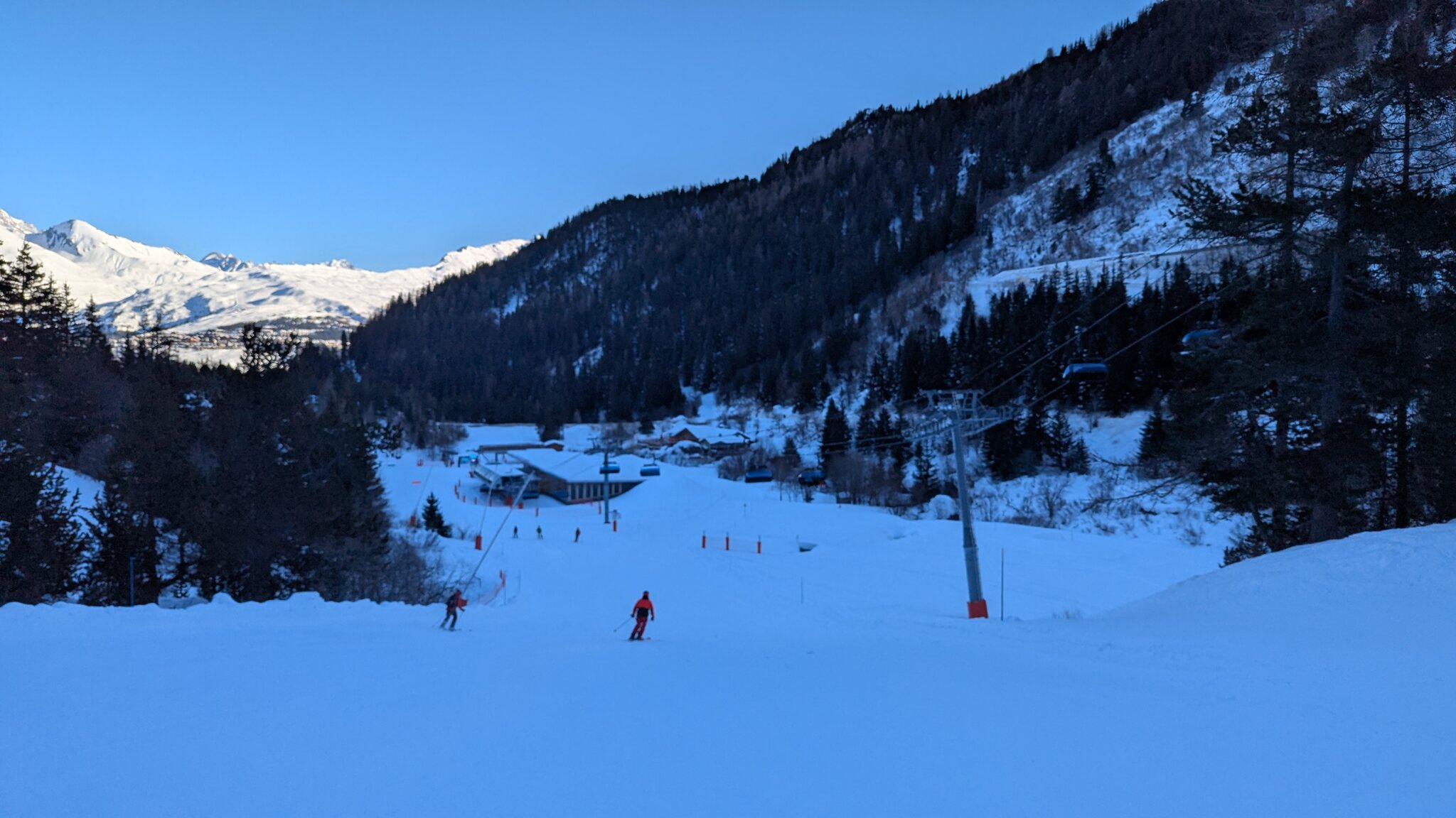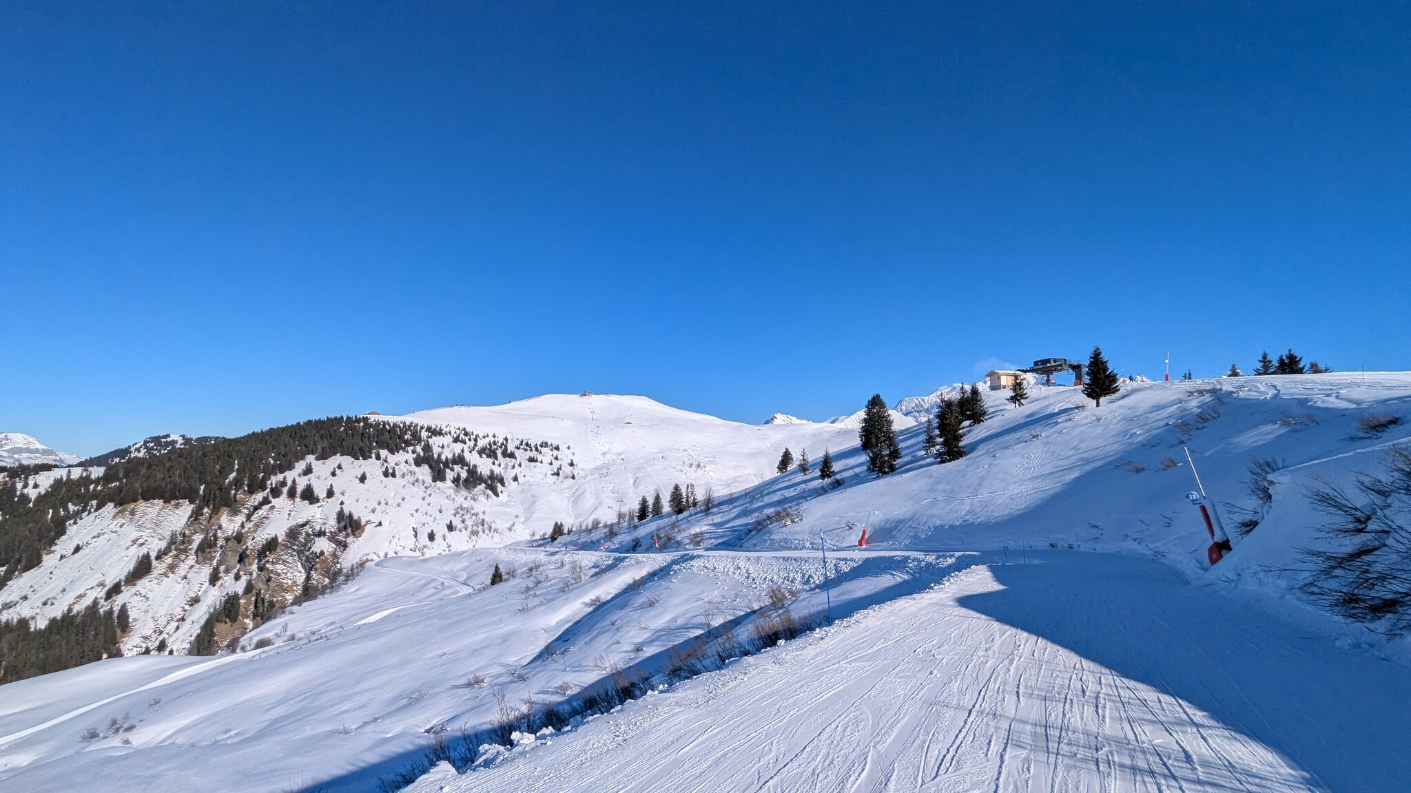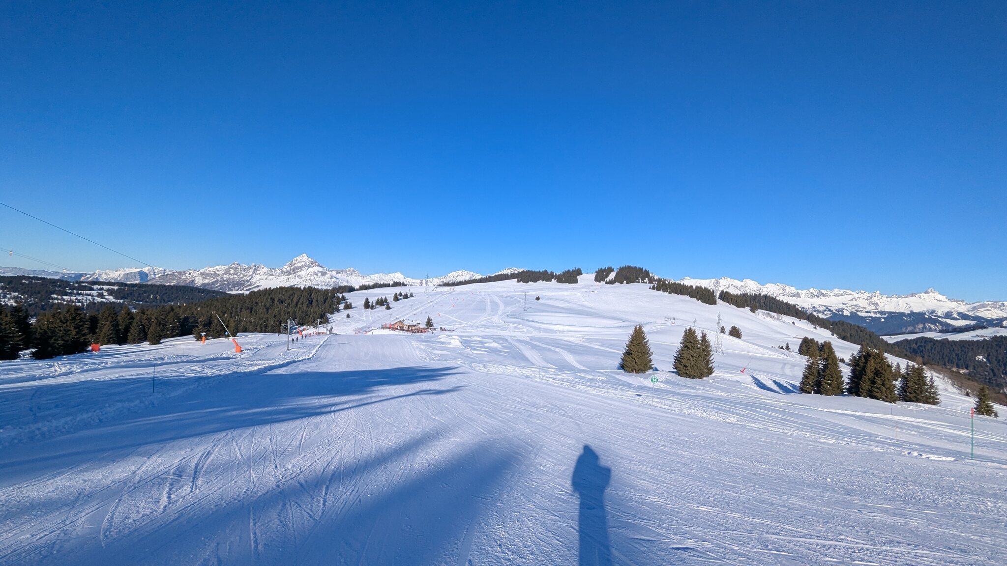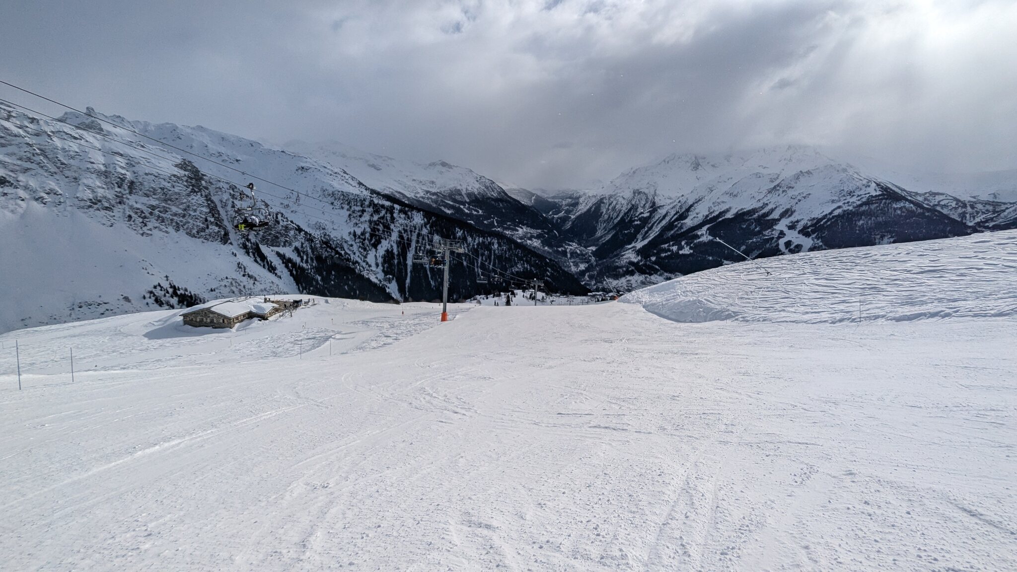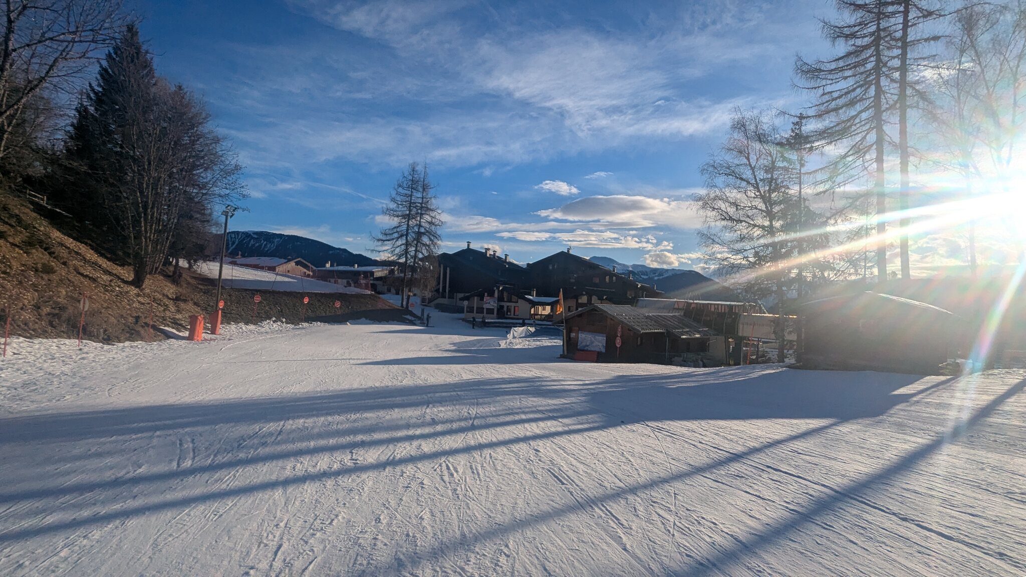 Der weiterführendende Schlepplift öffnet erst um 9:25, daher geht's erst runter Richtung Doucy. Das ist schon etwas Schade, weil die Lifte aus Valmorel schon um 9:00 Uhr öffnen...