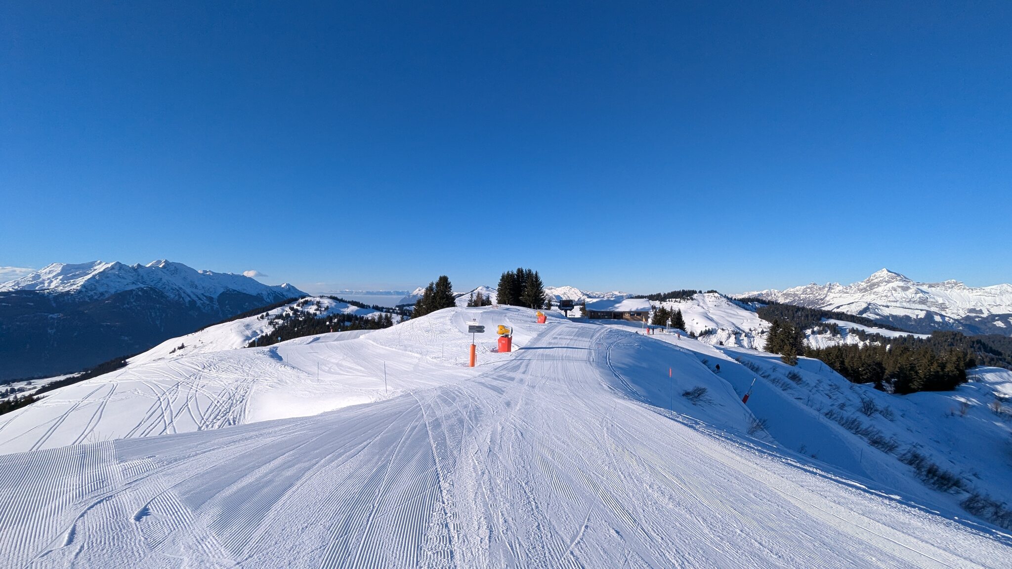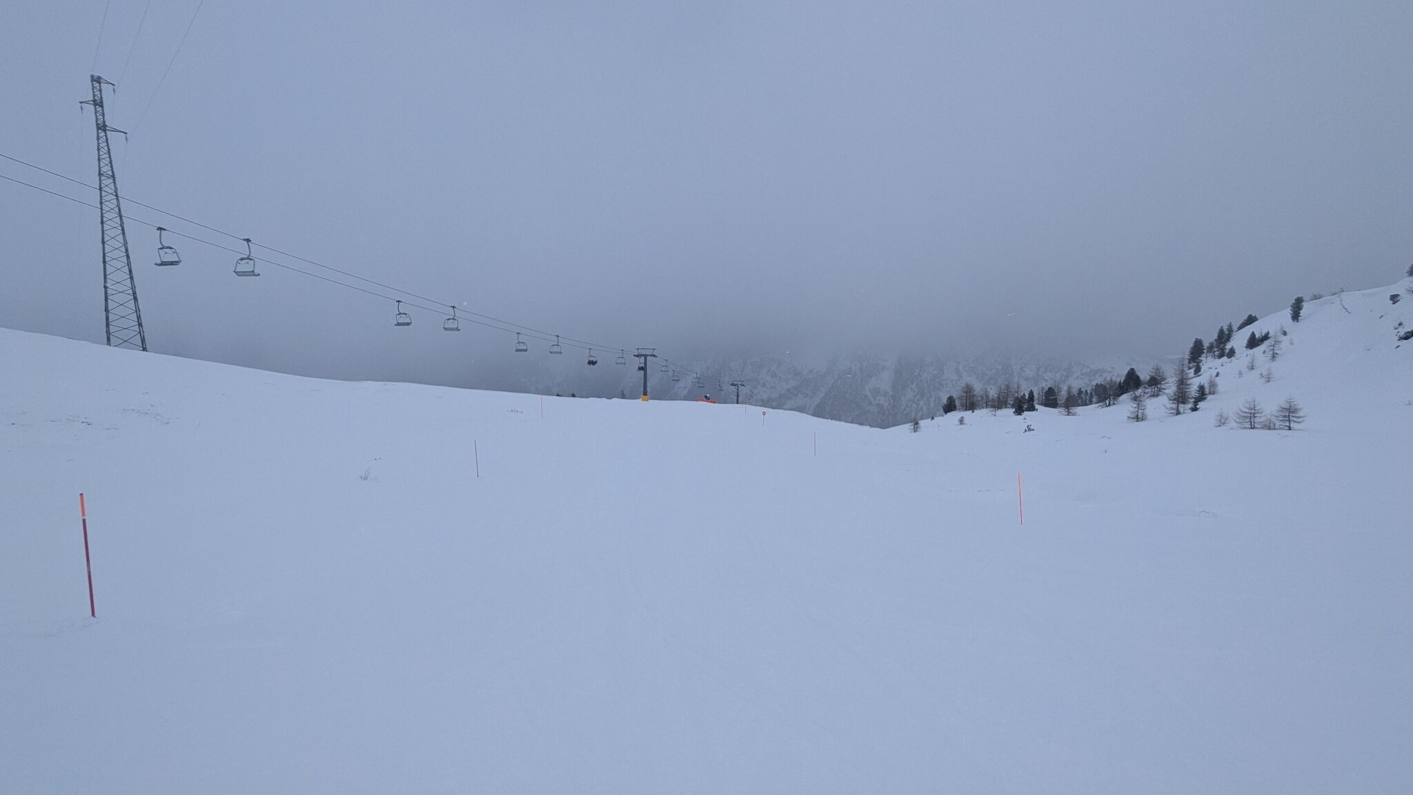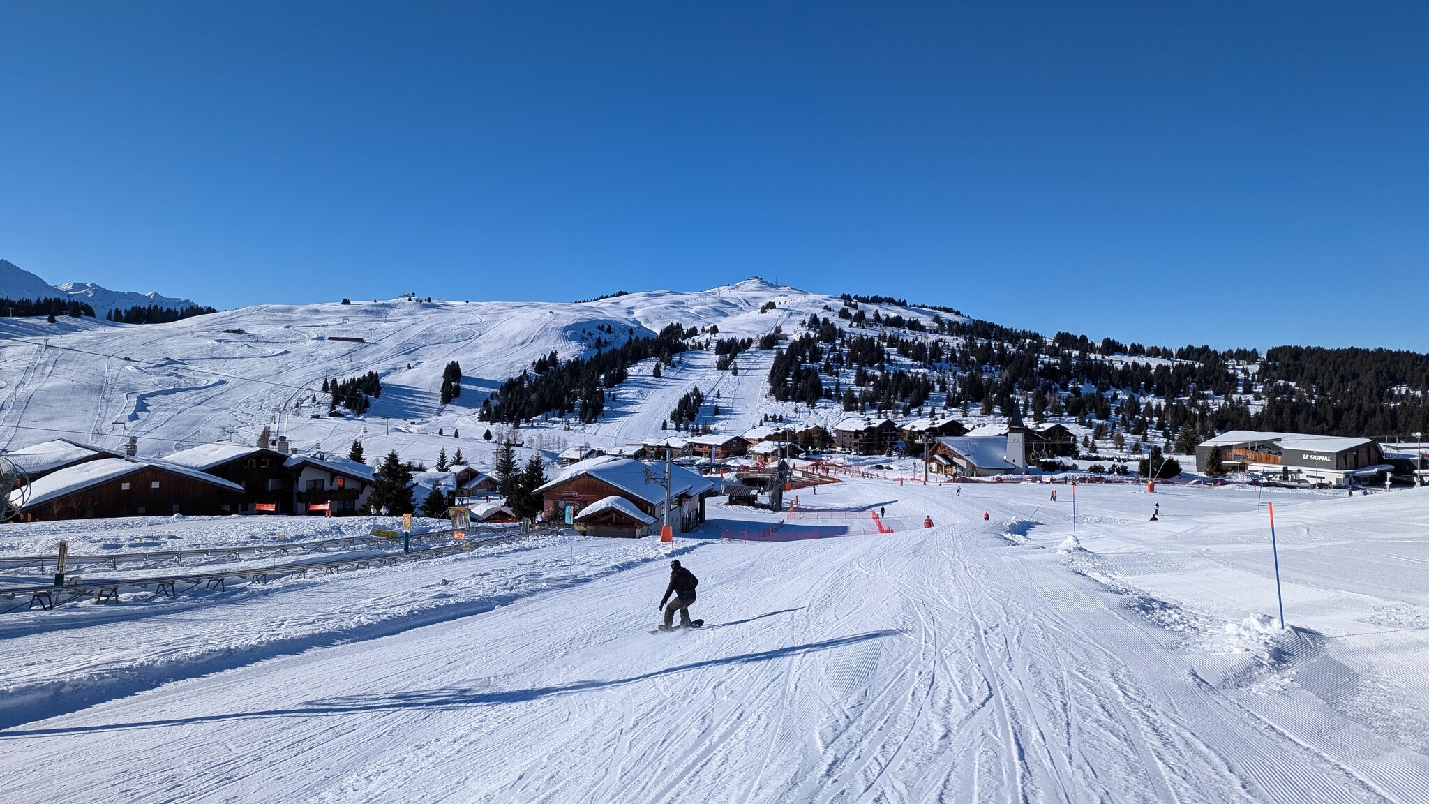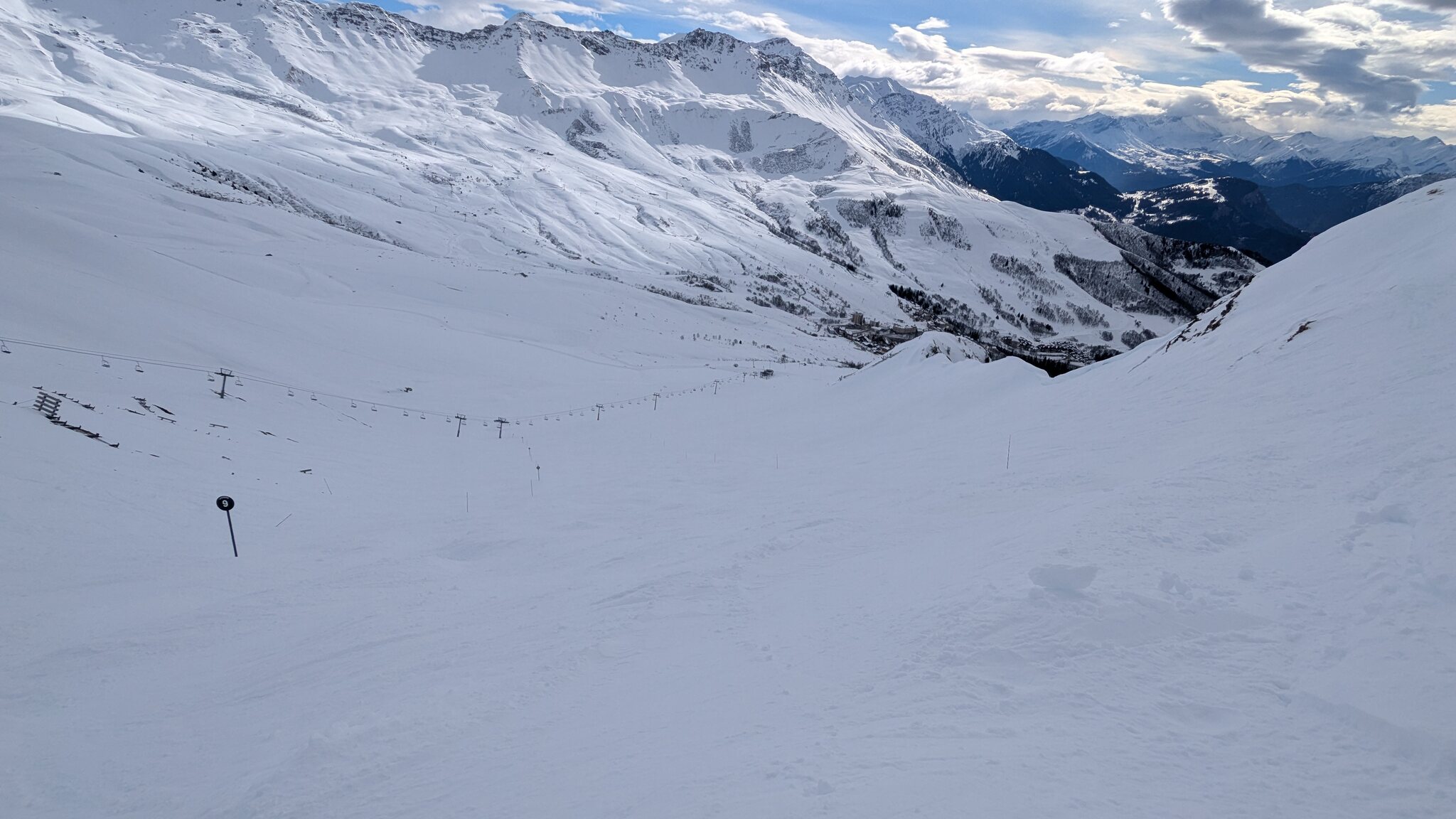 Der weiterführendende Schlepplift öffnet erst um 9:25, daher geht's erst runter Richtung Doucy. Das ist schon etwas Schade, weil die Lifte aus Valmorel schon um 9:00 Uhr öffnen...