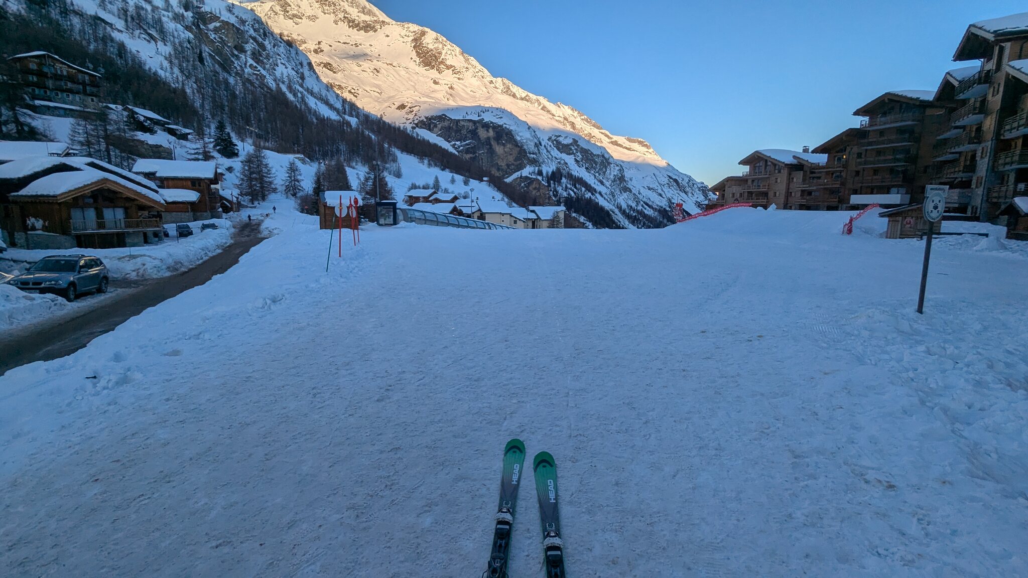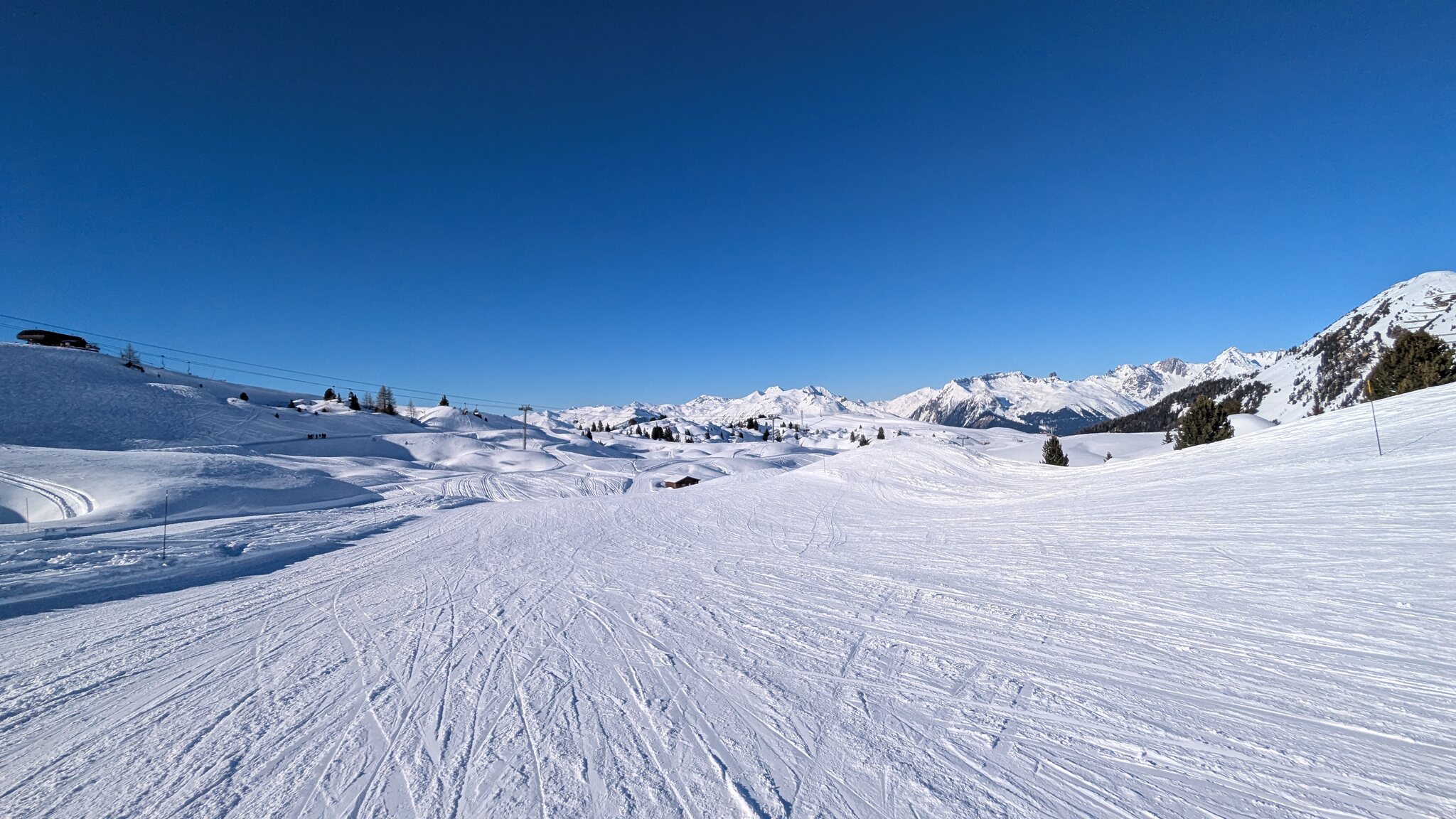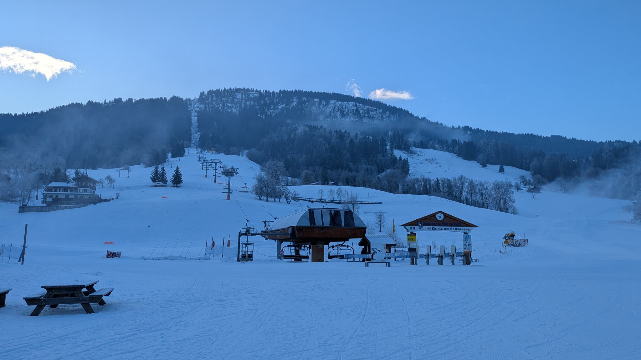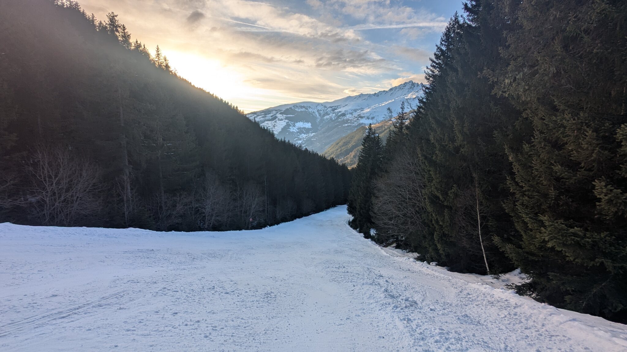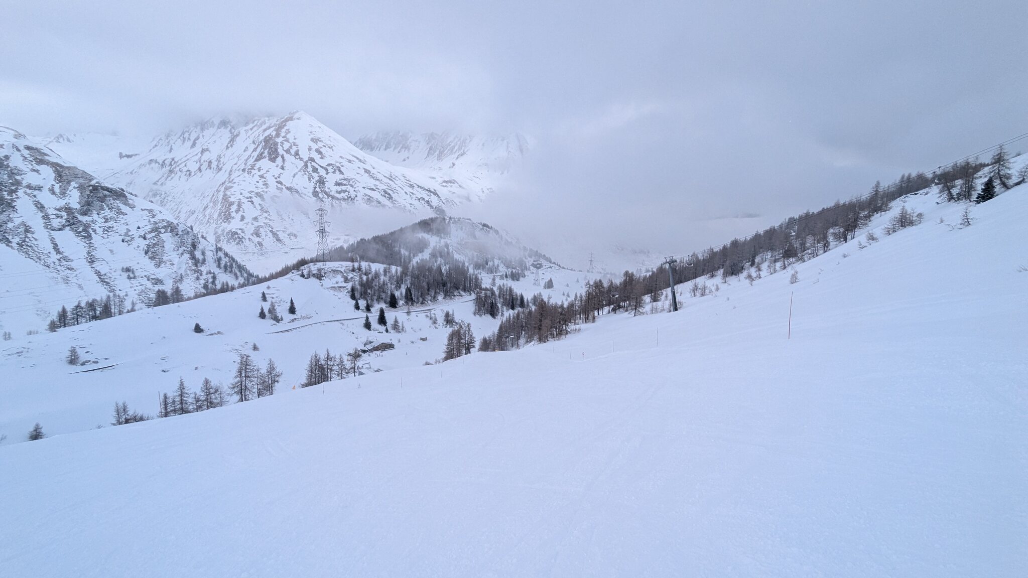 Der weiterführendende Schlepplift öffnet erst um 9:25, daher geht's erst runter Richtung Doucy. Das ist schon etwas Schade, weil die Lifte aus Valmorel schon um 9:00 Uhr öffnen...