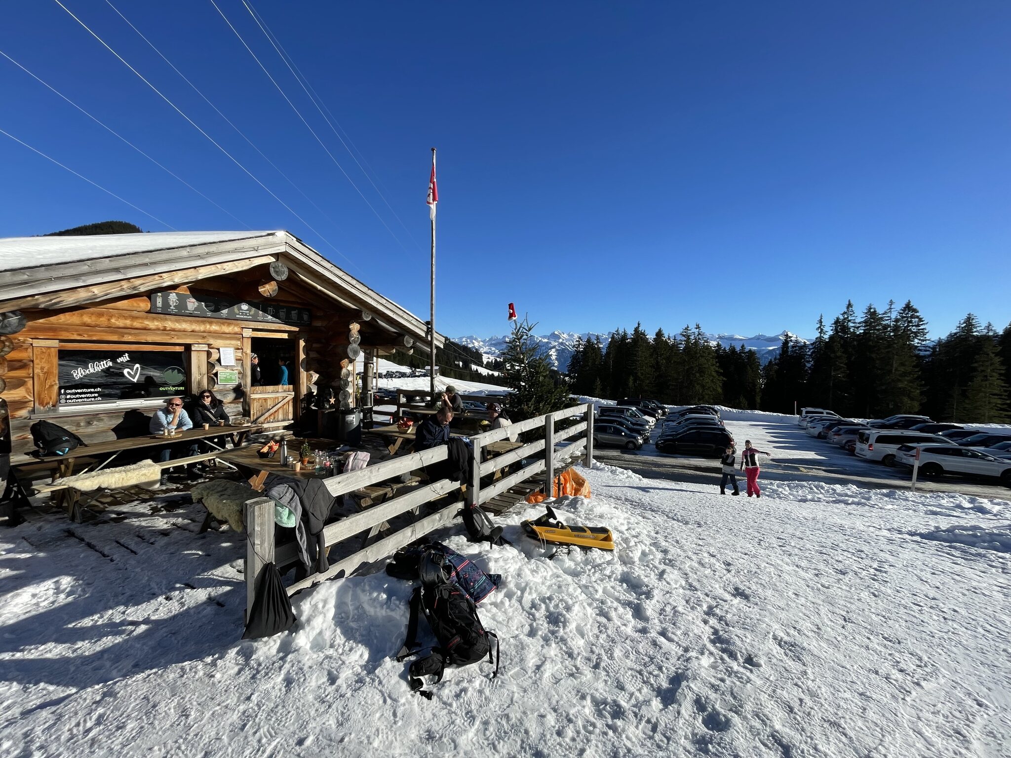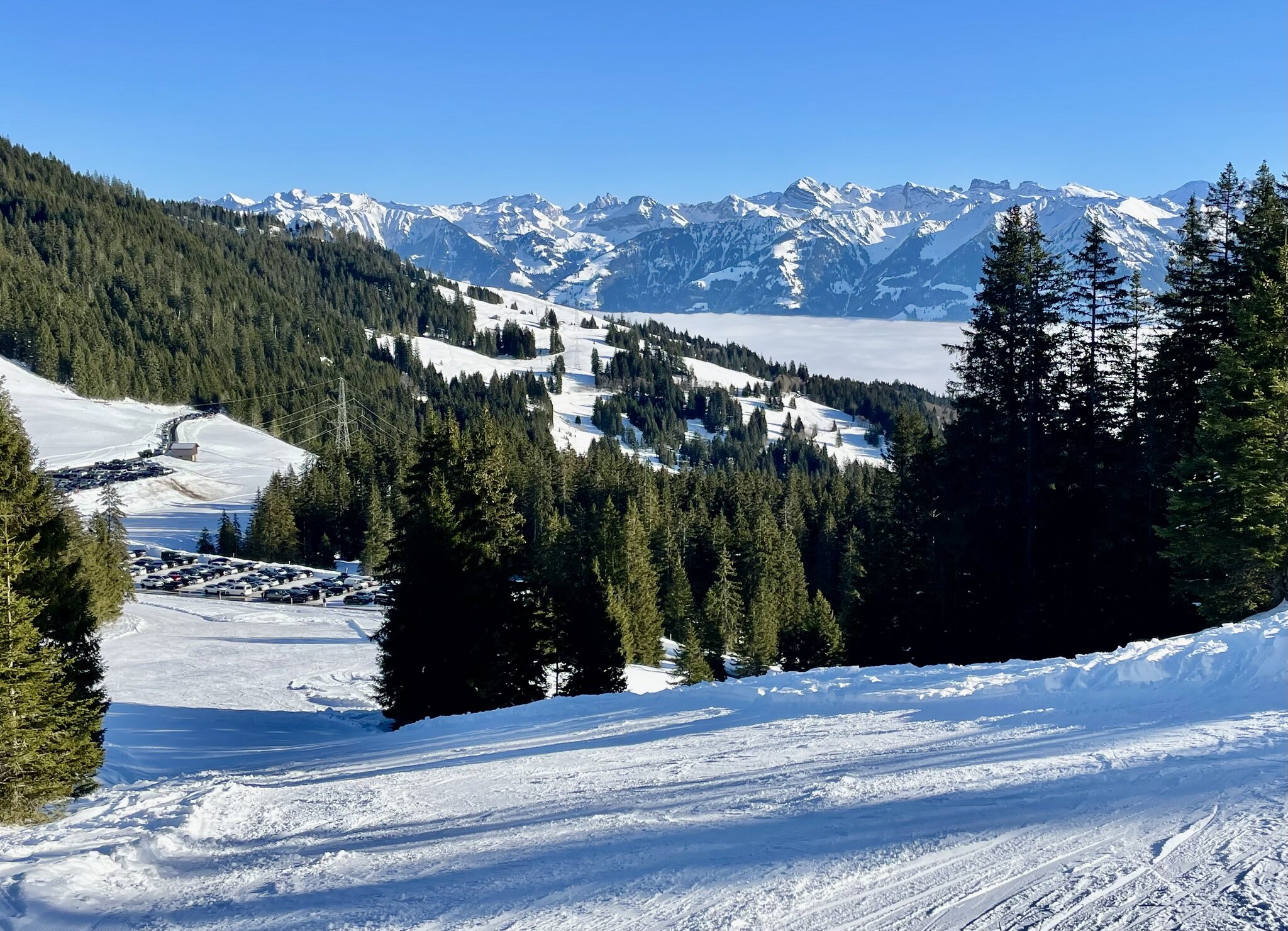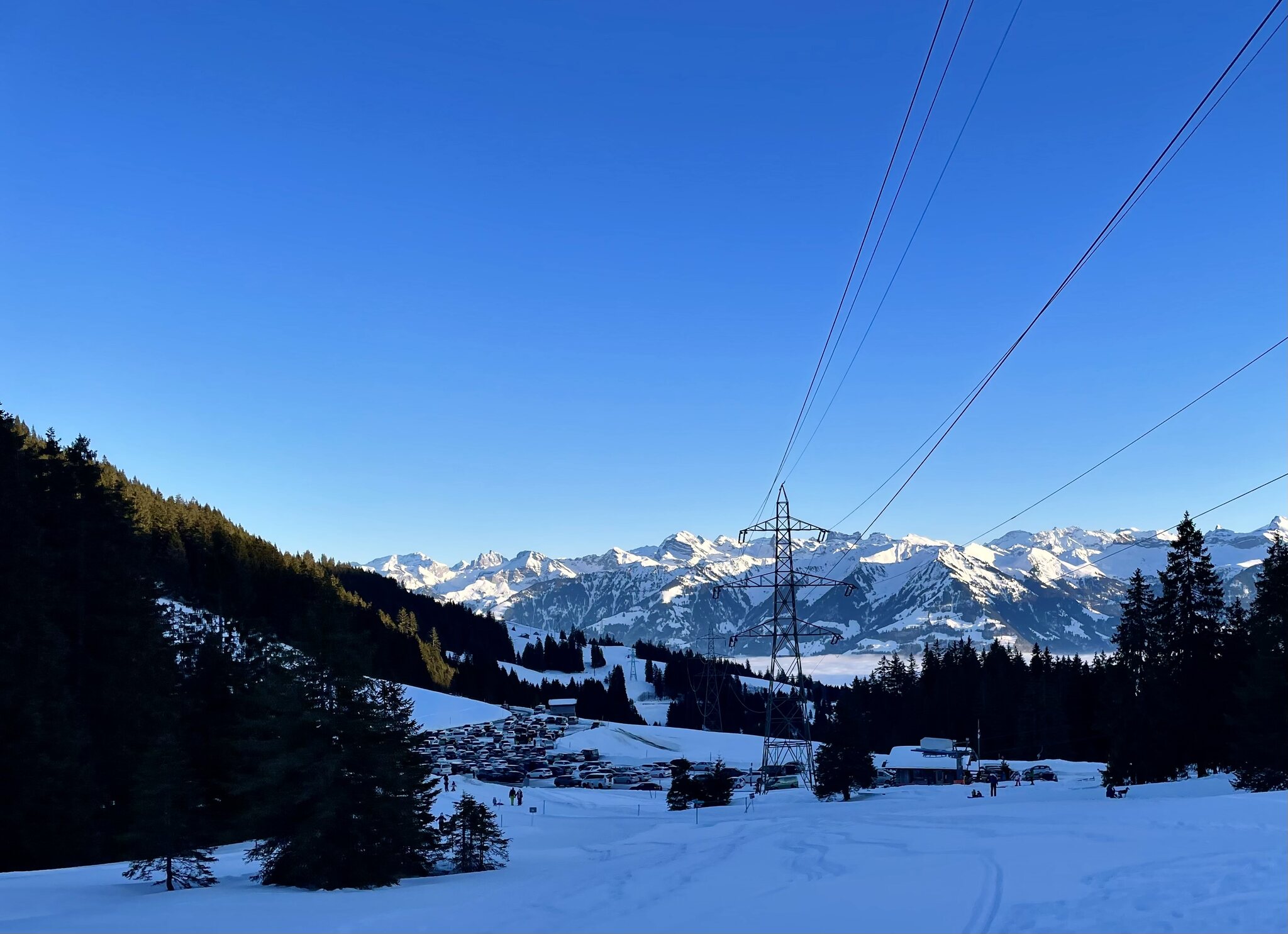 Nach der Anfahrt auf der gut ausgebauten zweispurigen Passstrasse zum Glaubenberg erreichten wir das Ende einer Autokolonne, kurzer Schock ob sogar auch dieses kleine Gebiet in den Weihnachtsferien überfüllt ist... Der grosse Parkplatz ist voll und Platzeinweiser geben dem vordersten Auto nach verlassen eines anderen Besucher dessen Platz frei. Um 13:30 angekommen sehen wir, dass die meisten Langläufer sind. Glück gehabt.