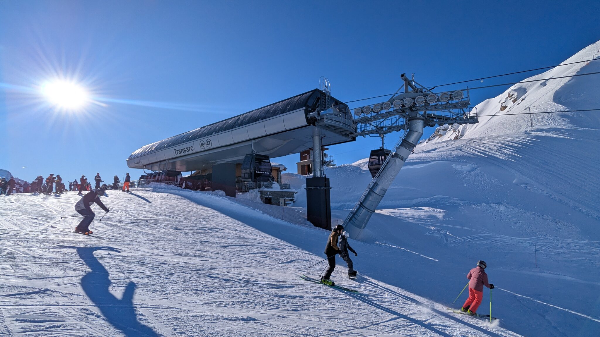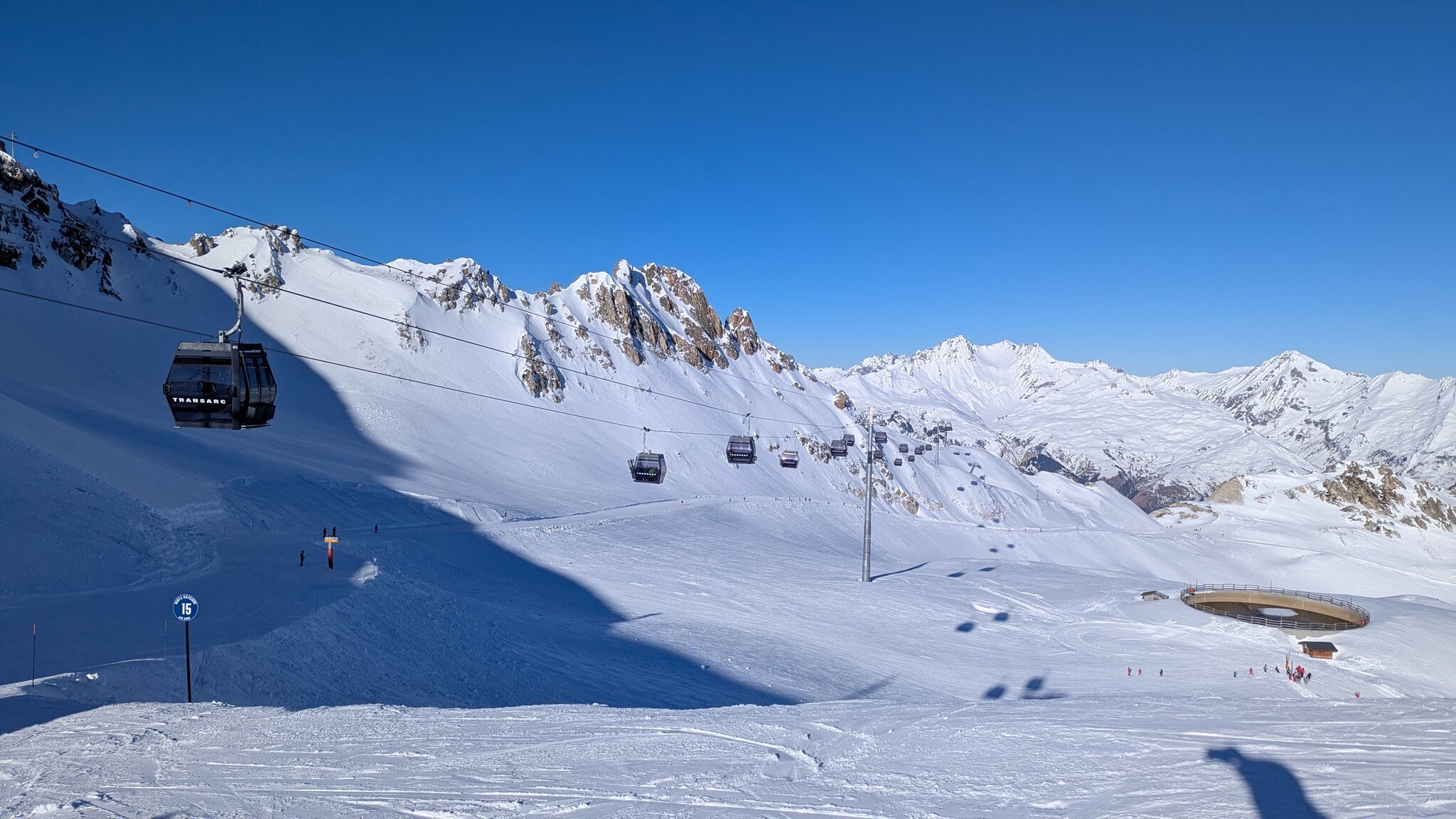 Klar, die direkte Linienführung wäre schneller um von unten nach oben zu kommen, aber mit der generell schnelleren Bahn ist man nun trotzdem etwas schneller oben, plus dass man mit den einzelnen Sektionen viele neue Möglichkeiten bekommt: Z.B. von Plagne Centre per Funiplagne und zweitere Sektion Roche de Mio direkter nach oben. Oder bei überfüllter TSD Carella einfach die zweite Sektion nehmen. Anders herum können bei überfüllter TSD Blanchets einfach die erste Sektion nehmen um die blauen Carving Pisten zu nutzen, oder um auf die Südseite zu gelangen. Also es gibt auf jeden Fall mehr Möglichkeiten, dass sich Spitzen in der Nachfrage besser verteilen.