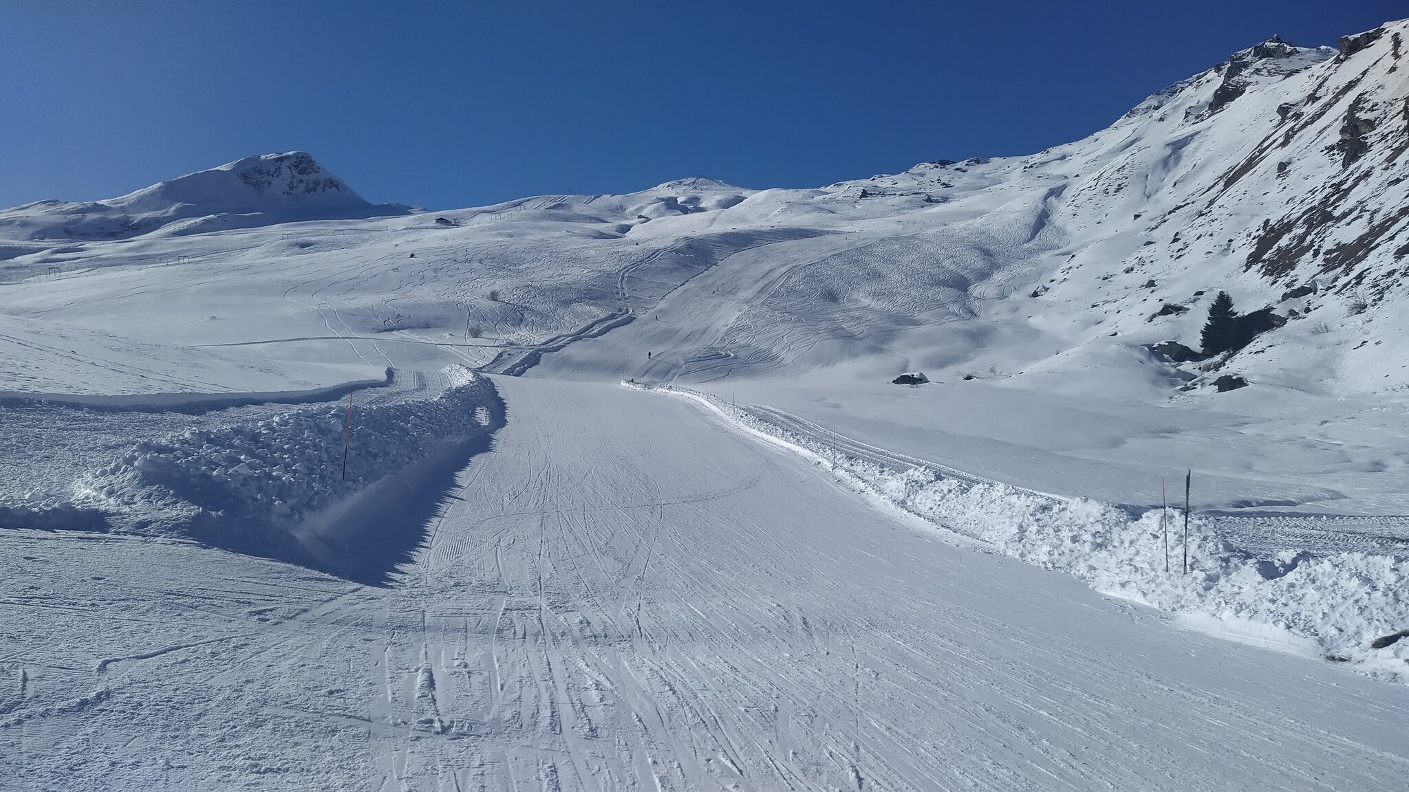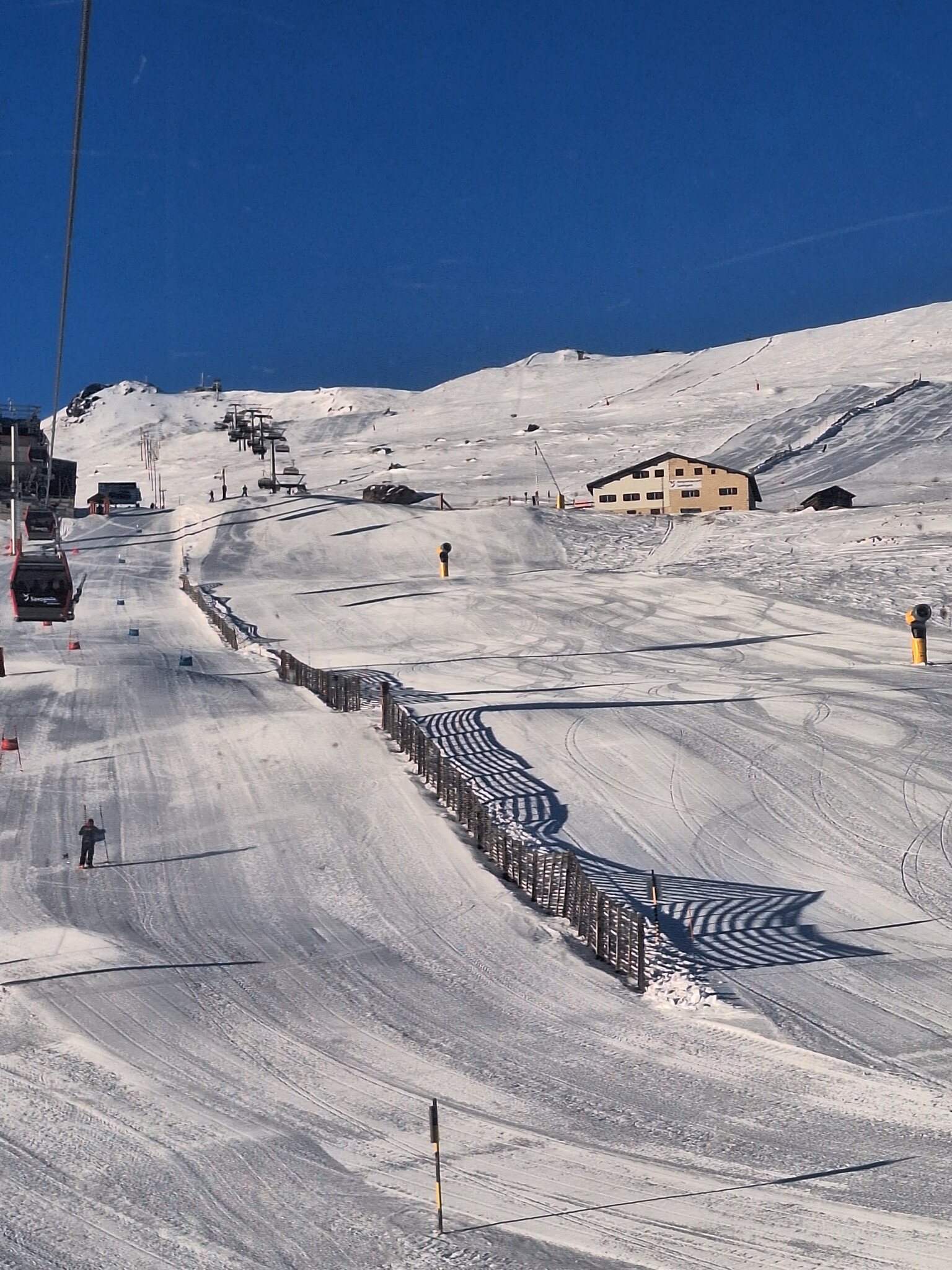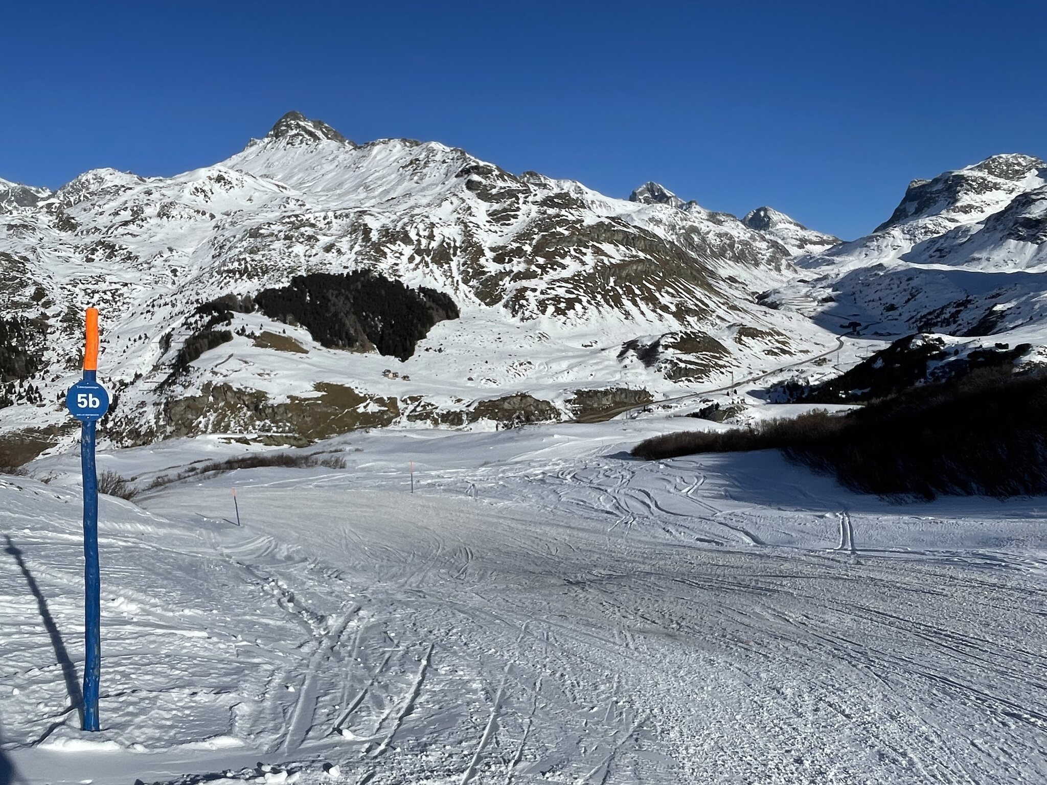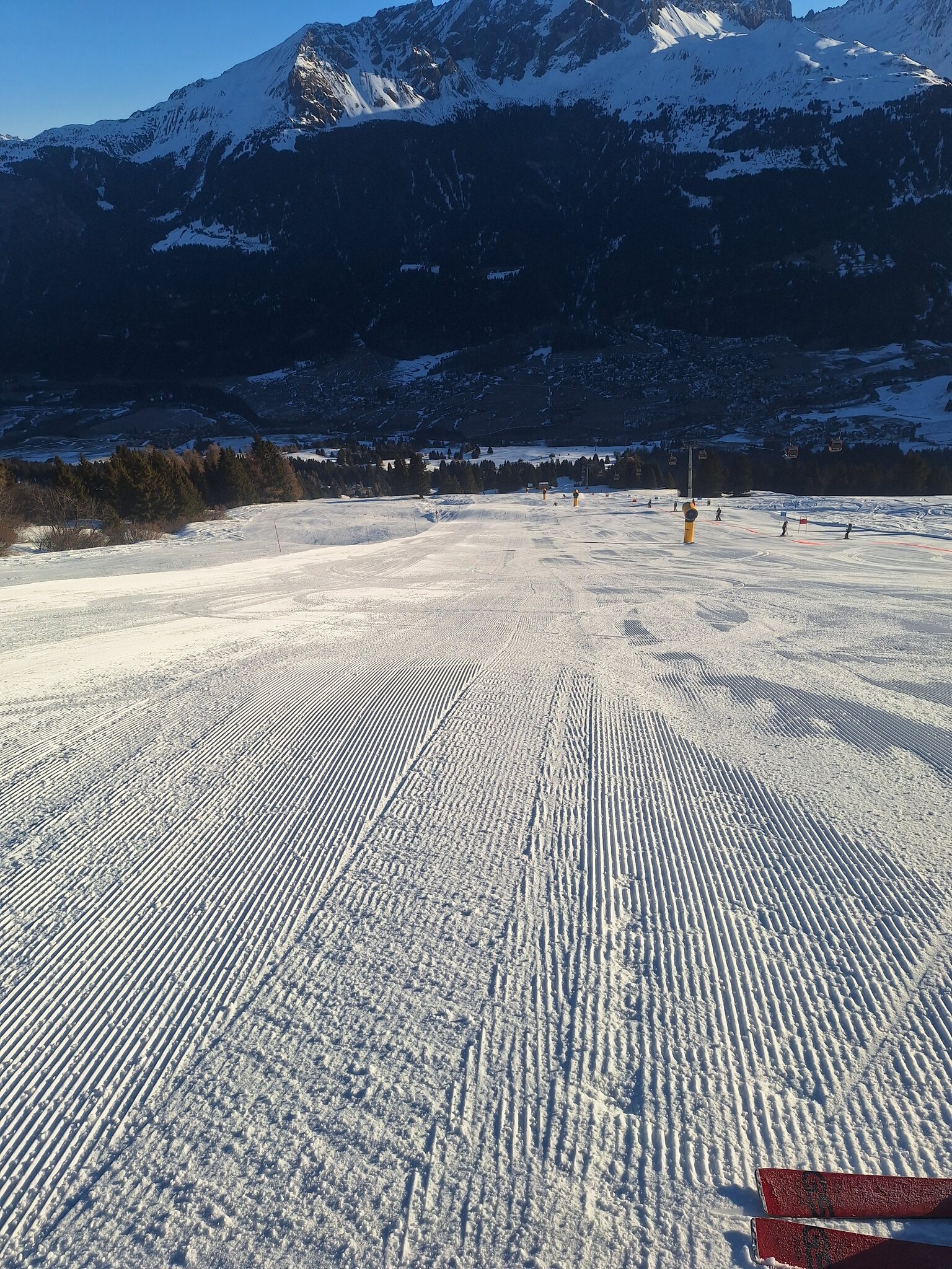 Die offenen Pisten am SL Tua und insbesondere beim SL Al Cant waren sehr steinig, da hätte ich lieber die alten Ski gehabt. Am SL Camon waren die Pisten top präpariert und ohne Steine, ich nehme an dort wurden alle vorhandenen Kanonen eingesetzt. Es hatte fast keine Leute auf den Pisten. Sonne satt.