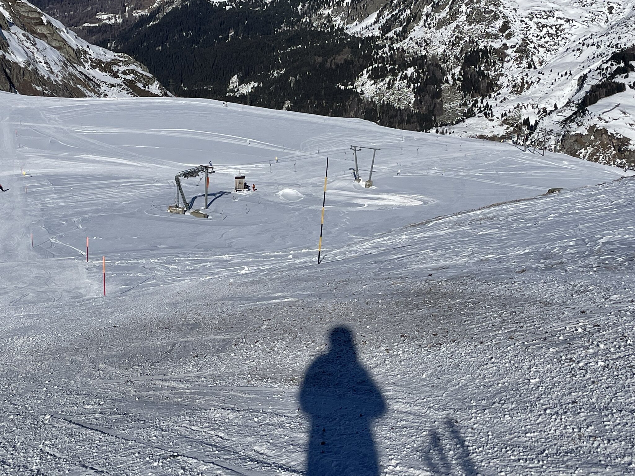 Da es am letzten Hang keinen Schnee mehr hat, wurde die Piste in die Mulde links verlegt.