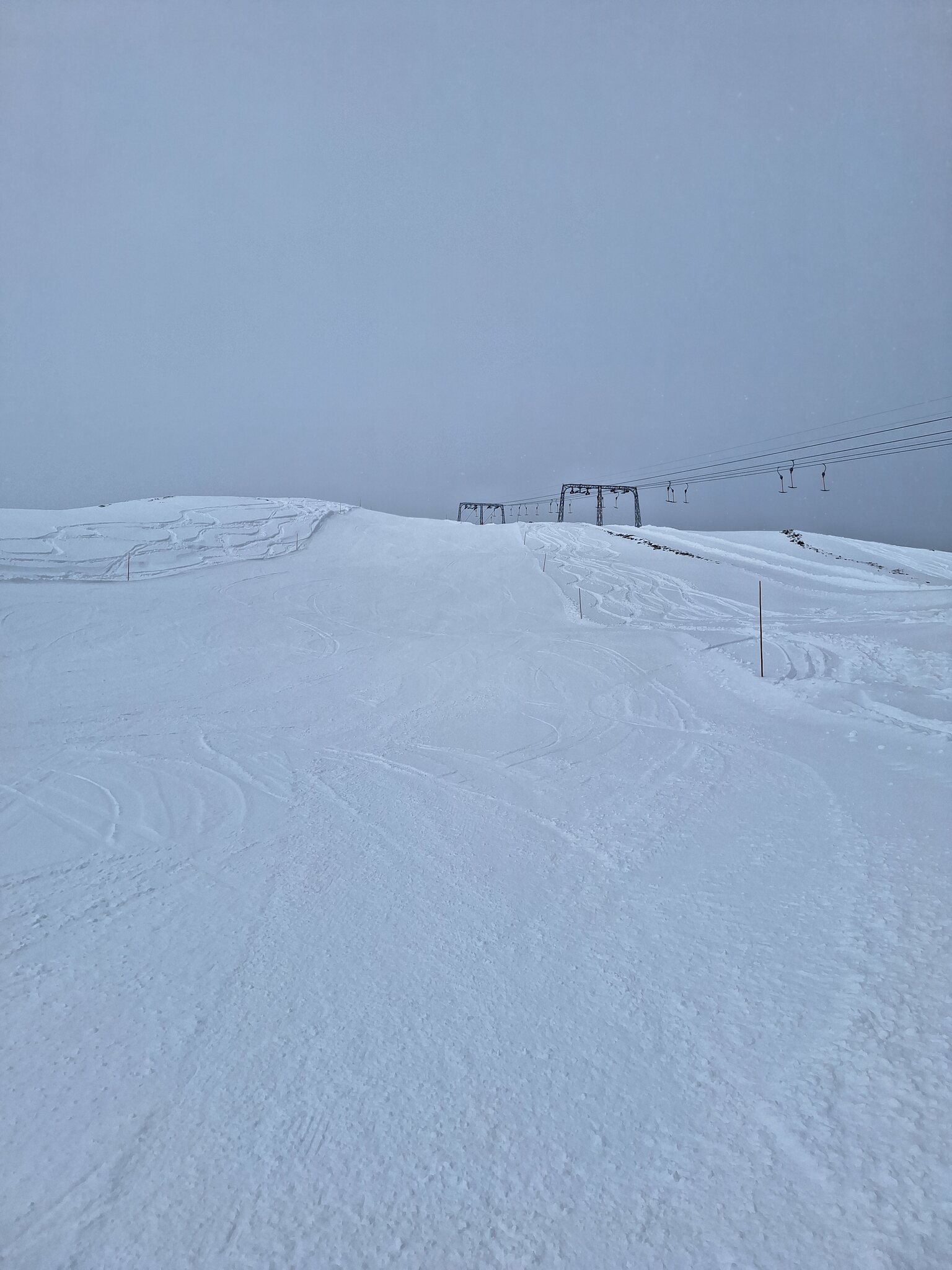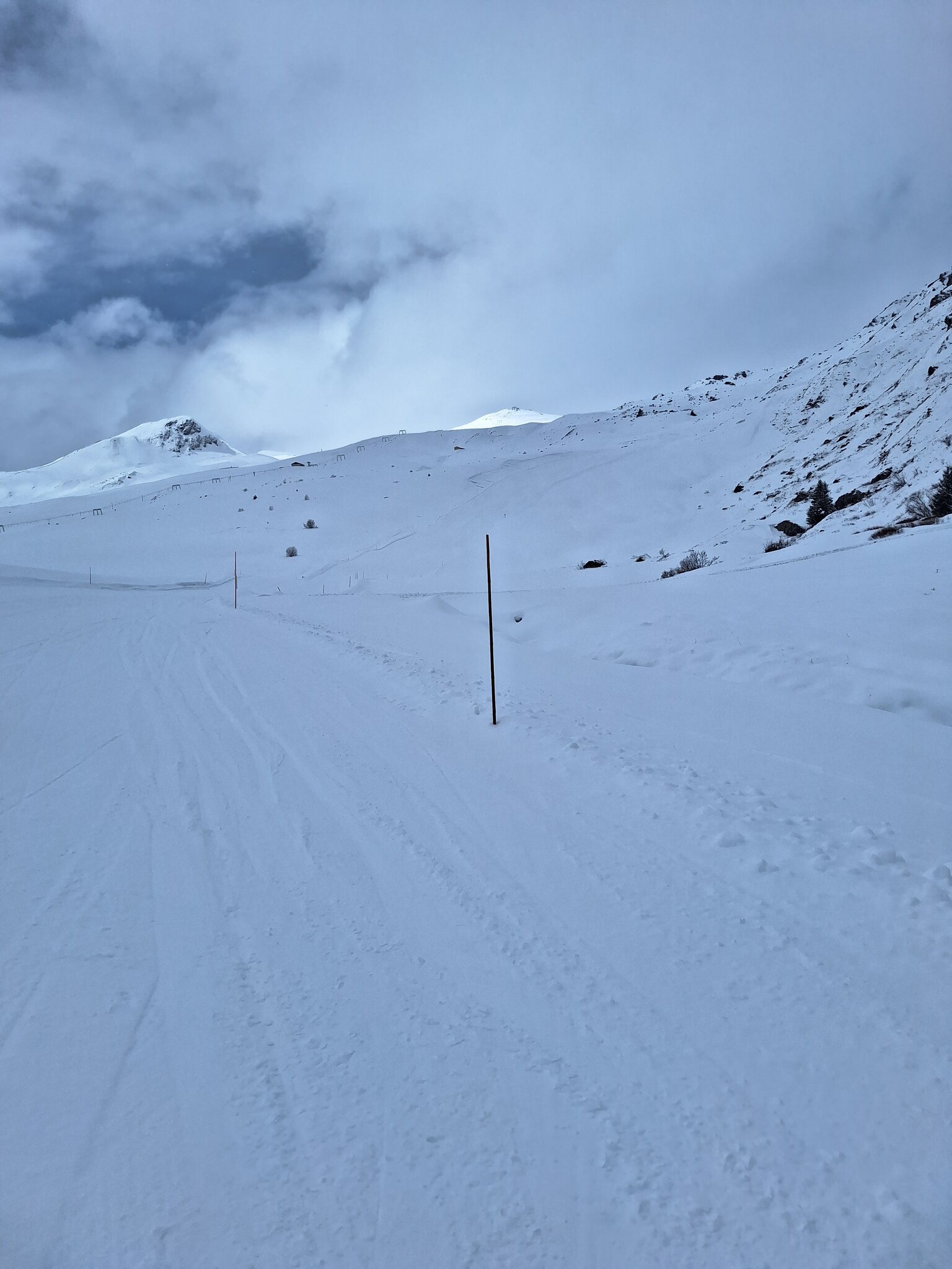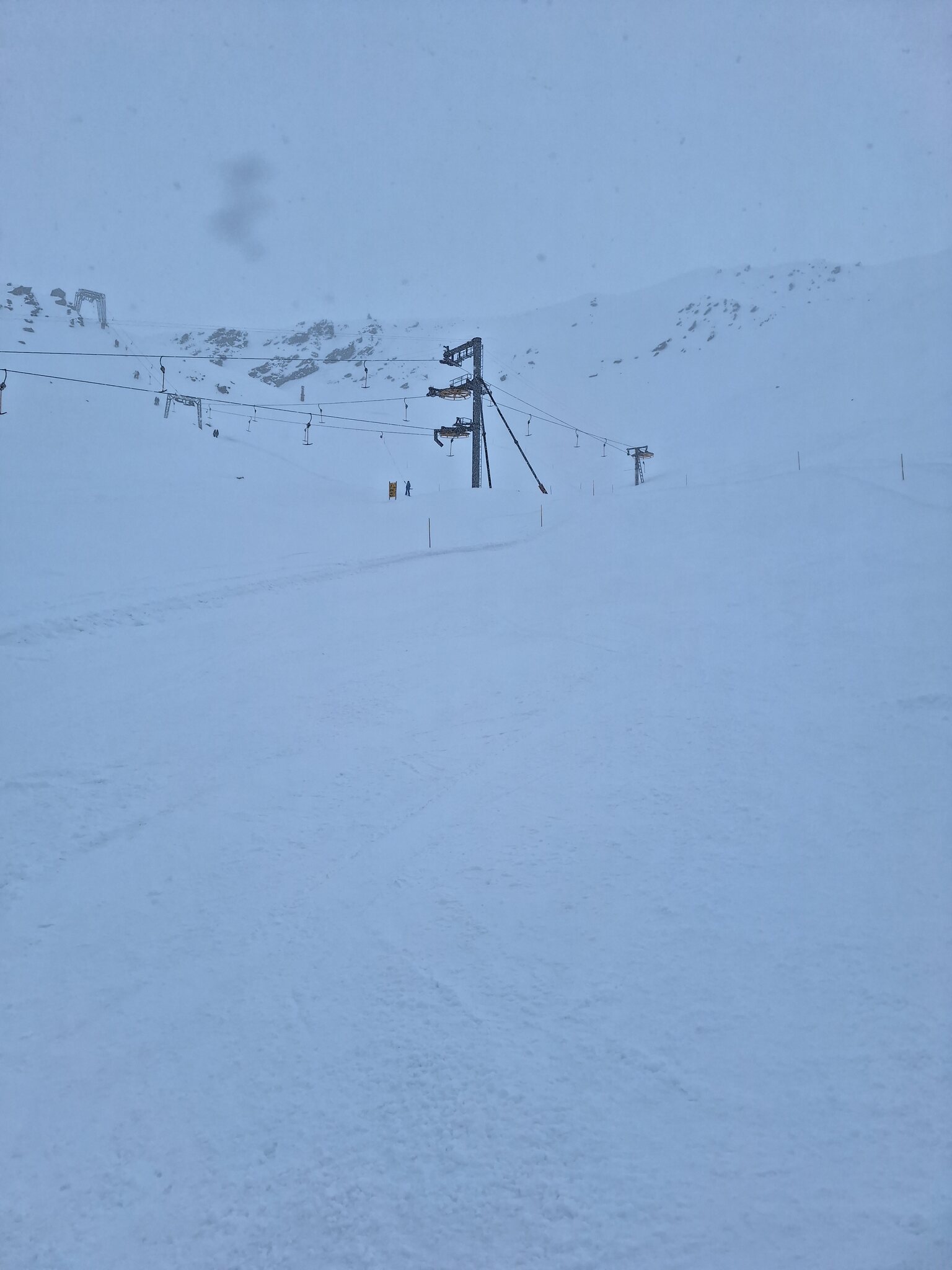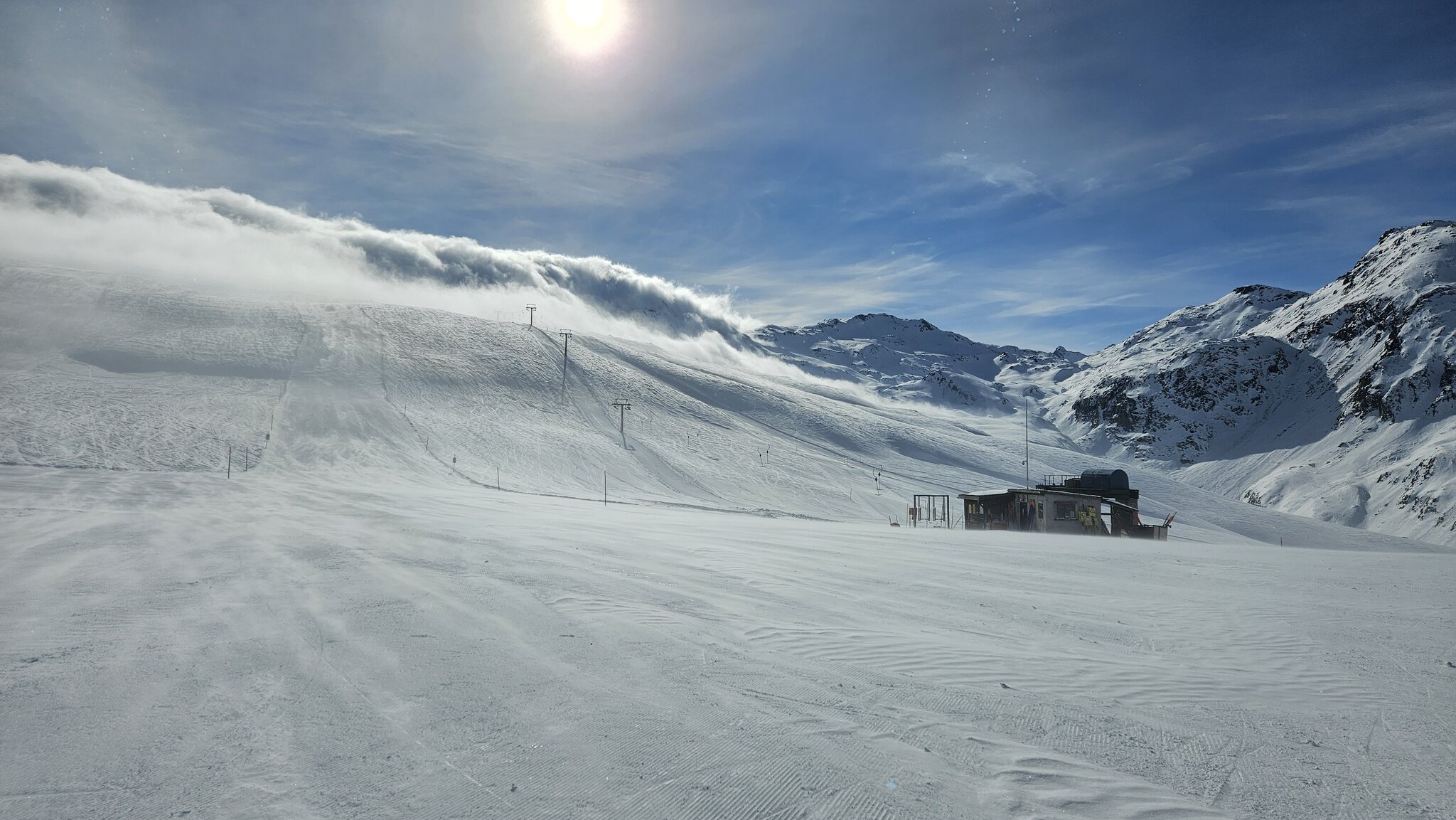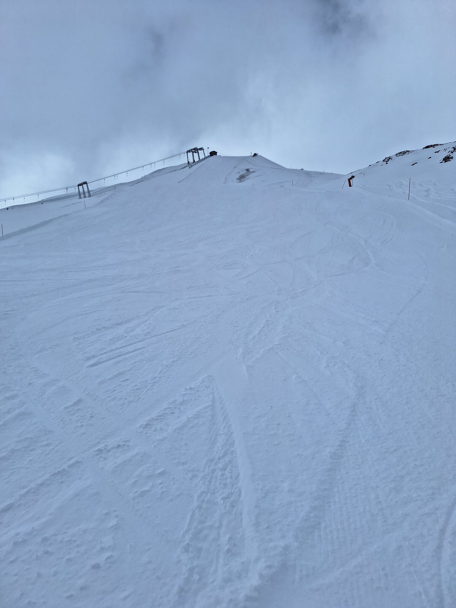 Der Schnee ist leider noch immer sehr knapp. Überall viele Steine. Alles verblasen. Und dazu kommt ein starker, extrem kalter Wind der auch immer Wolken oben rüber brachte. Der obere Drittel vom Skilift Al Cant war immer in den Wolken.