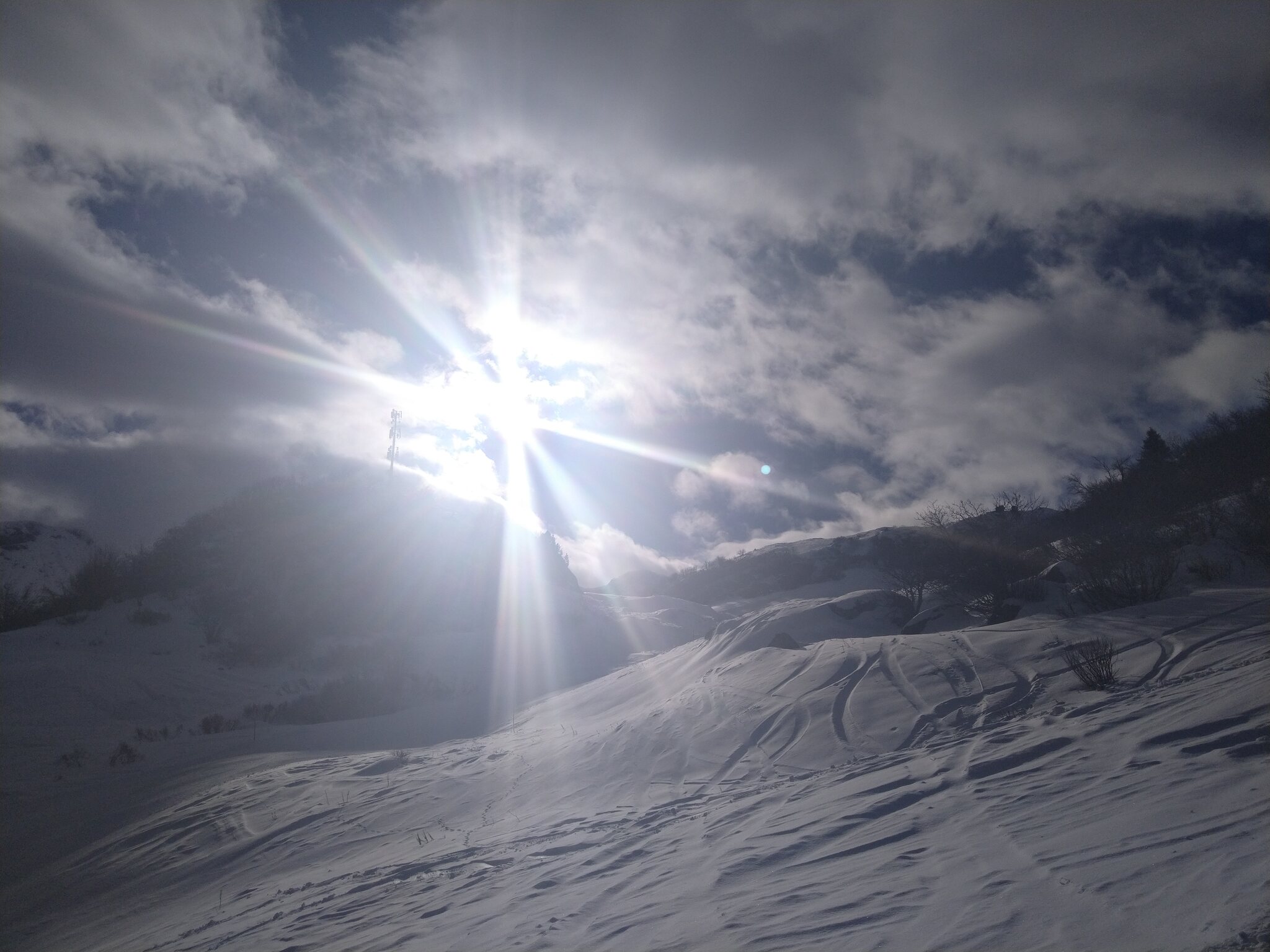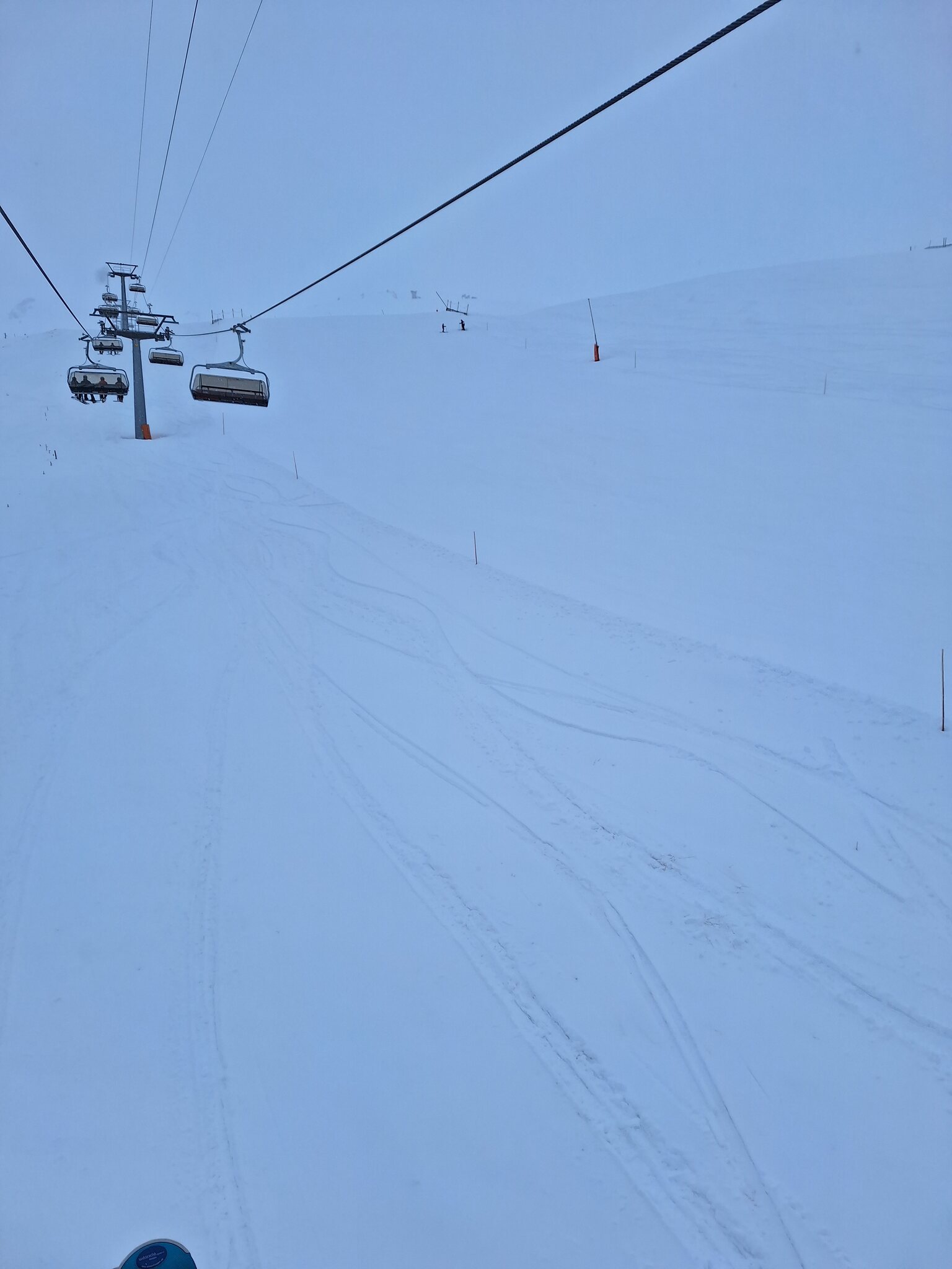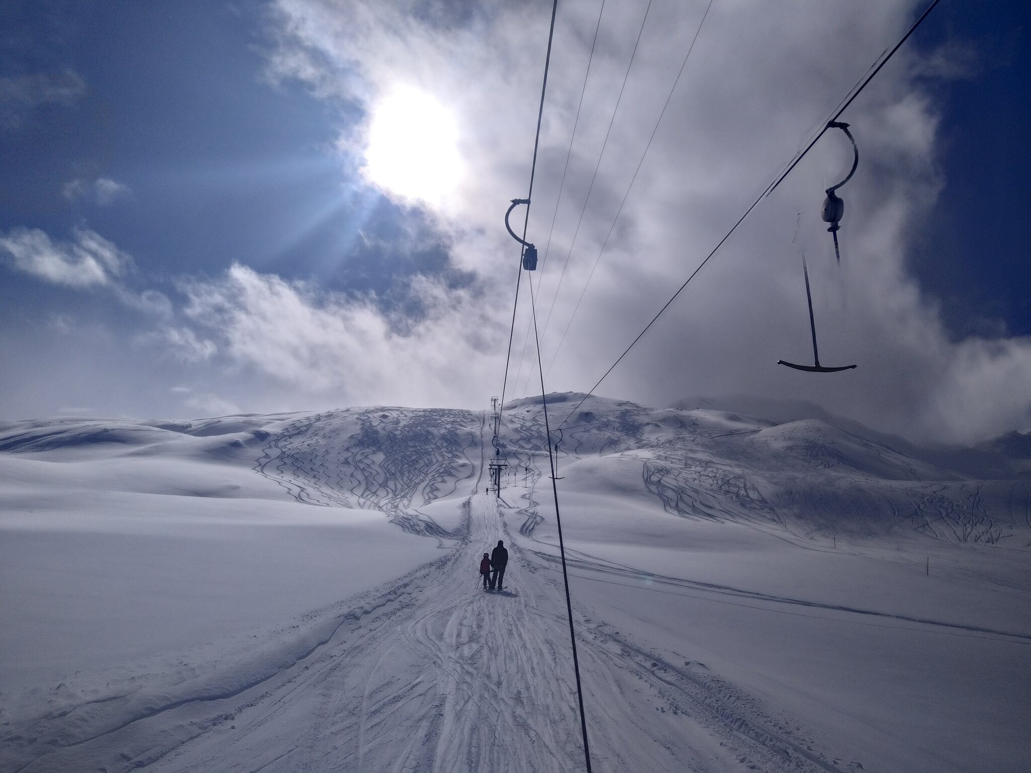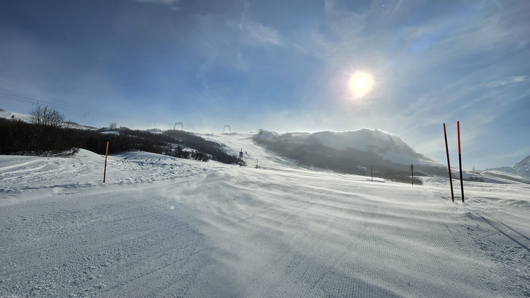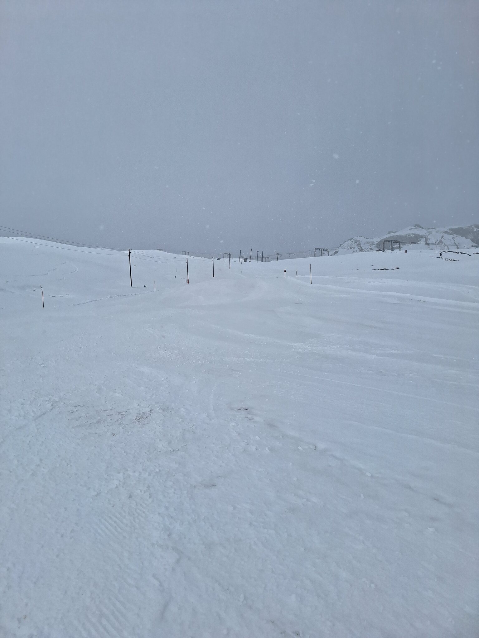 Der Schnee ist leider noch immer sehr knapp. Überall viele Steine. Alles verblasen. Und dazu kommt ein starker, extrem kalter Wind der auch immer Wolken oben rüber brachte. Der obere Drittel vom Skilift Al Cant war immer in den Wolken.