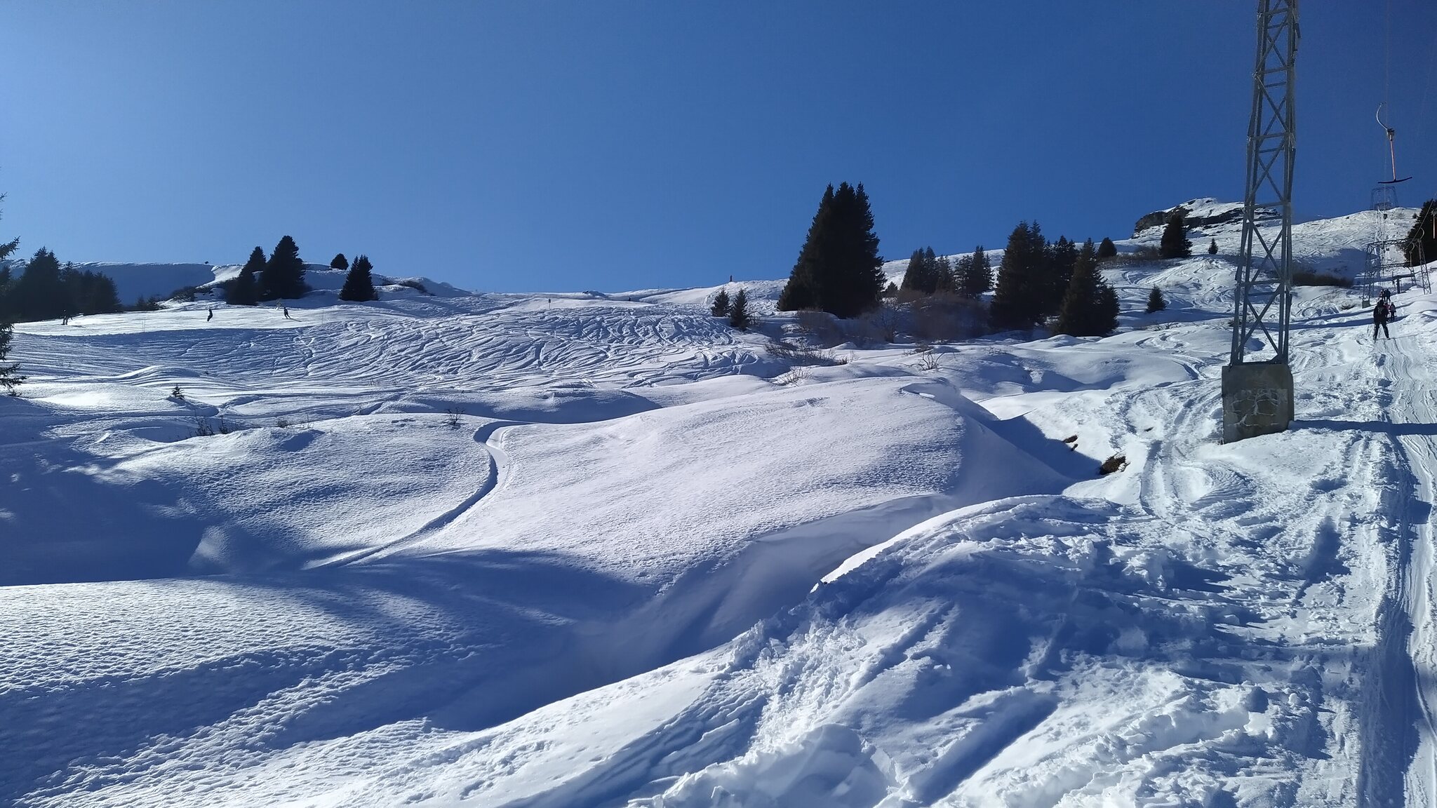 Das Gebiet hat mich begeistert. 3 richtig lange Skilifte, interessante Pisten, tolle Ausblicke. Der Föhn hat etwas Neuschnee hinübergedrückt, vor allem am oberen Lift. Tolle Pulverhänge. Wenig Steine, denen man ausweichen konnte.