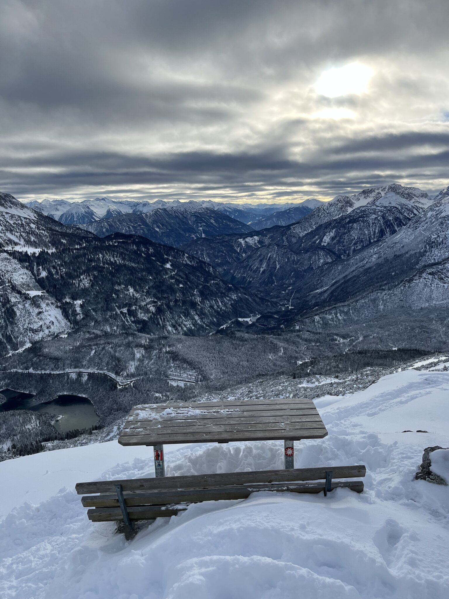 Heute Tour durch die Tiroler Zugspitzarena, Beginn in Lermoos. Wetter mit Inversion oben wärmer als unten. Sonnig ohne Wolken, im Alpenvorland hängt noch Nebel.