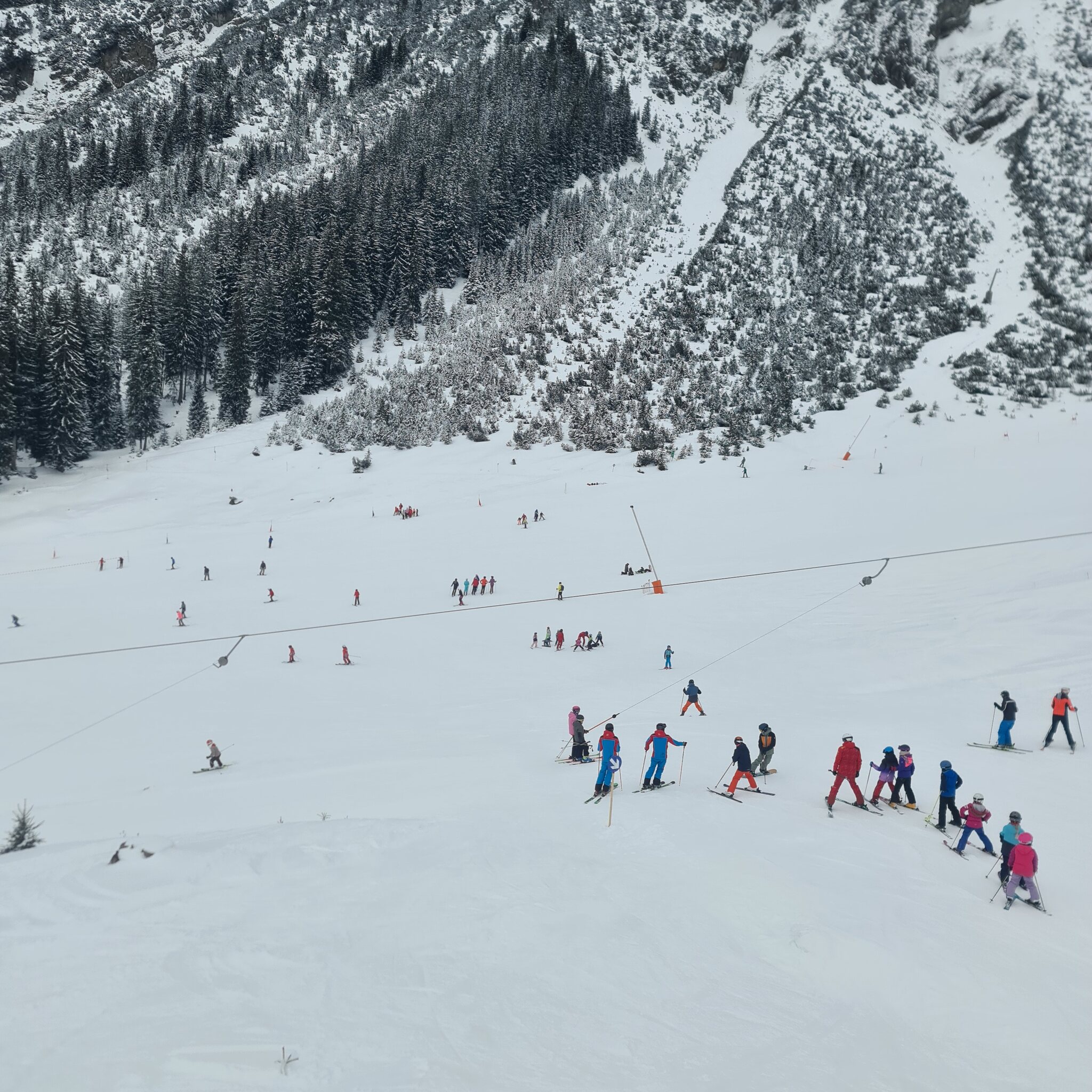 Für einen Sonntag und Tagesgastgebiet fand ich es ziemlich leer in Berwang, der Parkplatz in Bichlbach war nicht mal halb voll. Die Urlauber, großteils Holländer waren auch nur auf den blauen Pisten unterwegs. Anstehen musste man quasi nie, maximal 2-3 FBM.