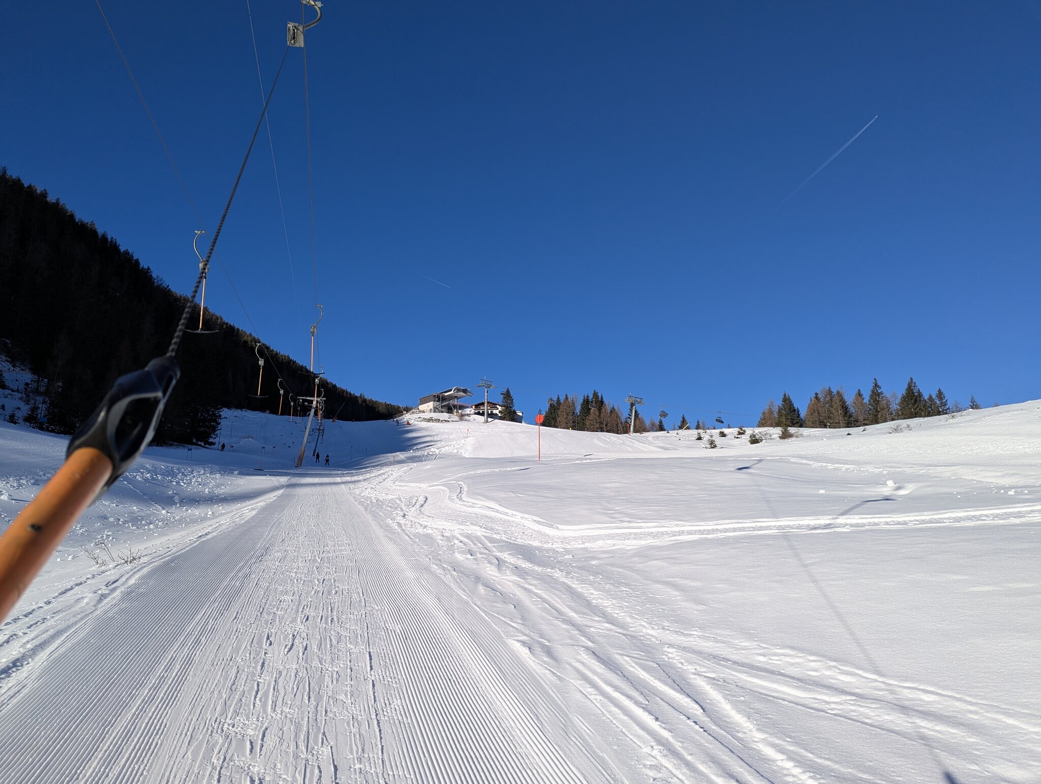 Am Rastkopf ohne Beschneiung merkt man natürlich die mangelnde Naturschneelage. Sie haben aber das Maximum herausgeholt, große Steine gibt es keine nur manchmal etwas Kießel. Pisten dort sehr griffig da ja nur Naturschnee, dadurch machte es doch viel Spaß dort. Maken im Ski habe ich mir auch keine geholt. Der Verbindungsweg rüber war sehr wellig. Die Abfahrt nach Rinnen wird die kommende Wärmeperiode nicht durchhalten, hat nun schon schneefreie Stellen. Da ist es dort abseits deutlich besser, wobei der Ziehweg im Wald auch kaum noch Substanz hat.