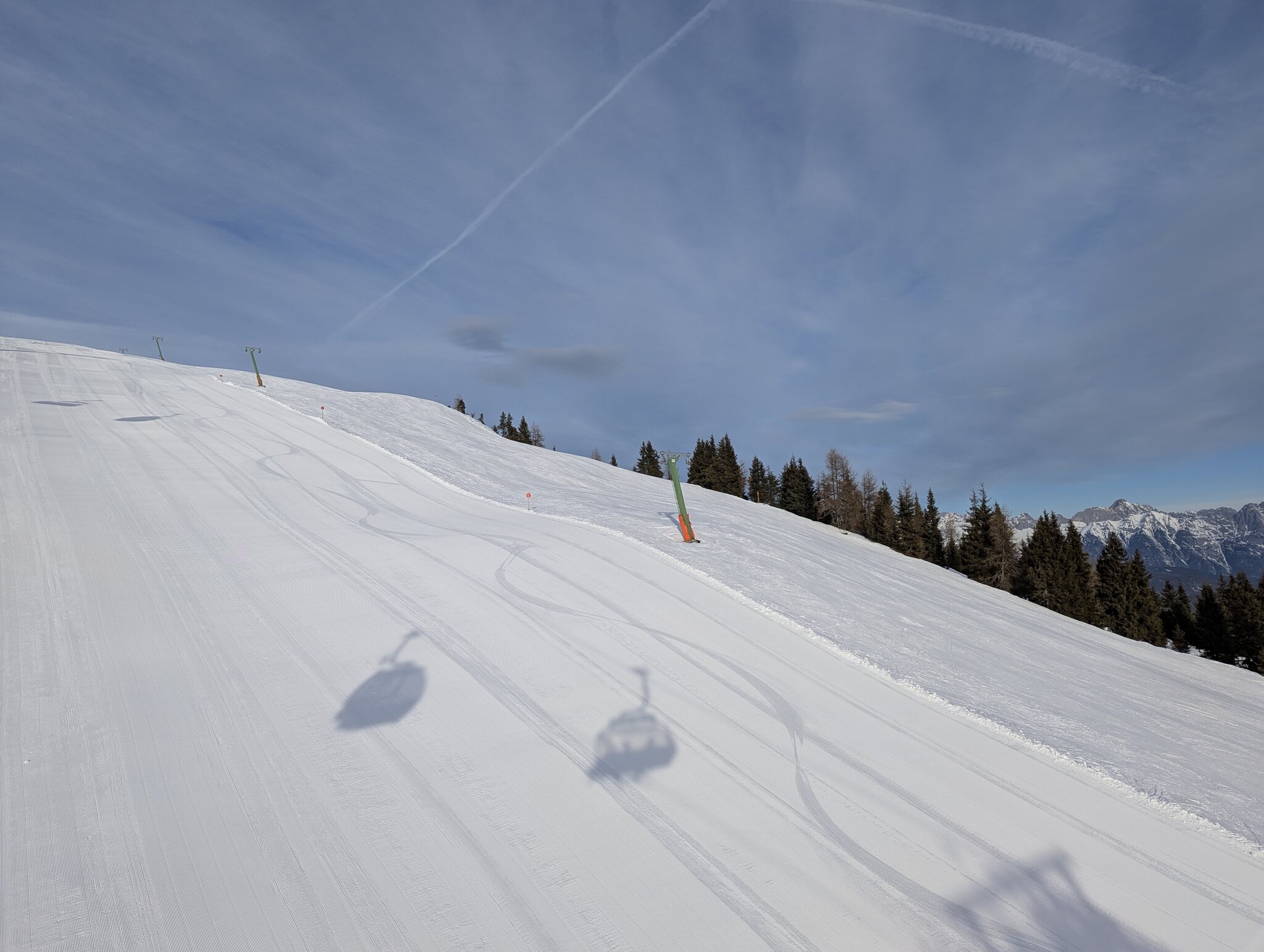 Am Vormittag herrschten gute Pistenverhältnisse am Rangger Köpfl. Bis dem Mittagessen gab es manchmal einige minuten Wartezeiten. Die Schneelage auf der oberen blauen Piste ist dünn.