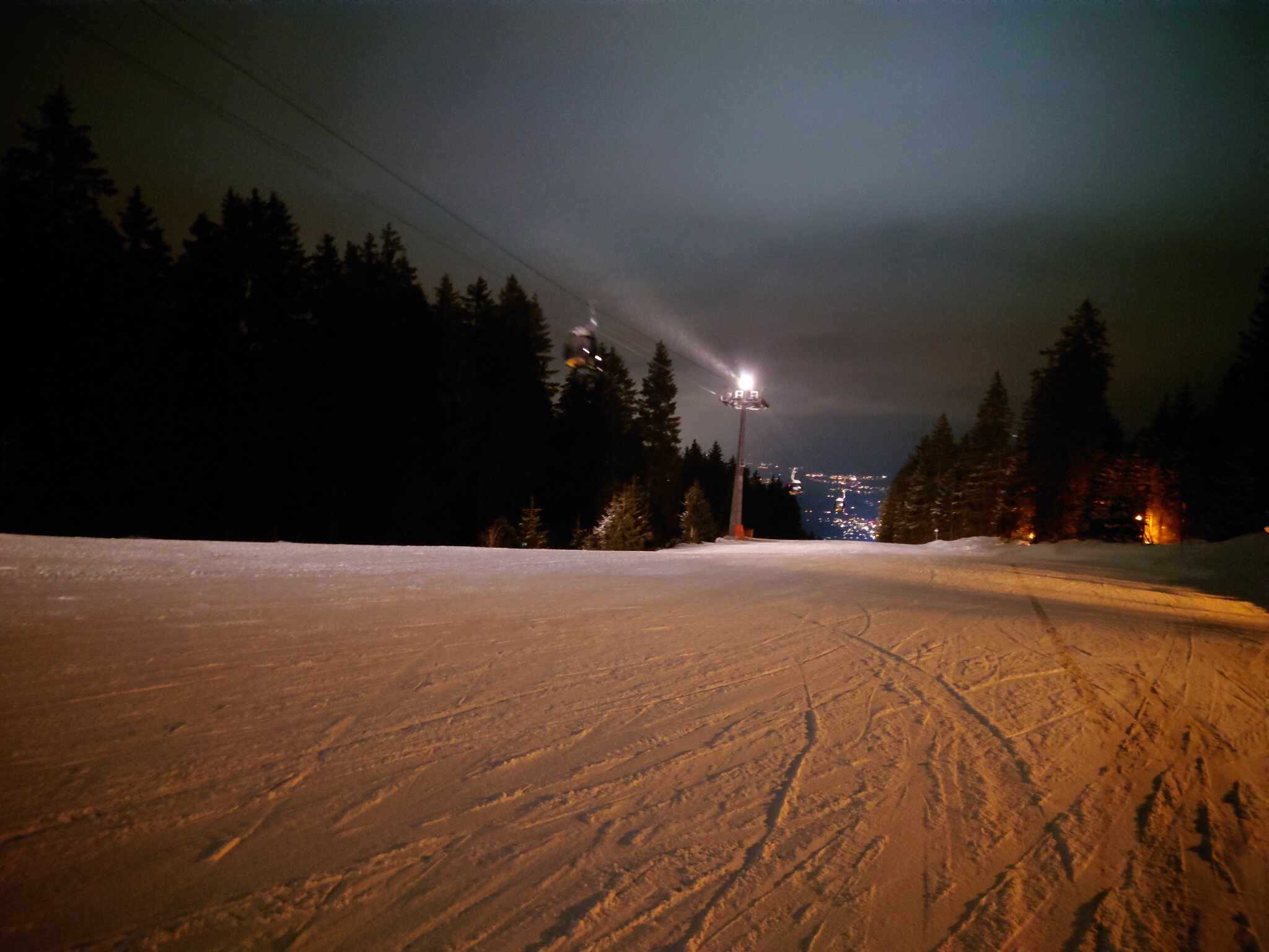 Heute habe ich einen Abendbesuch am Rangger Köpfl gemacht. Da hinten leuchtet schon die Piste, mit Tram, S-Bahn und Bus geht es jetzt dort hin