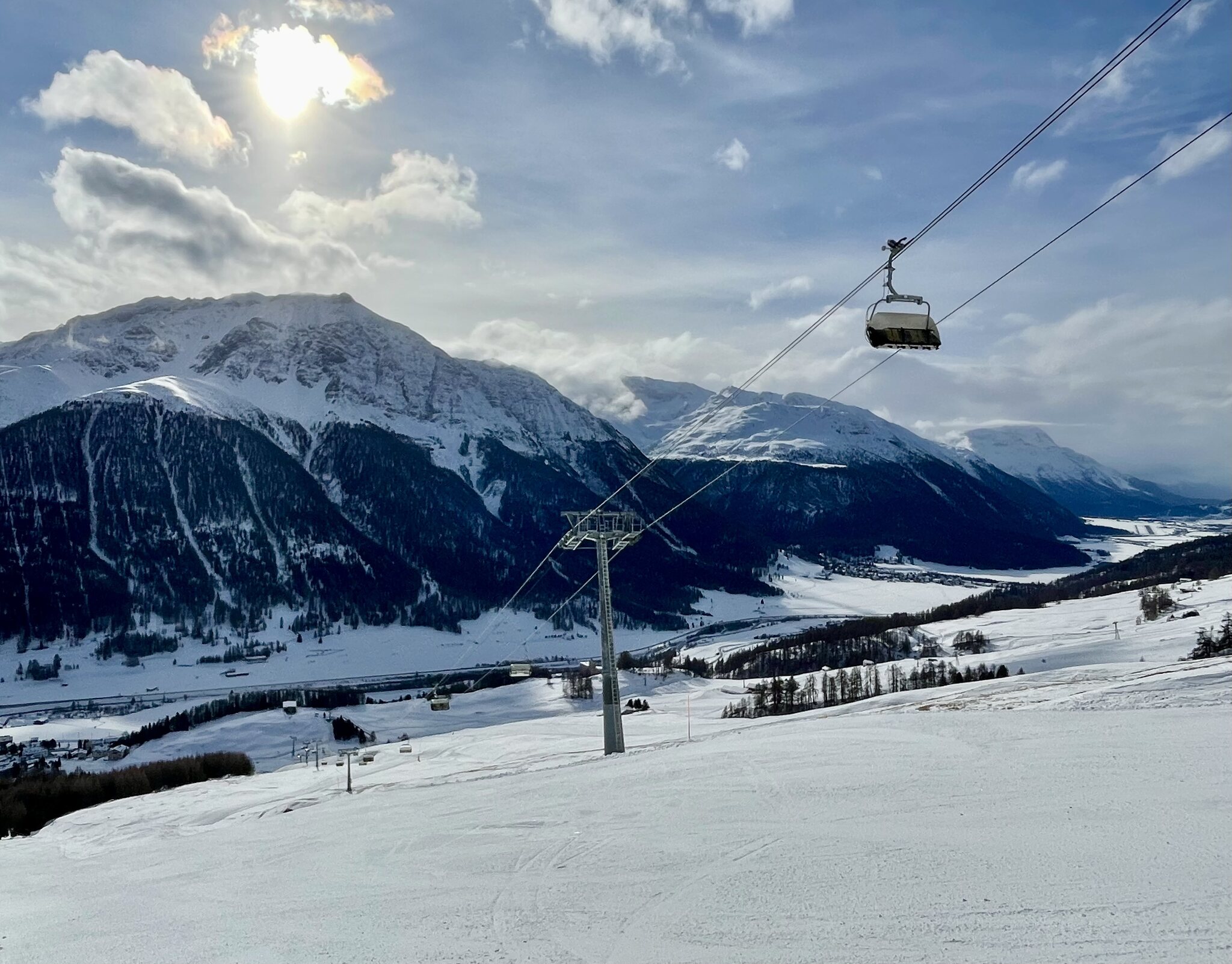 Am letzten Tag der Engadin-Ferien gings ins Corvatsch-Gebiet. Die Schneequalität ist durchwegs gut, Massen an Schnee sinds nicht aber immerhin ein wenig mehr wie an anderen Orten im Engadin. Die Pisten sind relativ gut Präpariert, an einigen Stellen ist es aber schon sehr knollig und rumpelig, halt kein Corviglia oder Zuoz-Niveau. Andrang war sehr gering. Insgesamt sehr spassiger Tag nur die immer wieder auftretenden rumpeligen Stellen waren störend. Wetter war teilsbewölkt mit sonnigen Phasen. Leider sind noch einige wichtige Anlagen und Pisten geschlossen. Bspw. Furtschellas, Giand‘Alva, Murtél, Hahnensee-Abfahrt, etc. So sinds dann 9/10