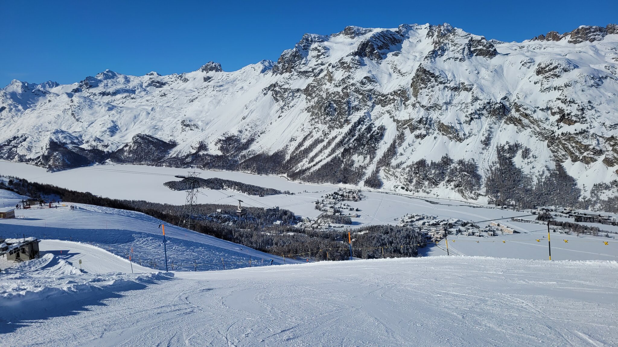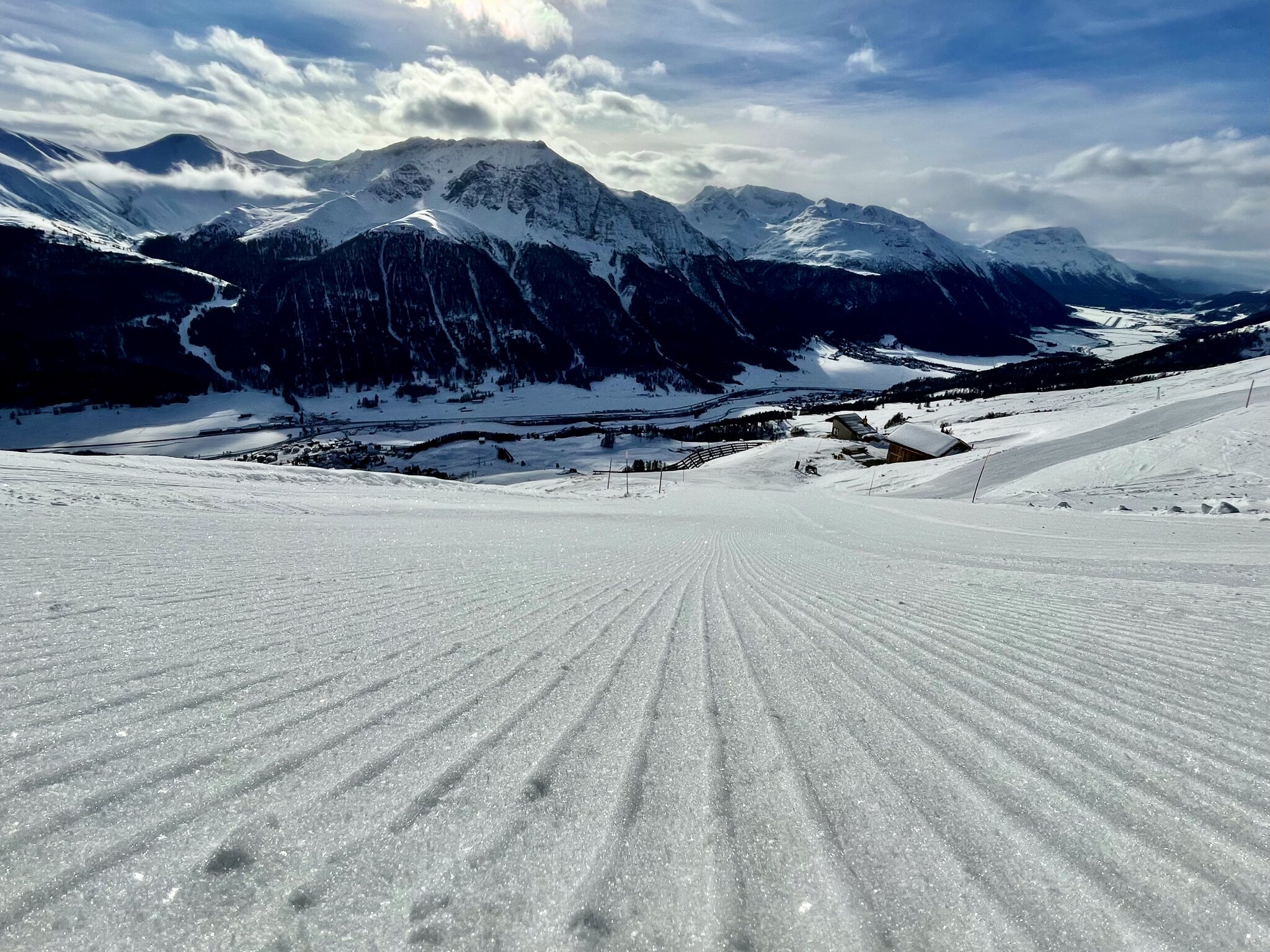 Zweite Runde Schlattain: Die Talabfahrt zur Signalbahn war auch top: Gut gefüllter Parkplatz: Weiter geht's zum Corvatsch. Einen besseren Start in die Woche kann ich mir kaum vorstellen, daher volle Punktzahl.