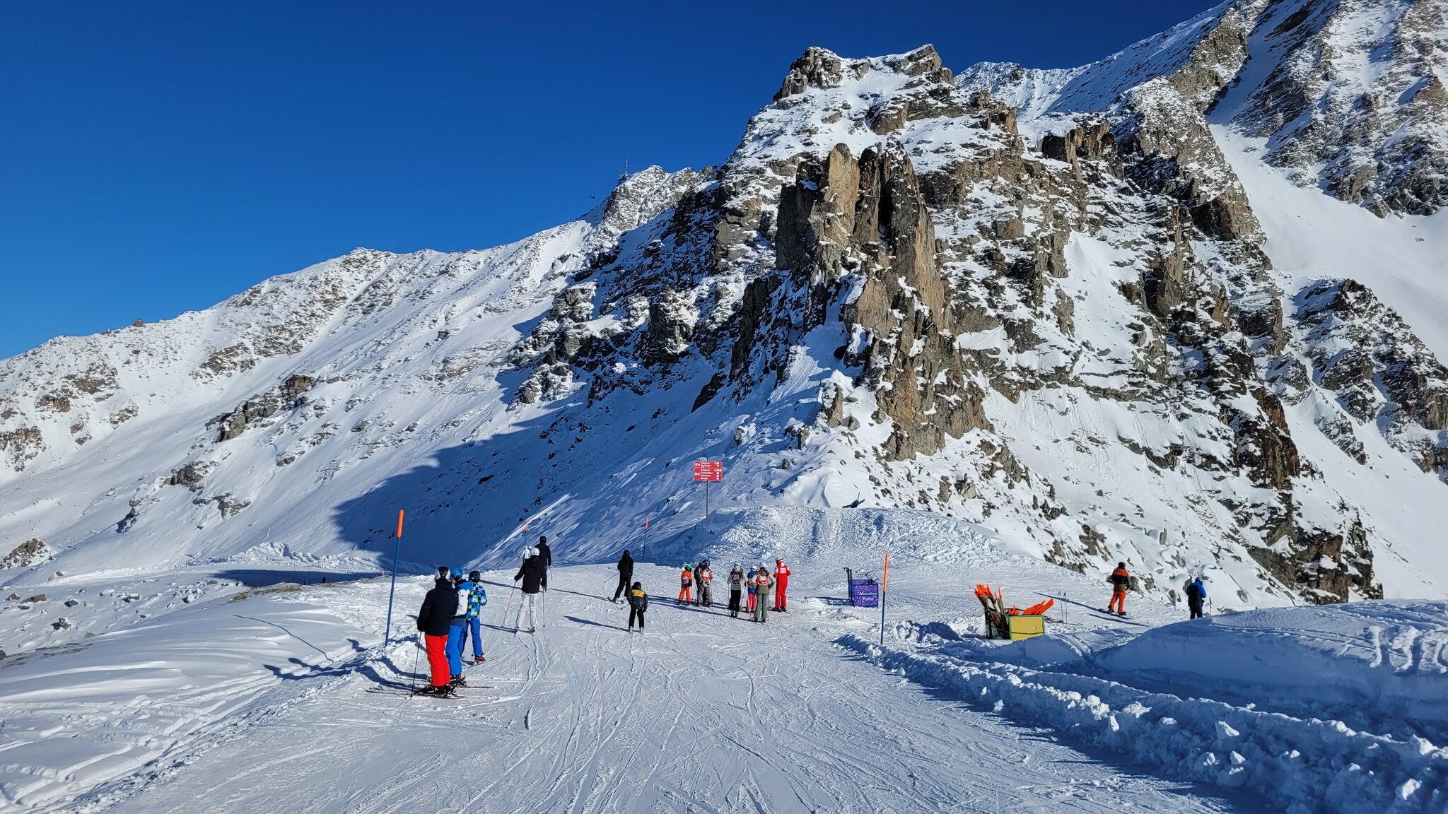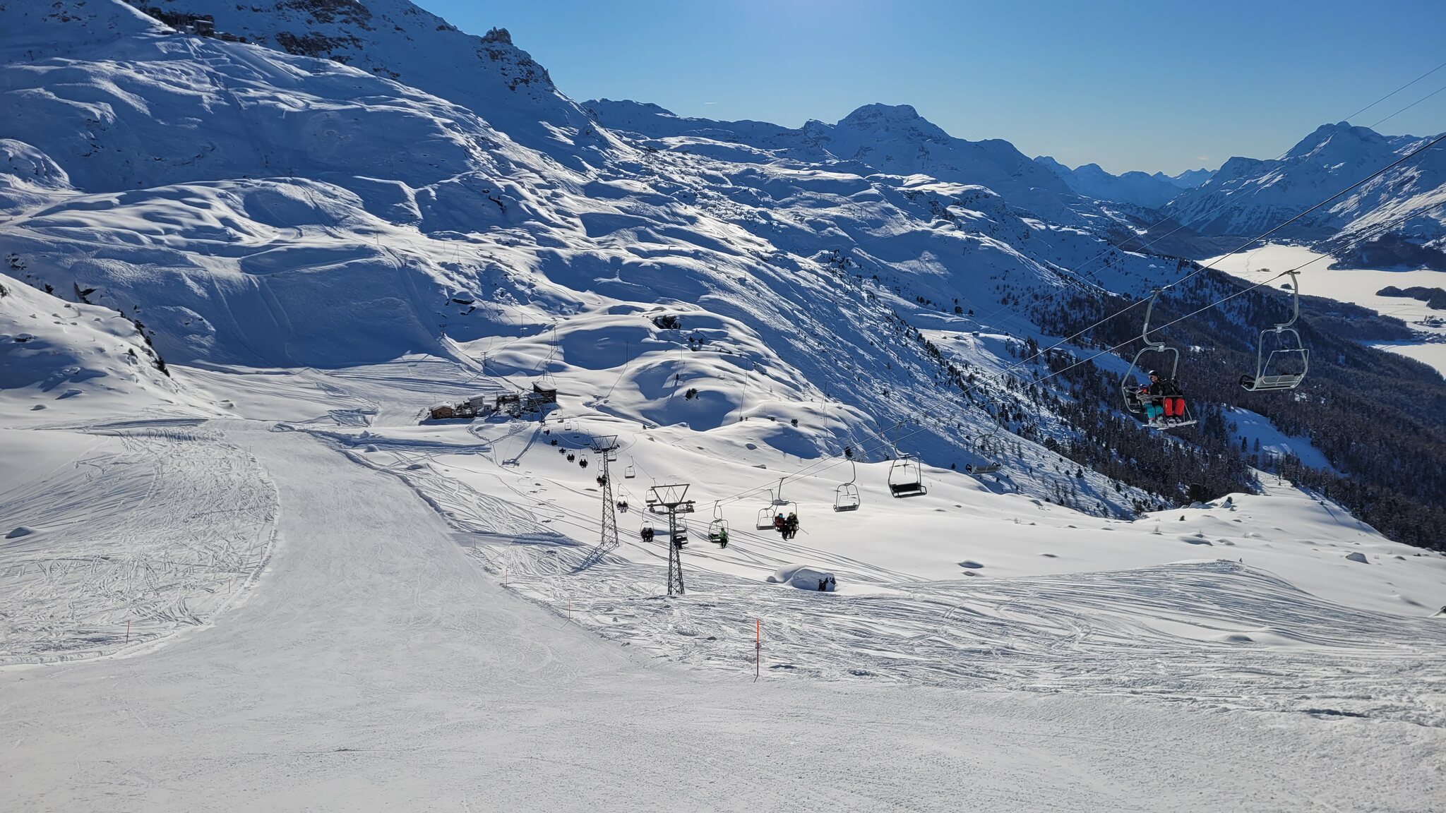 Man merkt, dass Hauptsaison ist. Es gab schon spürbare Warteschlangen, aber dank den Single Lines nirgendwo ein Problem. Auf den Pisten hat es sich aber gut verteilt, nur in Marguns das übliche Gewusel.