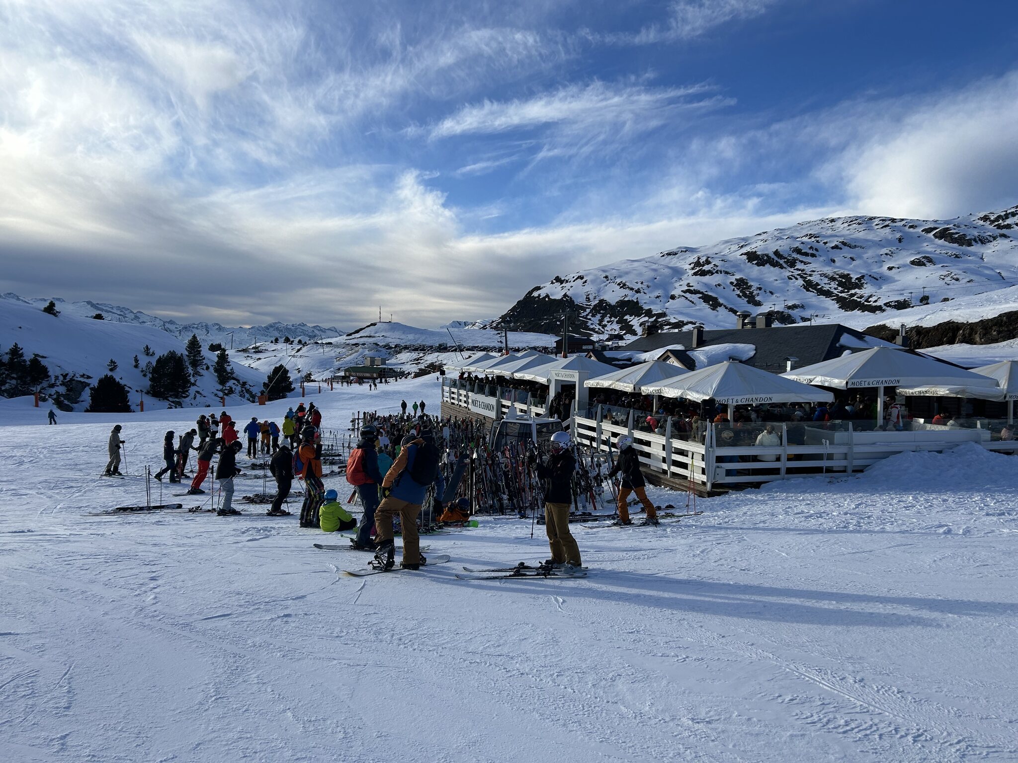 Ich fand es jetzt nicht so übermäßig teuer, Tagespass für 69€ war nicht sehr viel teurer als Formigal für 61€. In € pro Pisten-km hat man in Baqueira mehr geboten bekommen. Generell sind die Tageskarten in Spanien teurer als in Frankreich. Vom Essen her waren die Bocadillos und Kaffee-Preise in Baqueira und Formigal auch ziemlich gleich. Die Hotelpreise direkt in der Station sind schon teuer, ich habe aber immer enroute in Esterri d'Aneu gebucht, dort gibt es sehr günstige Hotels. Und man hat den perfekten Einstieg am Morgen an der Peülla KSB. Die Moët-Hütte ist natürlich Luxus, aber ich gehe in St Moritz auch nicht ins Paradiso.