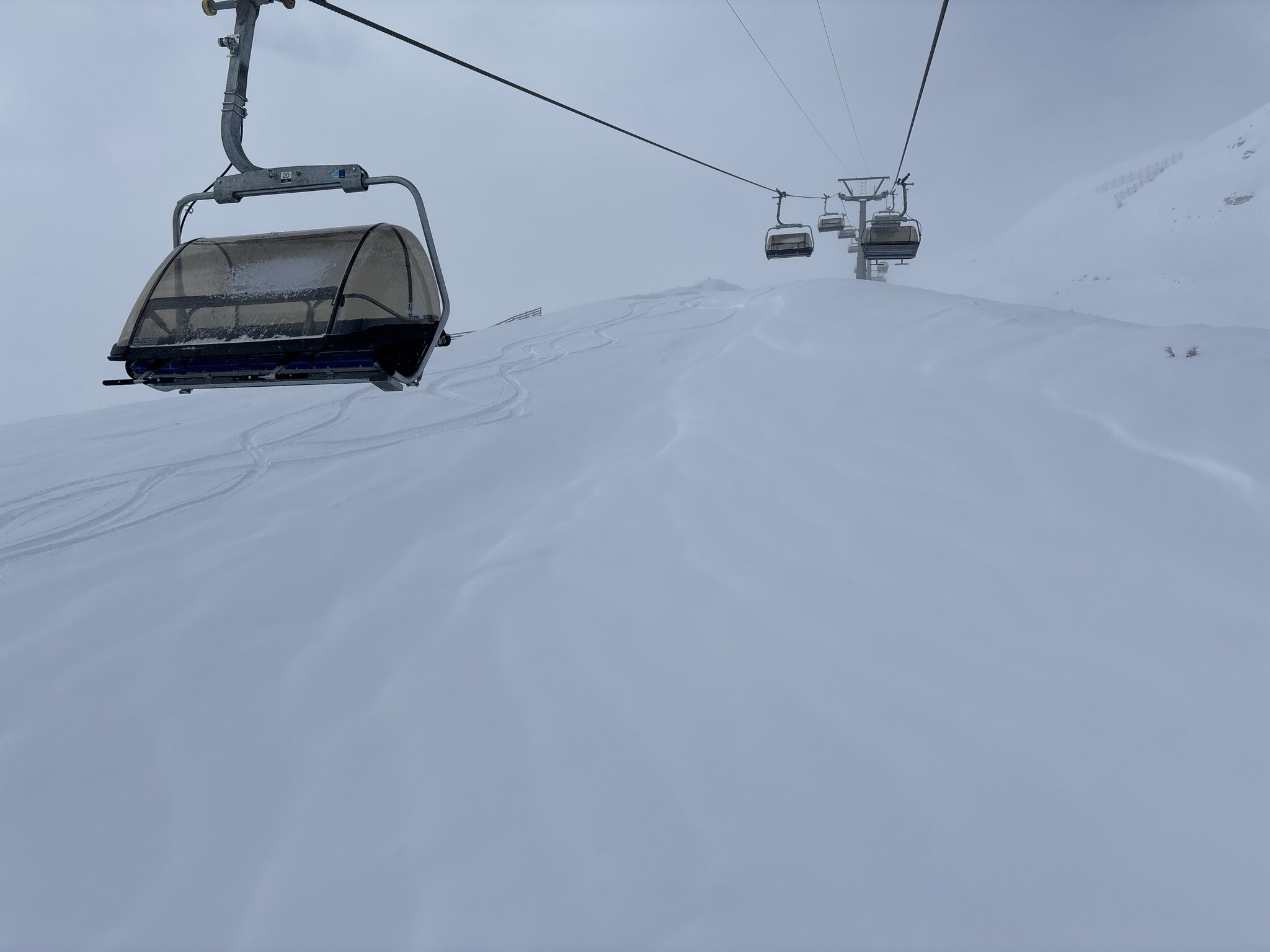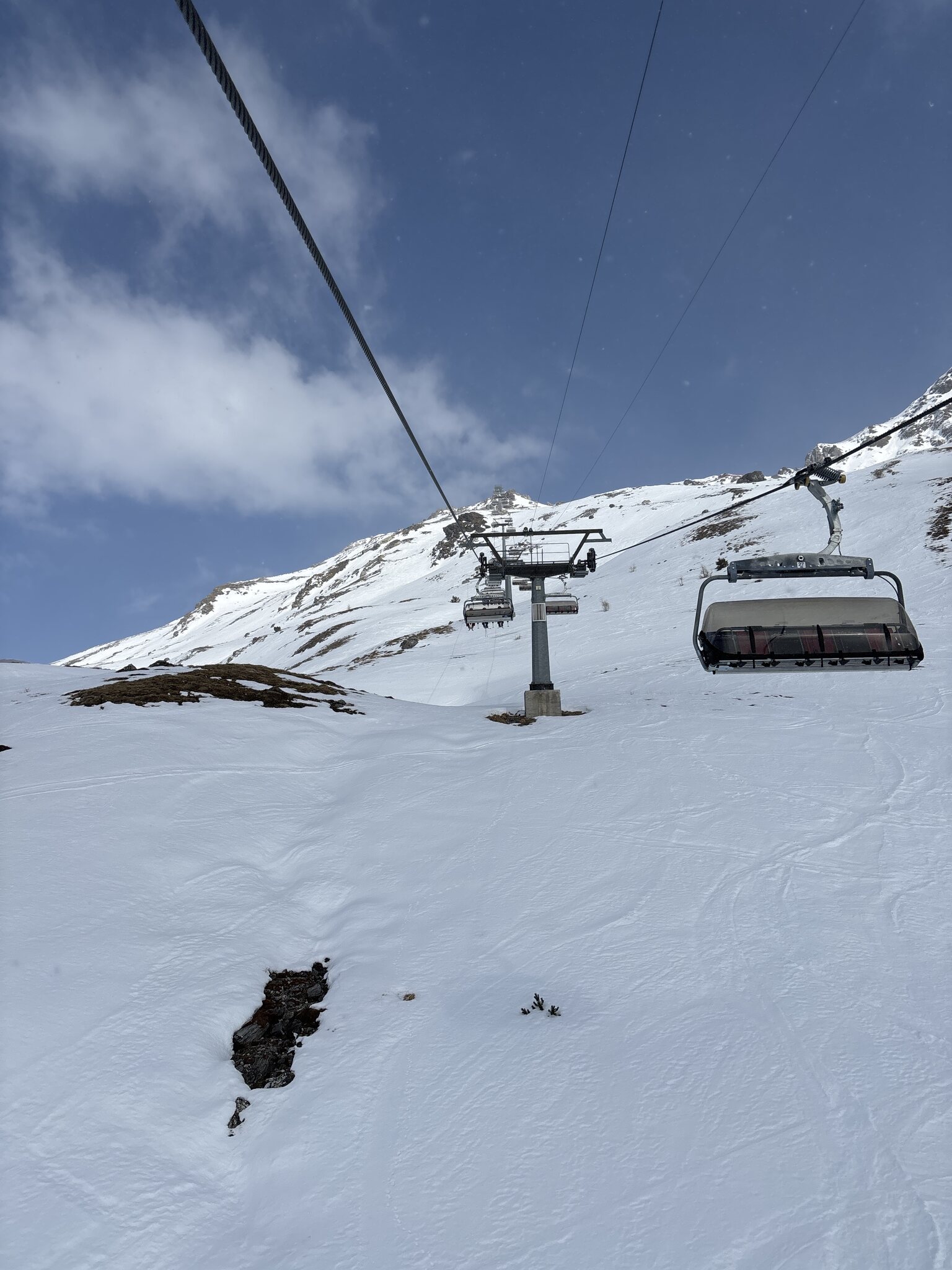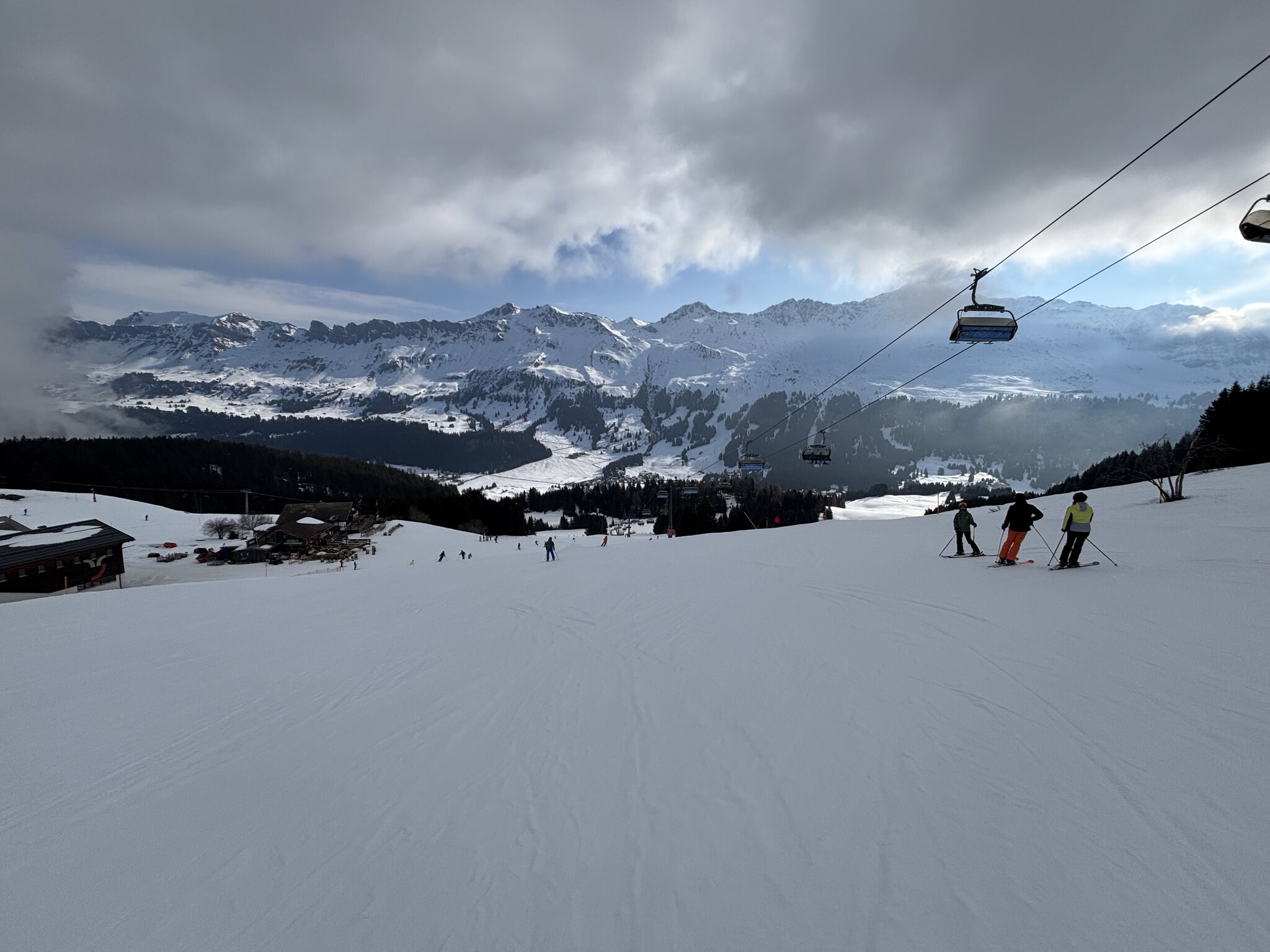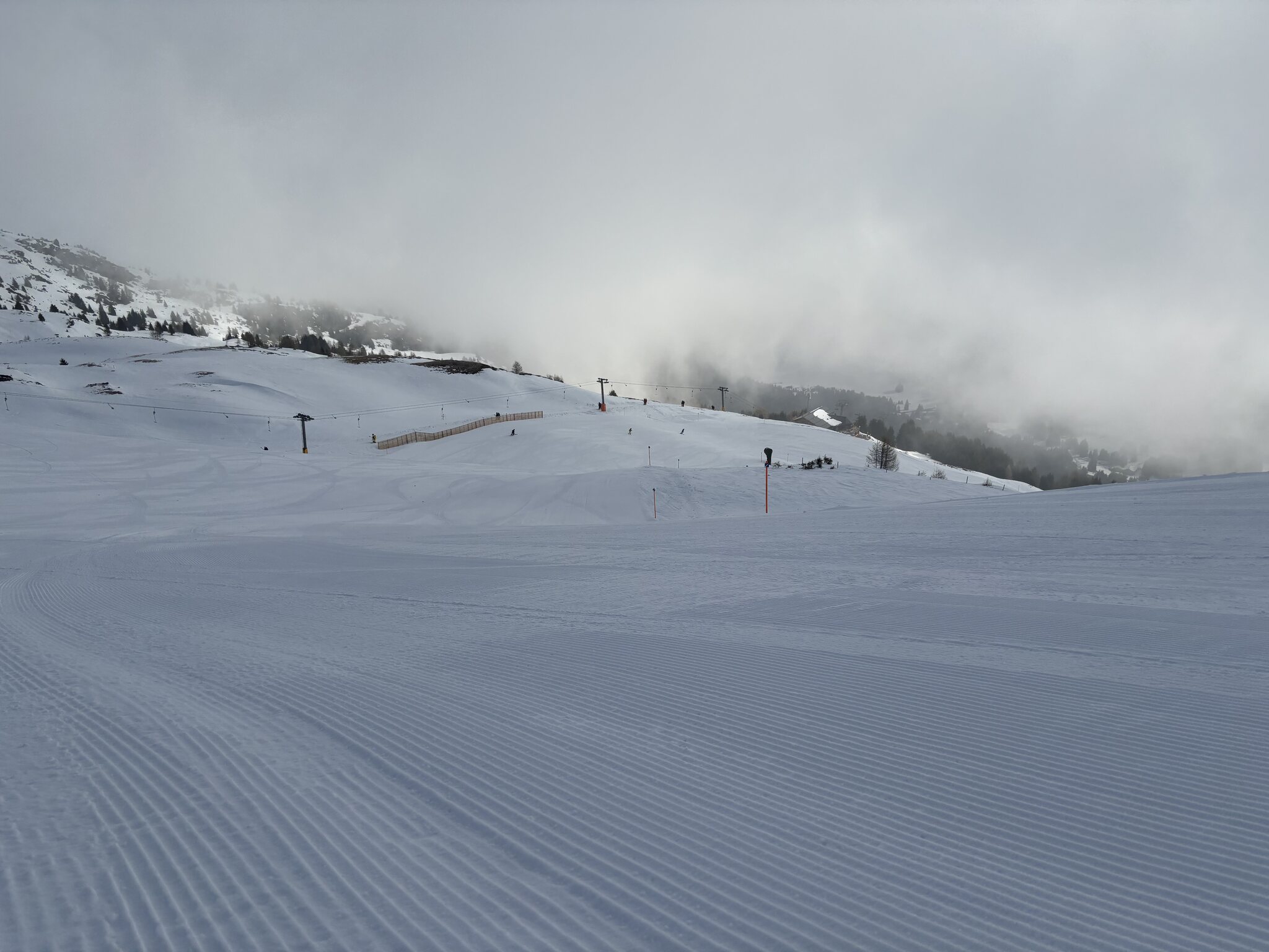 Einstieg heute Morgen wieder über Crestas, der Campingplatz Lift. Am Tgangieni noch kein Andrang. Das Wetter macht sich.