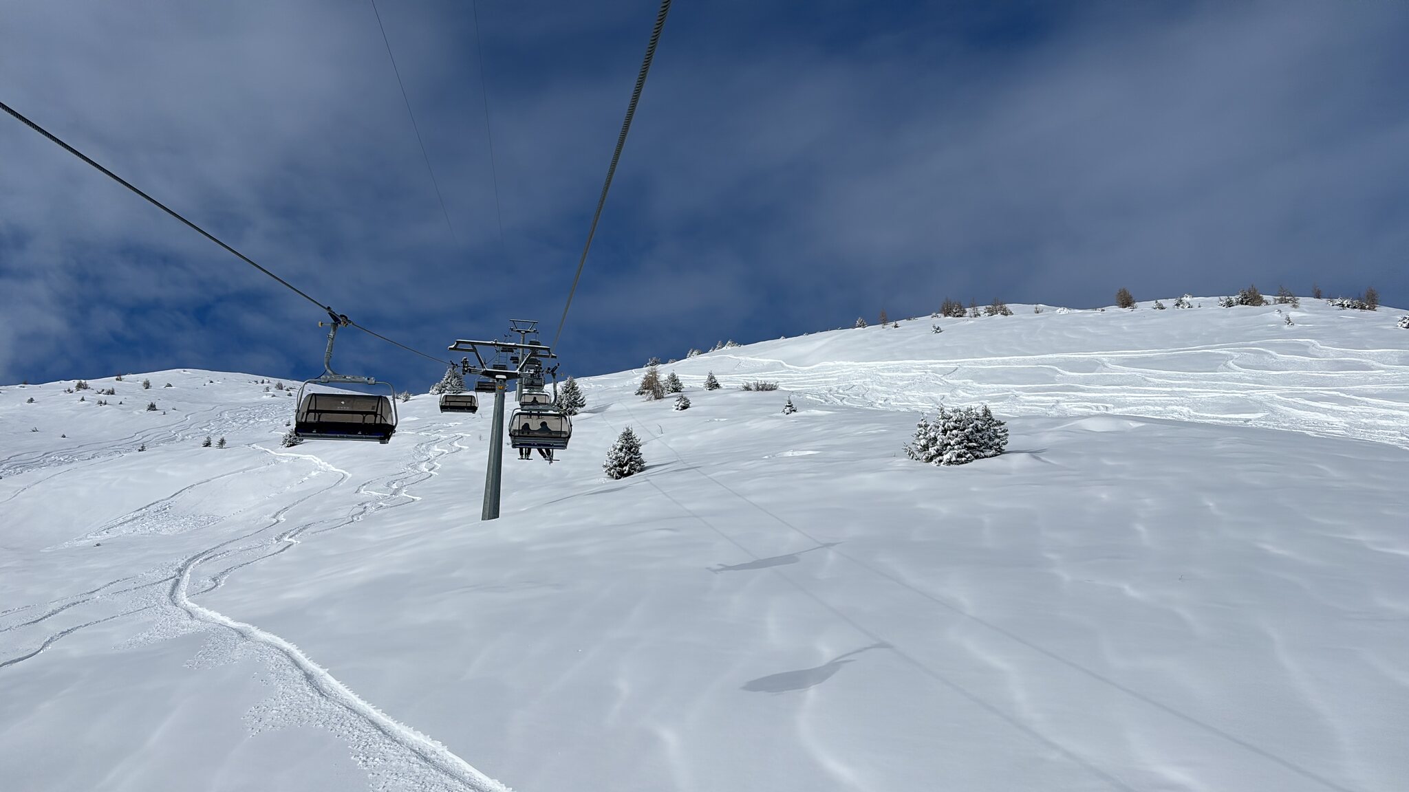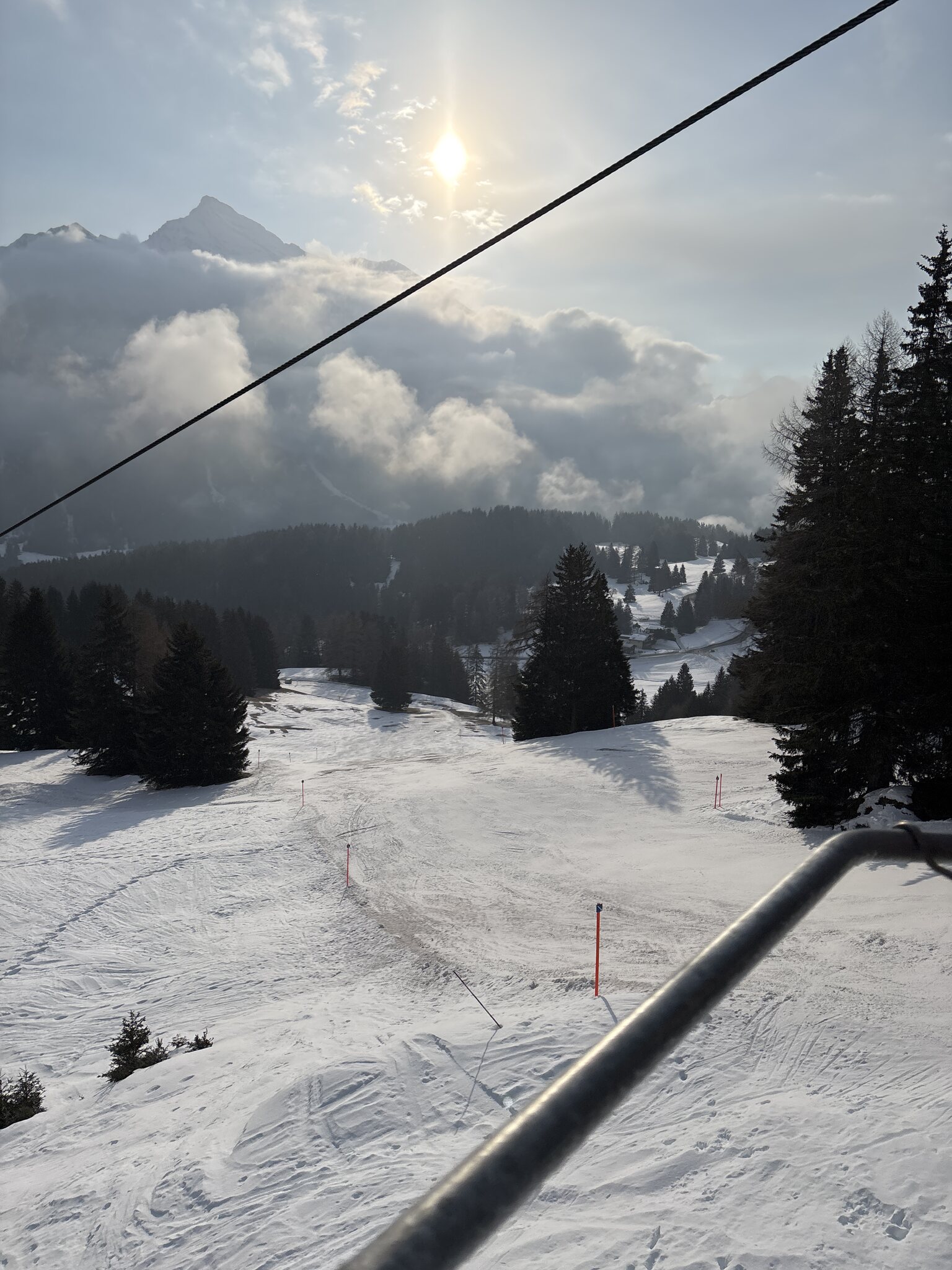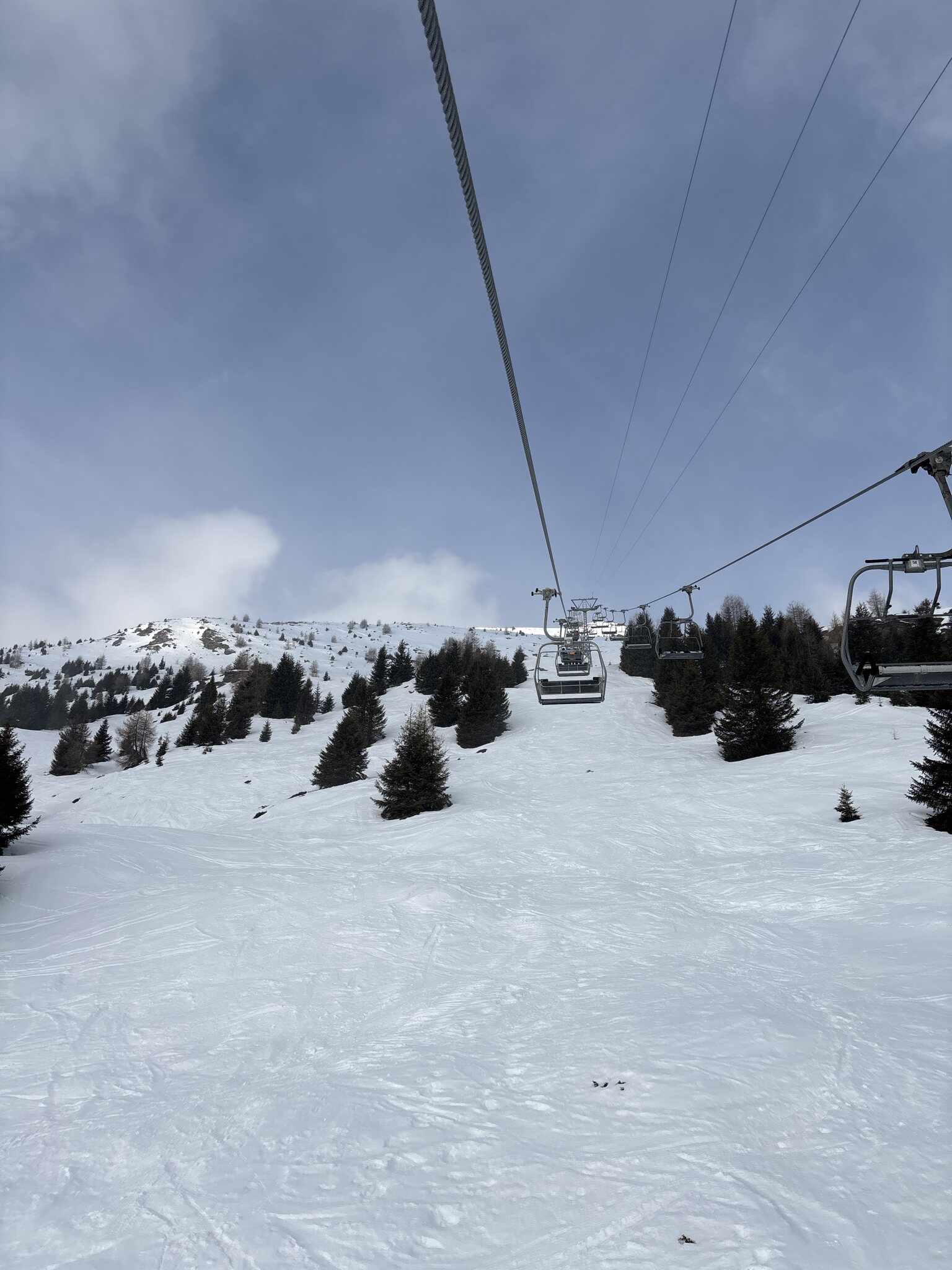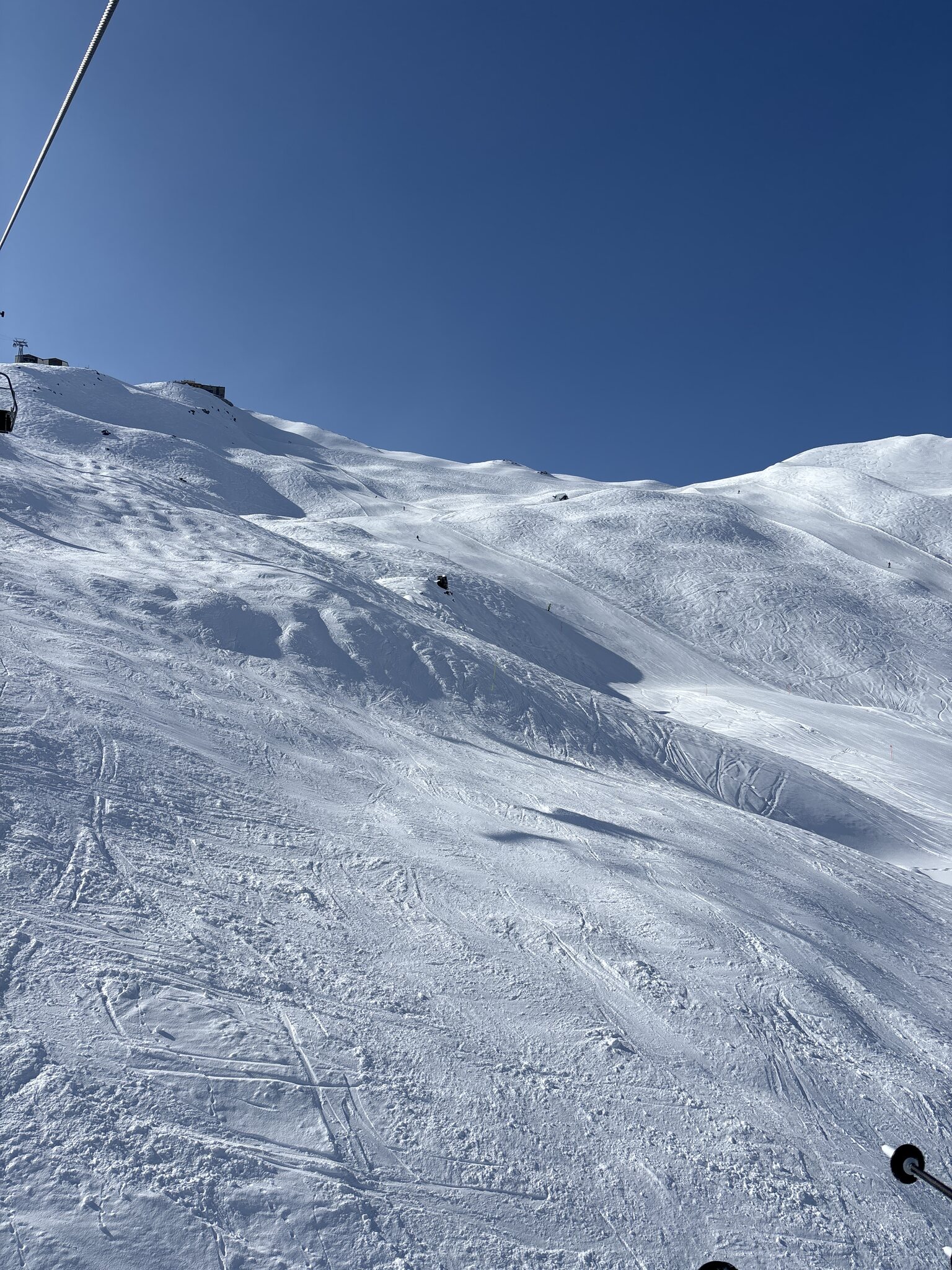 Bereits ab der 3. Fahrt hatte es einige Leute am Sessel. Wir gingen dann zum Abendessen. Nachher oben weiterhin gut fahrbar, ab der Mitte aber doch viele holprige Eisfelder.