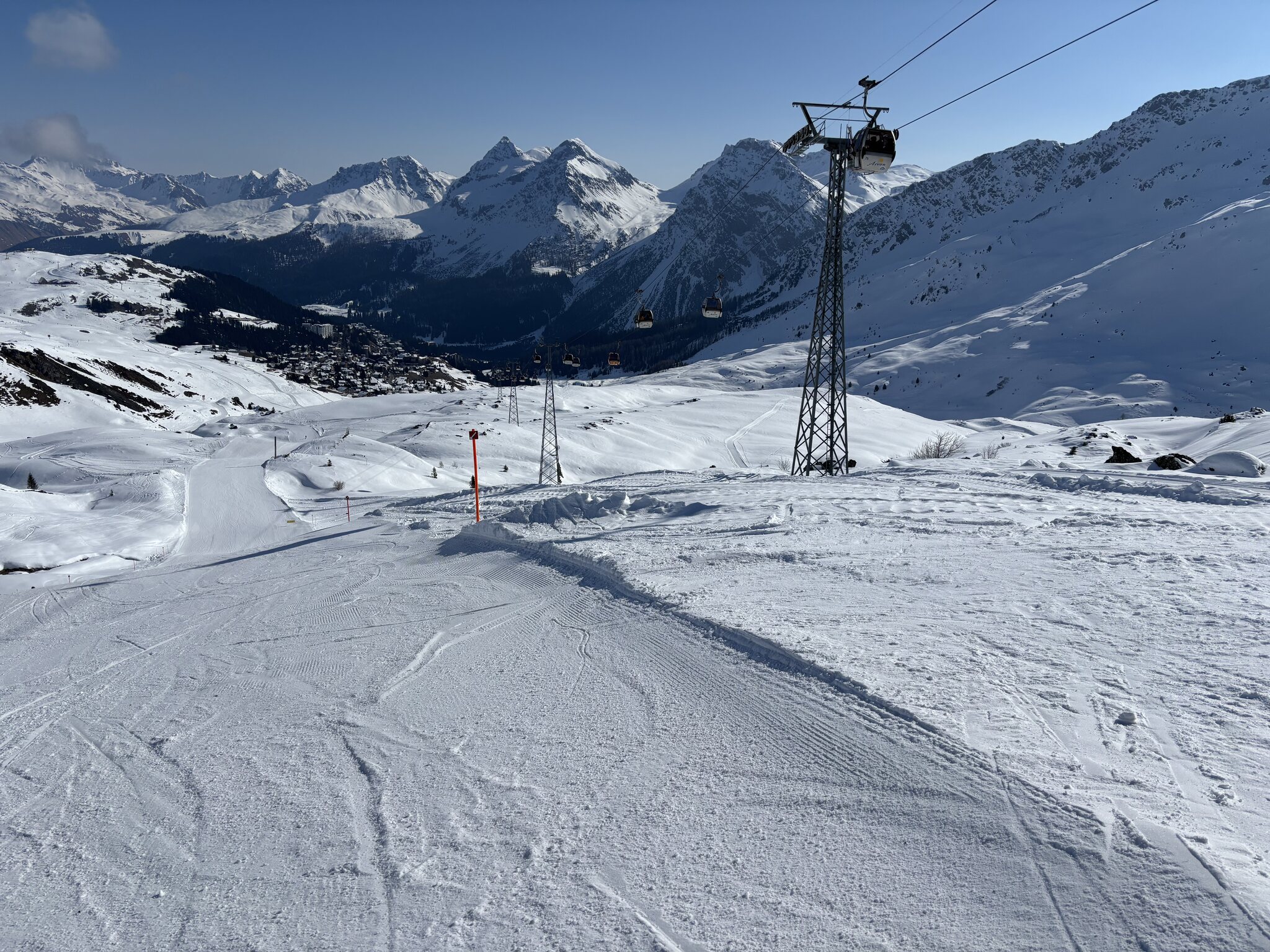 Die 2 zum Hörnliexpress wie üblich leer. Auch auf Arosa die Pisten griffig hart. Am Hörnliexpress keine Wartezeit um 10:30 Uhr. Mal wieder das typische Arosa Problem - Pisten leer warten am Lift. Wenn wir schon in Arosa sind muss es auch einmal die Black Diamond sein. Wie alle anderen Pisten bisher auch ist sie griffig hart und nur am Steilhang verrutscht. Die 10 am Weisshornspeed super und die Anzahl Skifahrer auf der Piste ist überschaubar. 13:50 Uhr im Hörnliexpress, es geht wieder zurück nach Lenzerheide. Über Mittag haben wir am Weisshornspeed 3 Mal die 10 gefahren einmal die 9 und einmal die 8. Da kaum Betrieb am Hörnli Sessel nehmen wir noch die schwarze 3 mit die auch noch gut zu fahren war. 14:30 Uhr auf Lenzerheide Ost ist voll die winterliche Stimmung, es schneit dazu scheint aber auch noch die Sonne. Auch Urdenfürggli ist noch top zu fahren. Darum nehmen wir auch noch einmal Weisshornspeed mit. Übers Stätzerhorn geht es zurück Richtung Gravas. Auch die Querpiste lies sich noch sehr gut fahren. Als wir um 15:30 im Bus sitzen haben wir 61 km und 11177 hm gemacht. War ein toller Tag, 9,5 Punkte.