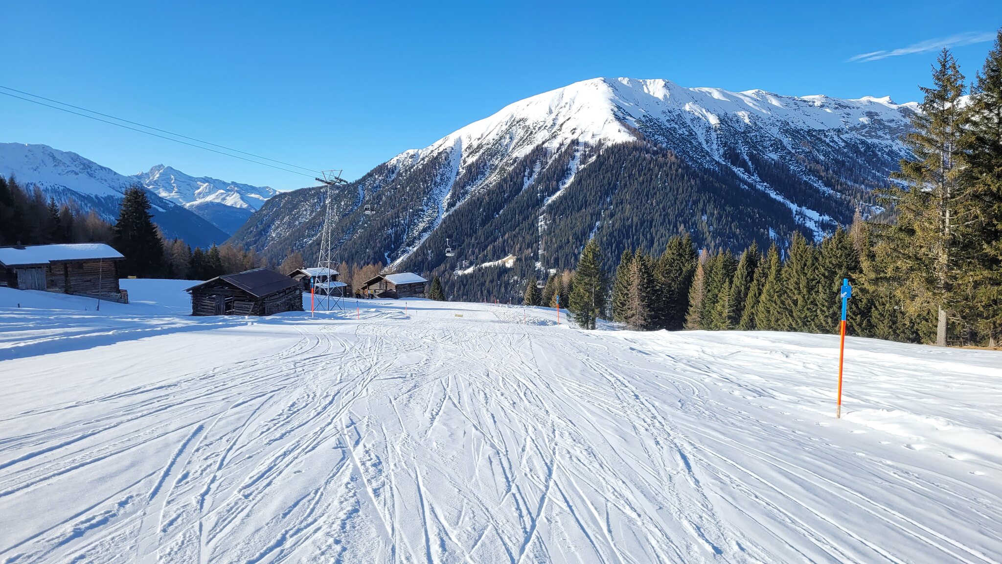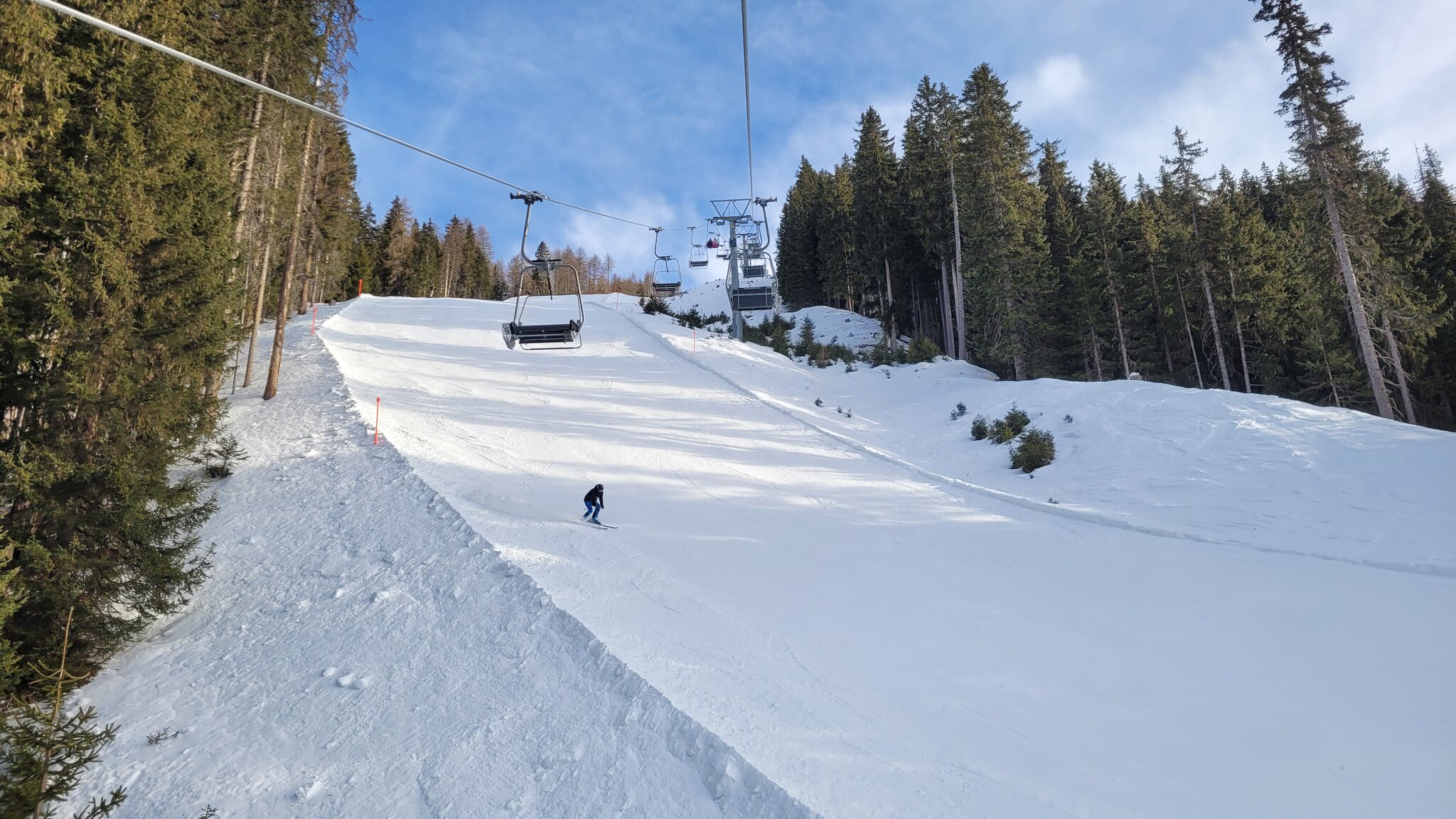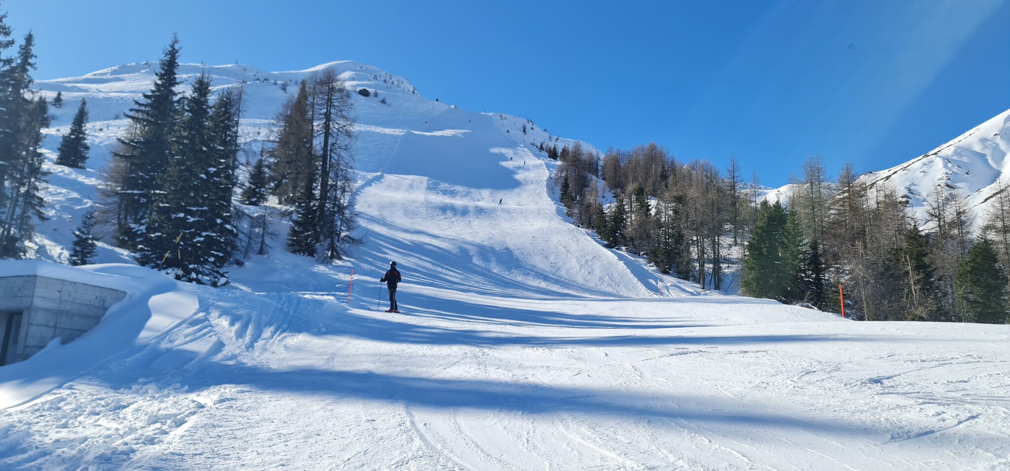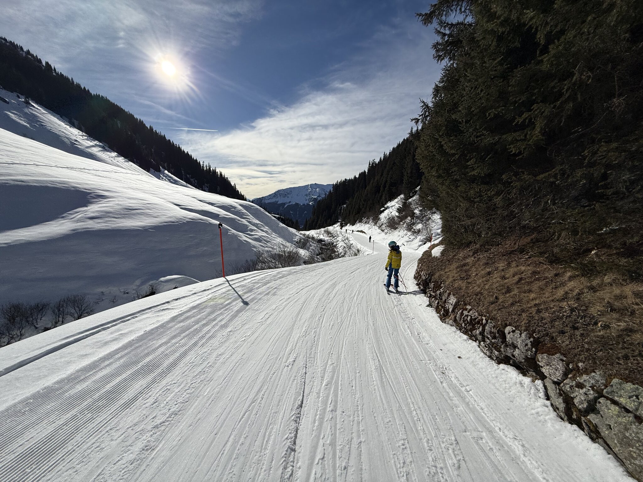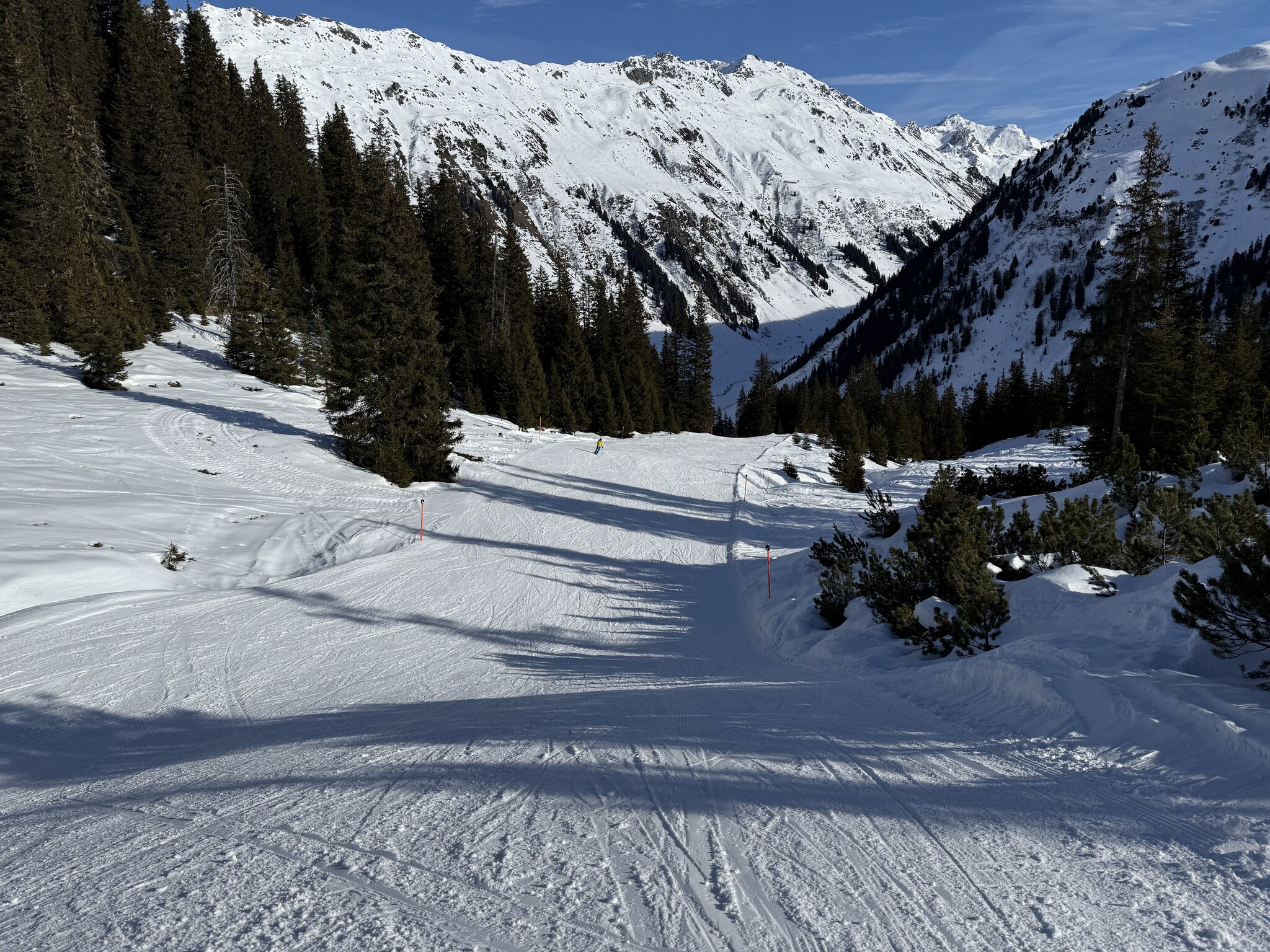 Die Talabfahrt-Variante Piste 2 ist auch gut, und mittlerweile ist es sehr sonnig: