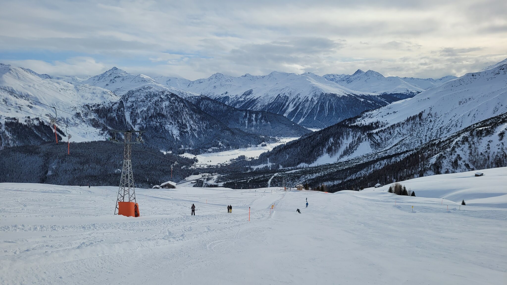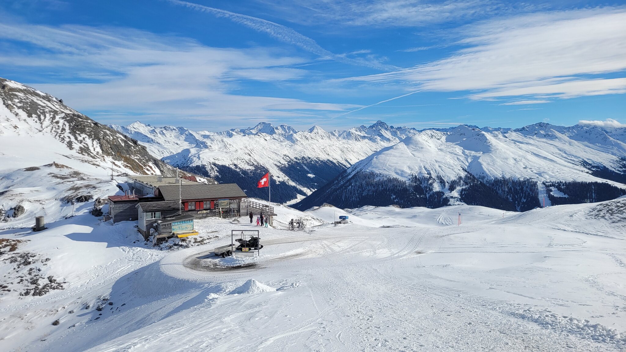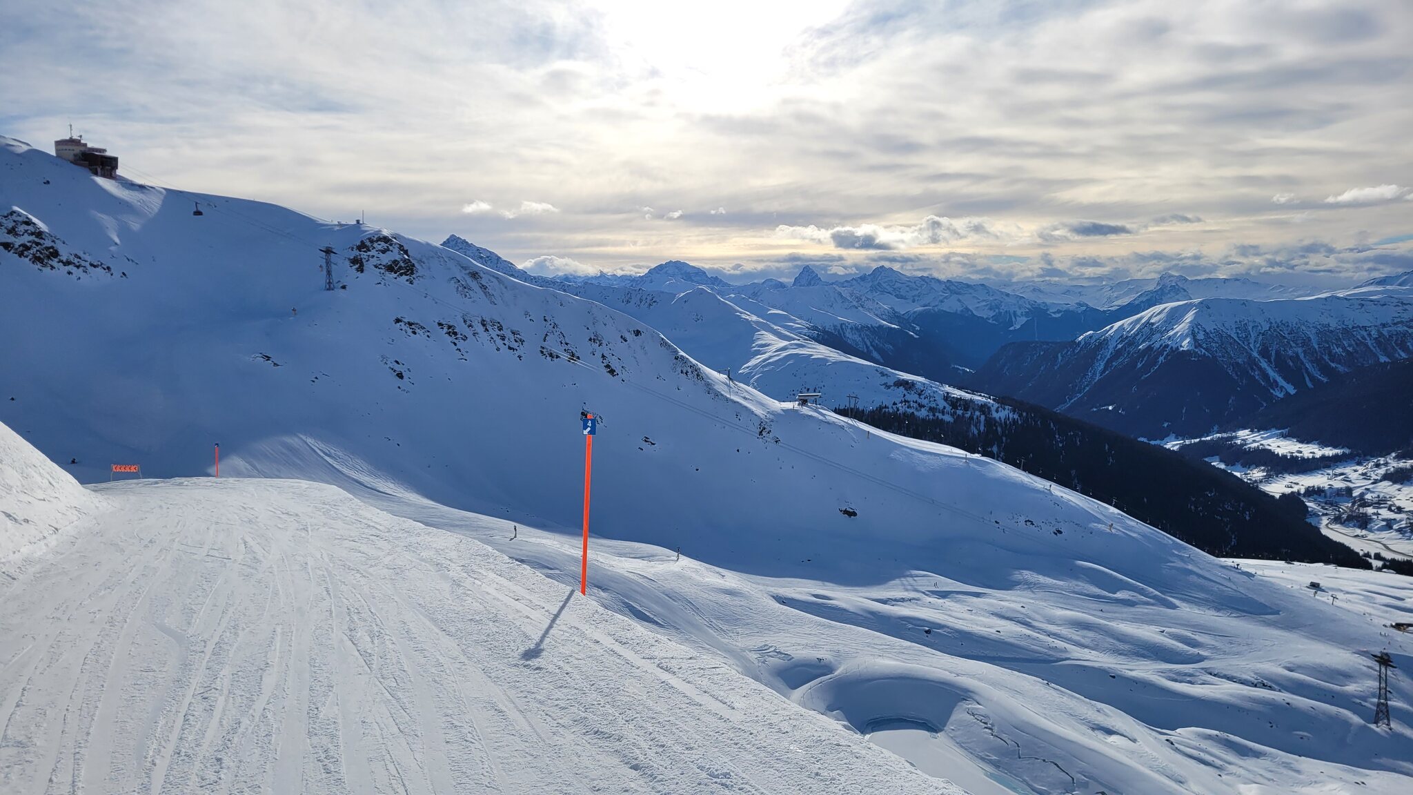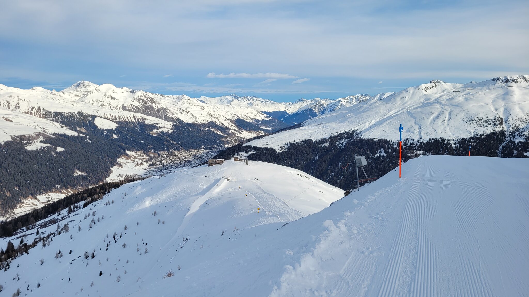 Heute Start in Davos am Rinerhorn nach der WEF-Zwangspause. Auf der Strasse gab es auch "M-Tours"-Abreiseverkehr zu sehen. Am morgen wie erwartet sehr leer. Am Nüllisch habe ich definitiv die erste Spur auf Piste 9 gesetzt. Die Piste ist nicht ganz perfekt mit punktuell eingearbeitetem Pistengemüse. Die Talabfahrt ist aber tip top.