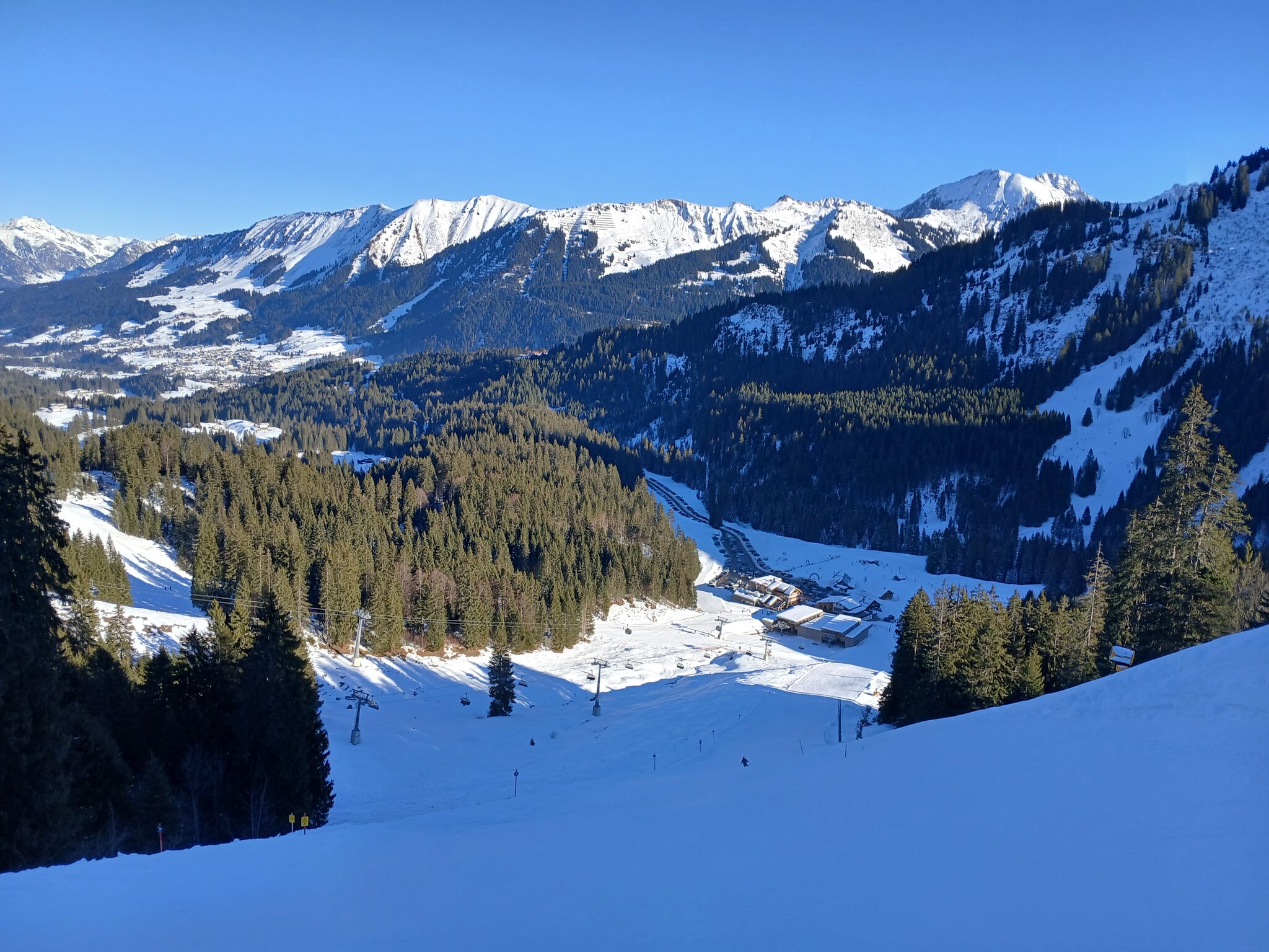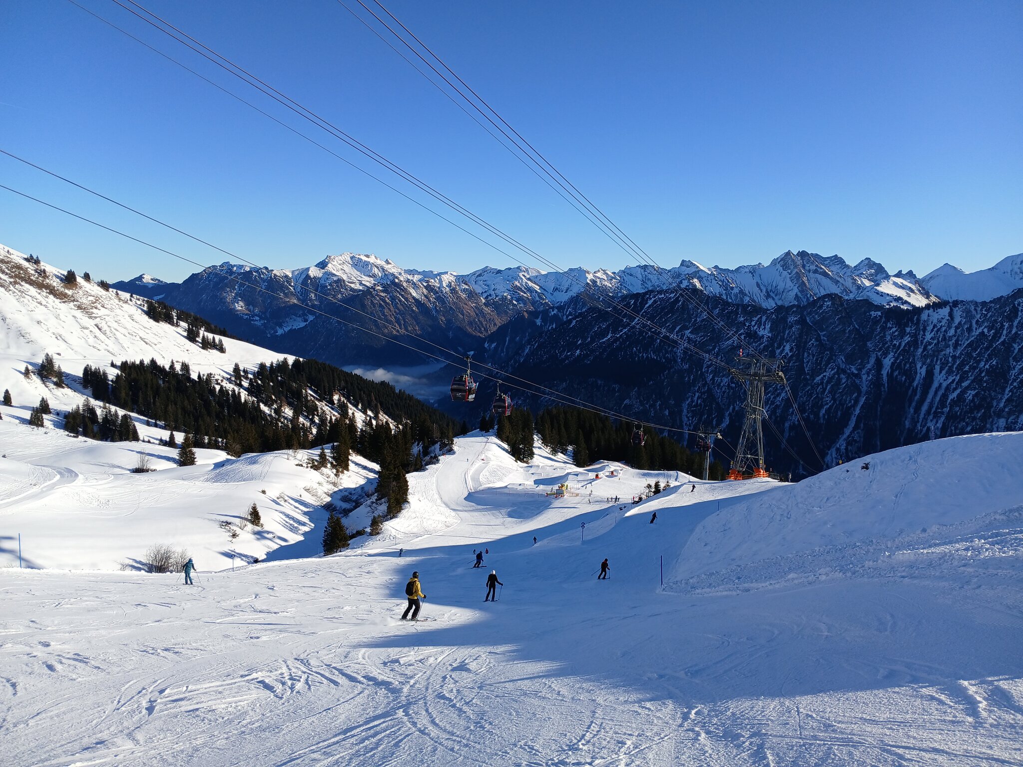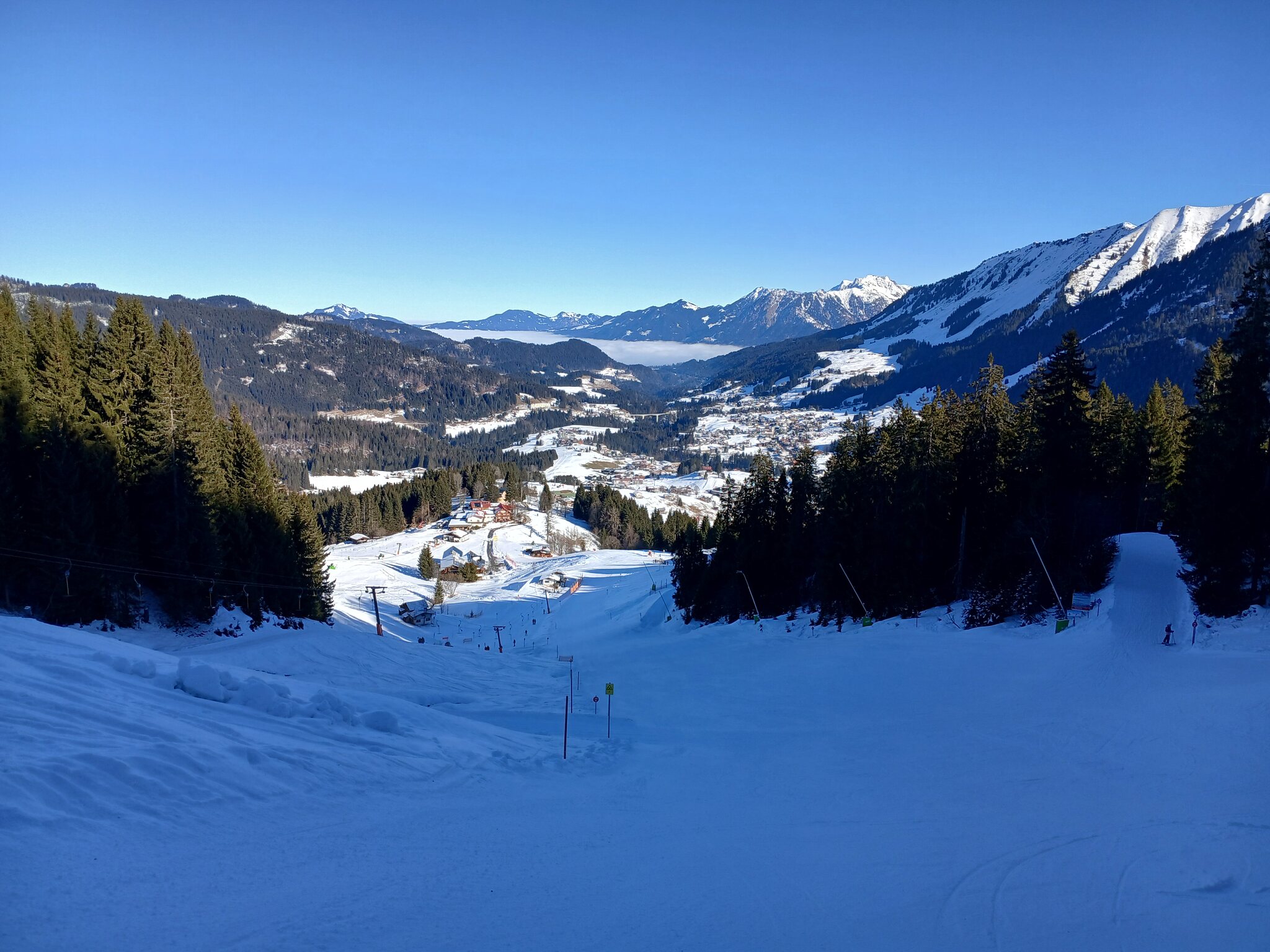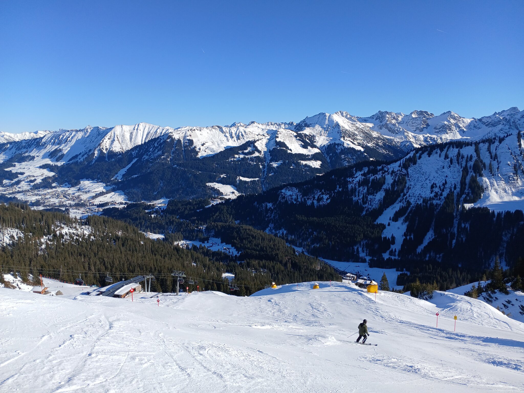 Am Morgen parkte ich mein Auto am Ifen, fuhr mit dem ersten Bus der Linie 5 zur Kanzelwandbahn und fuhr dann ab dort die Skigebiete in der vorgenannten Reihenfolge ab.